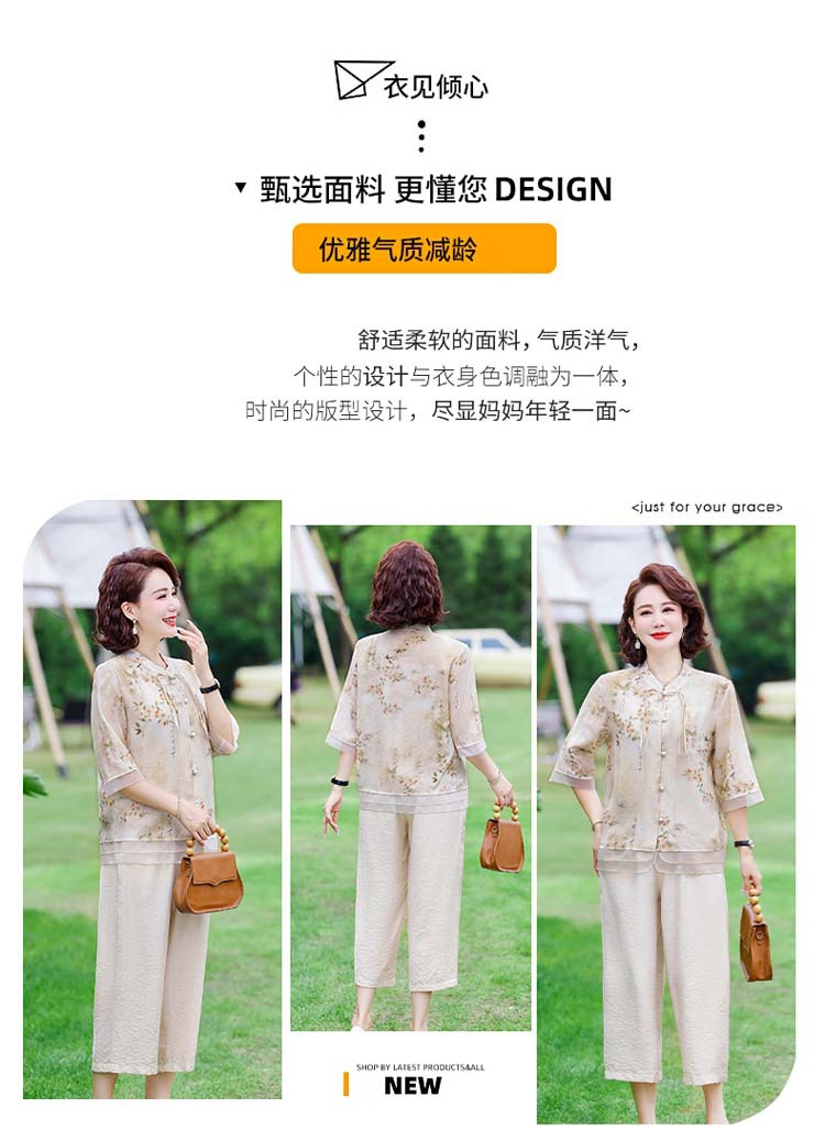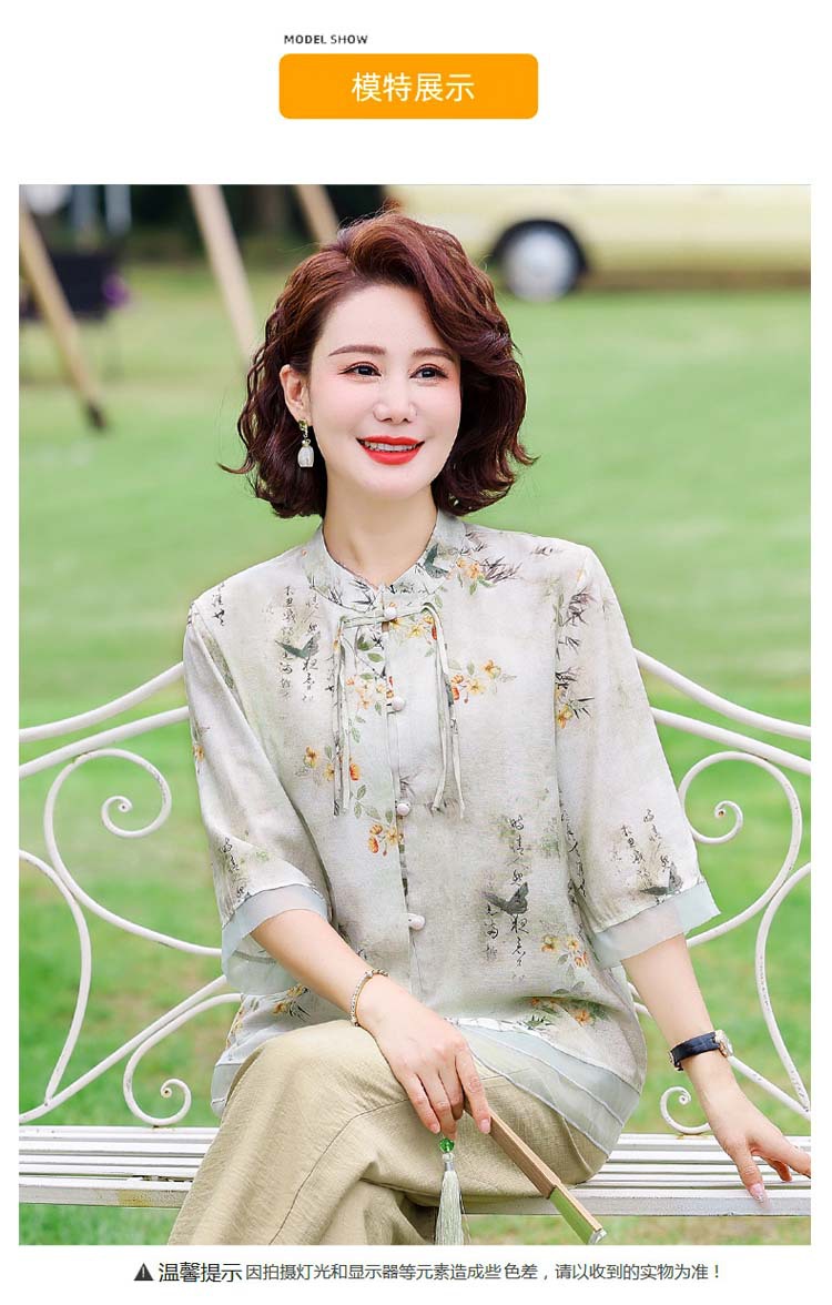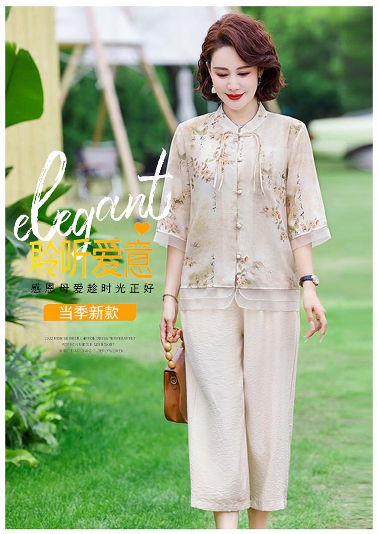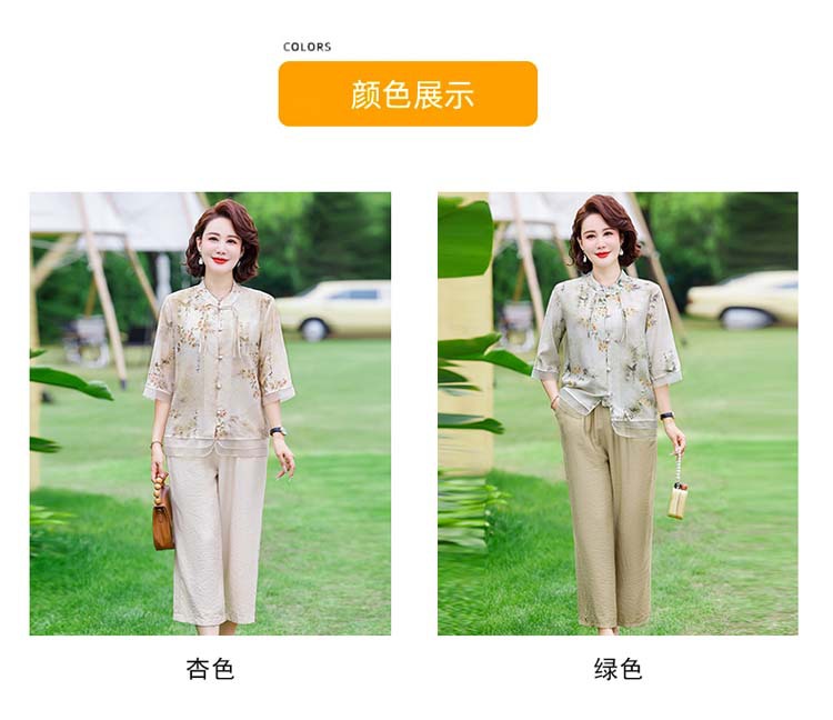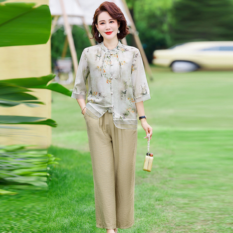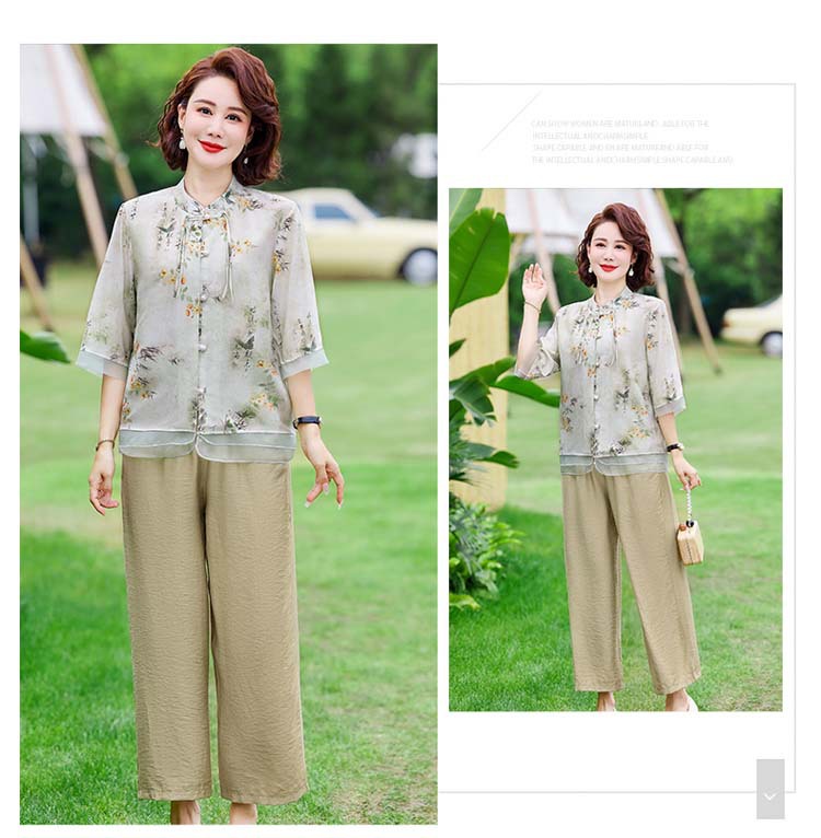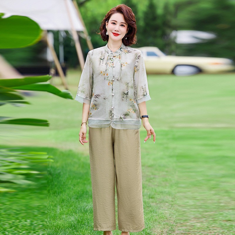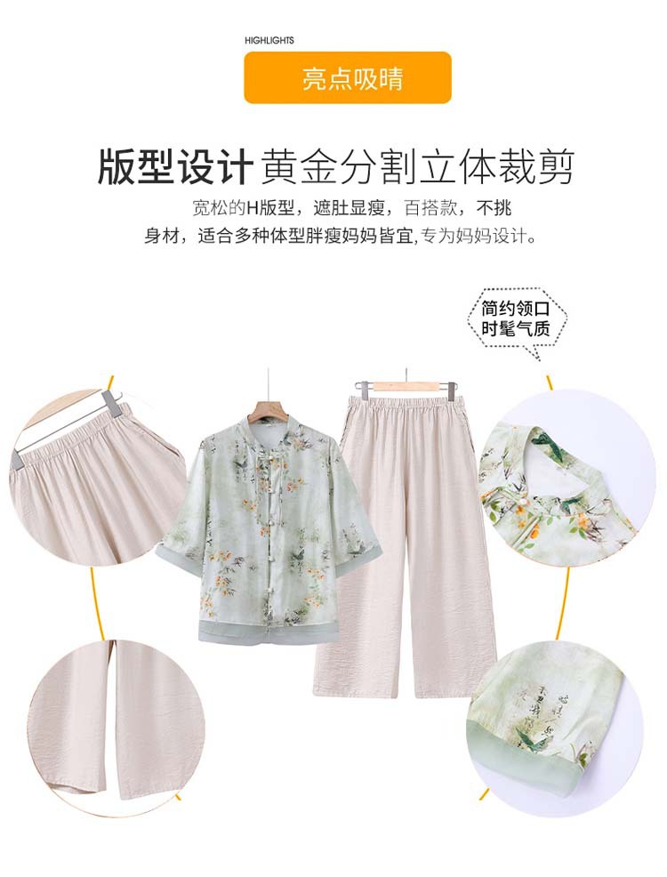 중년 및 노인 여성의 여름 중국 스타일의 국가 스타일 미드 슬리브 셔츠를위한 중년 어머니의 면화 린넨 탑 세트 서양식 투피스 세트스토어 가기