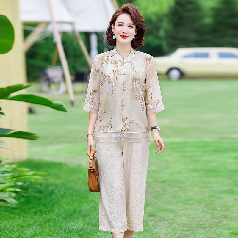 중년 및 노인 여성의 여름 중국 스타일의 국가 스타일 미드 슬리브 셔츠를위한 중년 어머니의 면화 린넨 탑 세트 서양식 투피스 세트