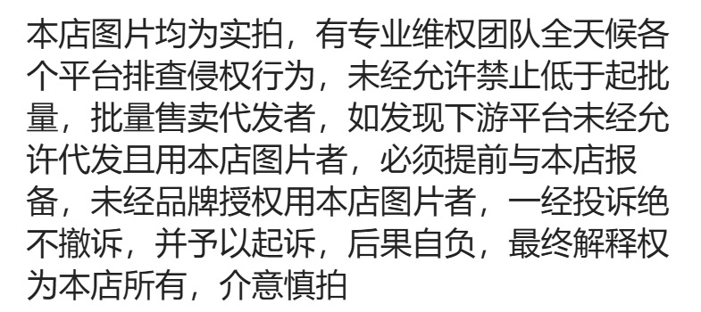 未经品牌方授权 在其他平台销售,侵权行为会导致品牌方投诉至处罚与罚款,被投诉店铺或起诉到个人及店铺 所以请按照规定售卖件数采购 不然发现破价,为记录在案的店铺,知识产权投诉绝不撤诉,起诉到底索要赔偿