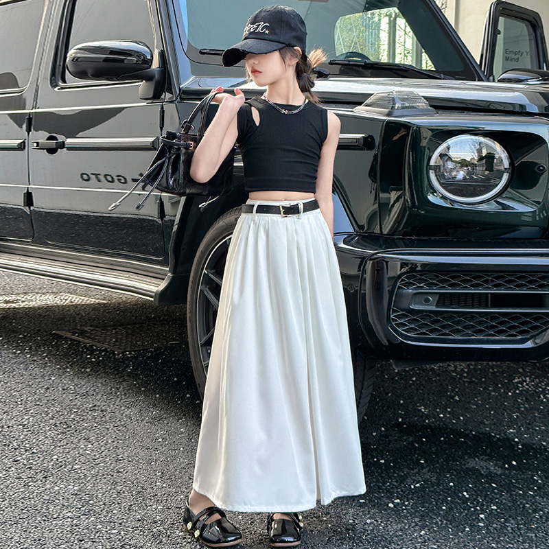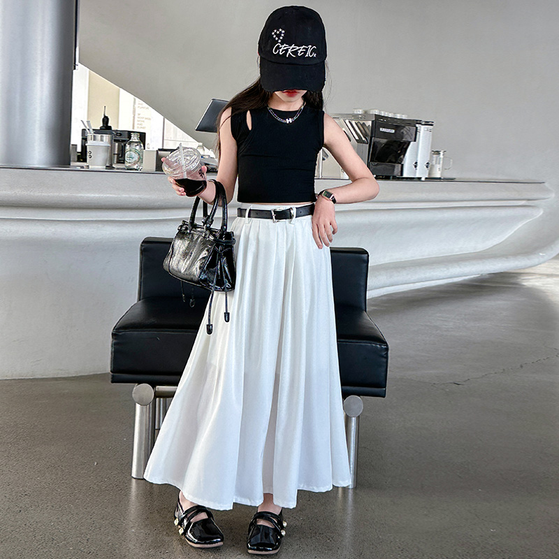 소녀의 여름 패션 흰 치마 어린이 세련된 높은 허리 우산 스커트 무릎 긴 치마 큰 어린이 치마 세트