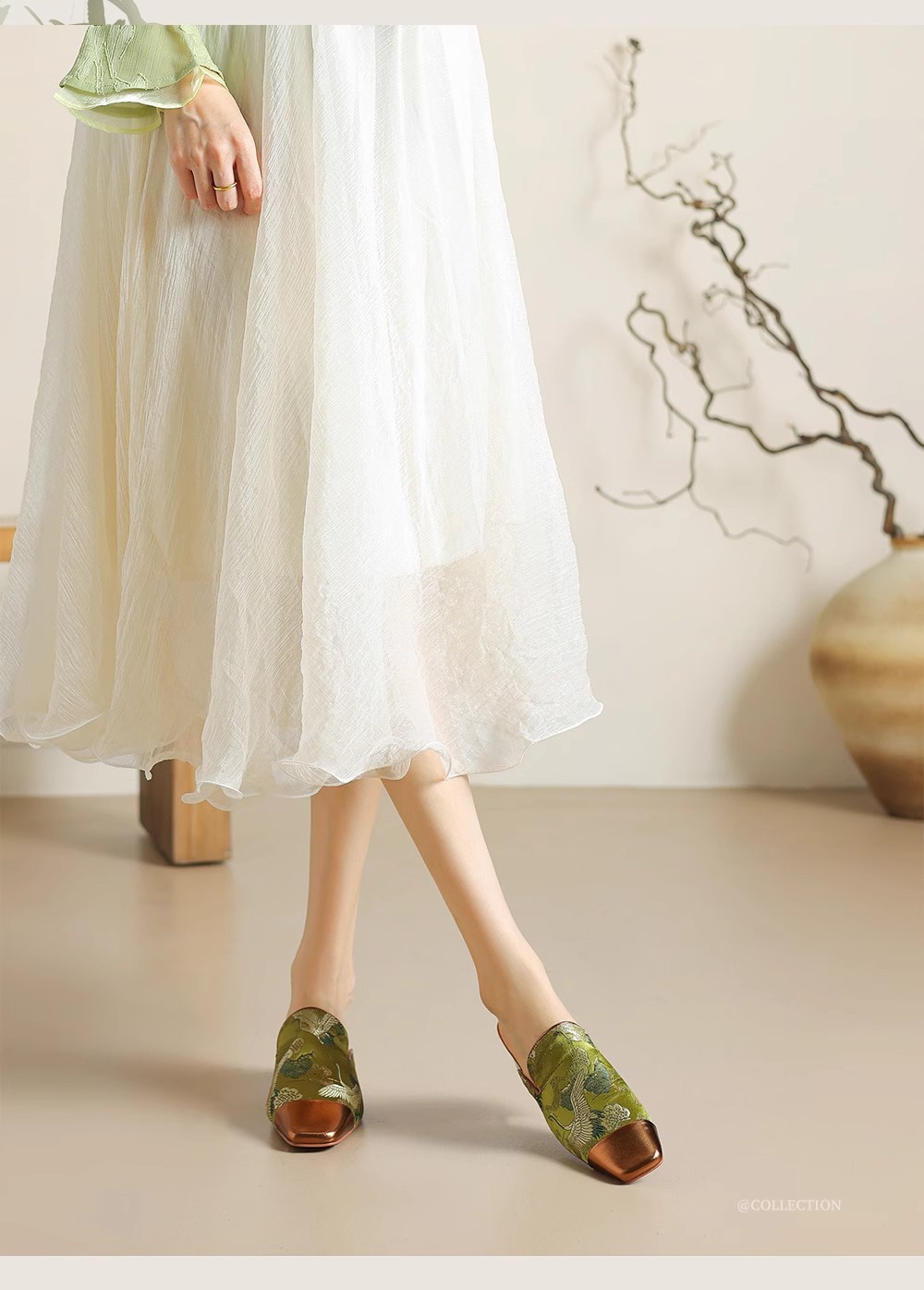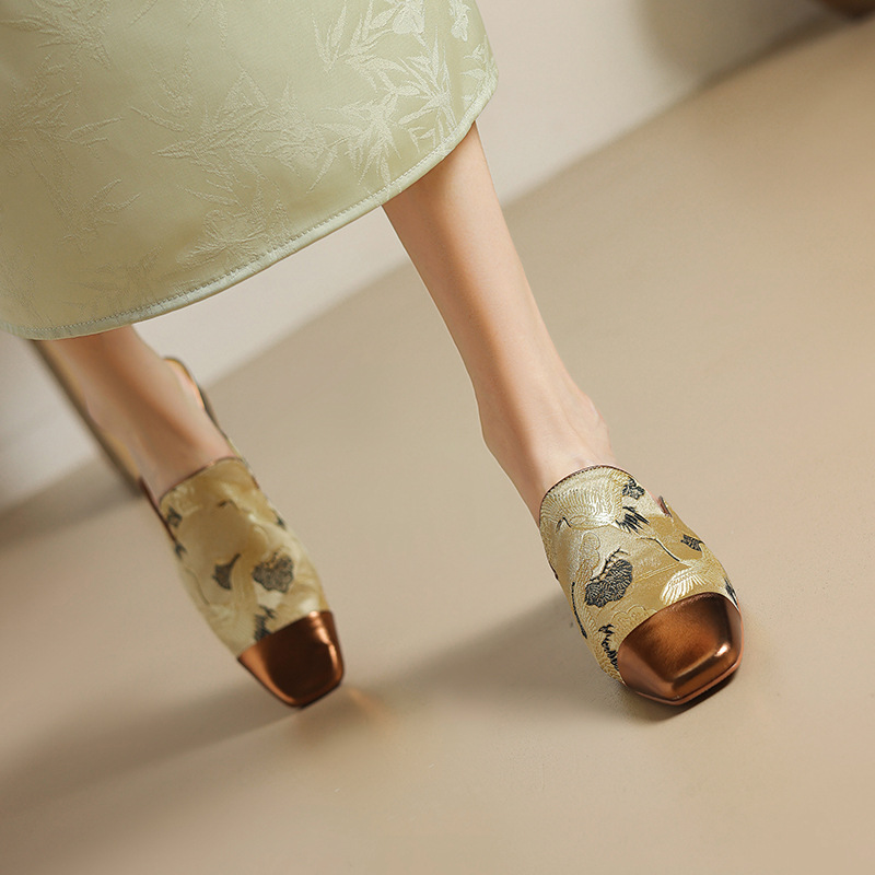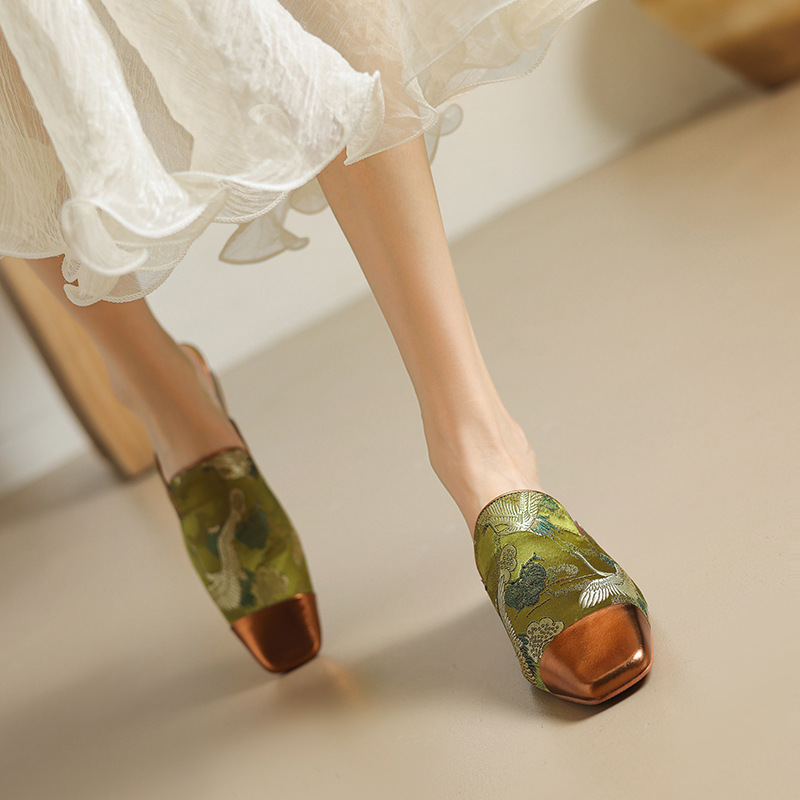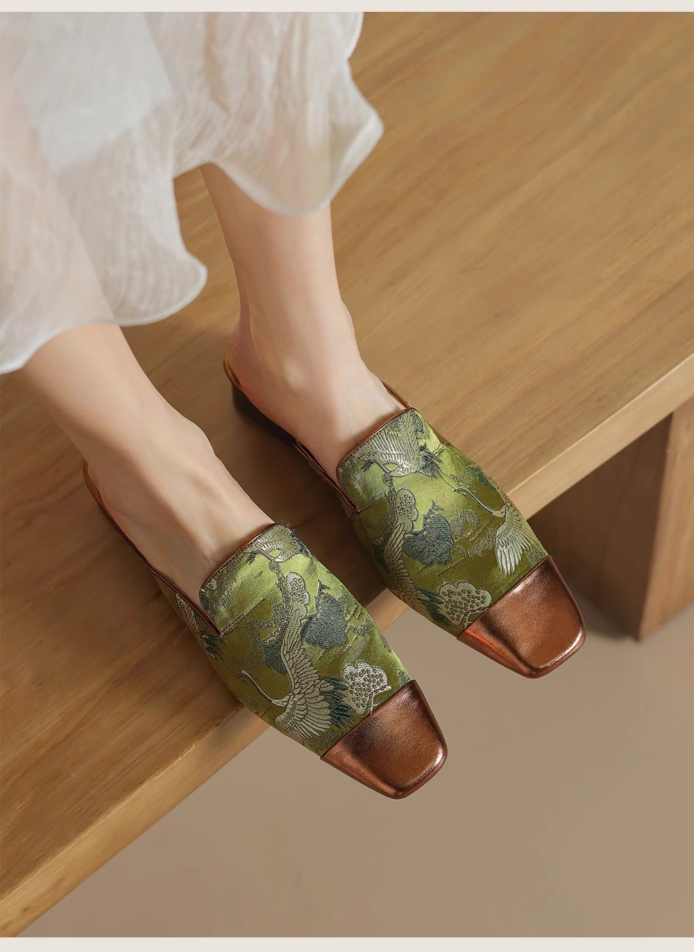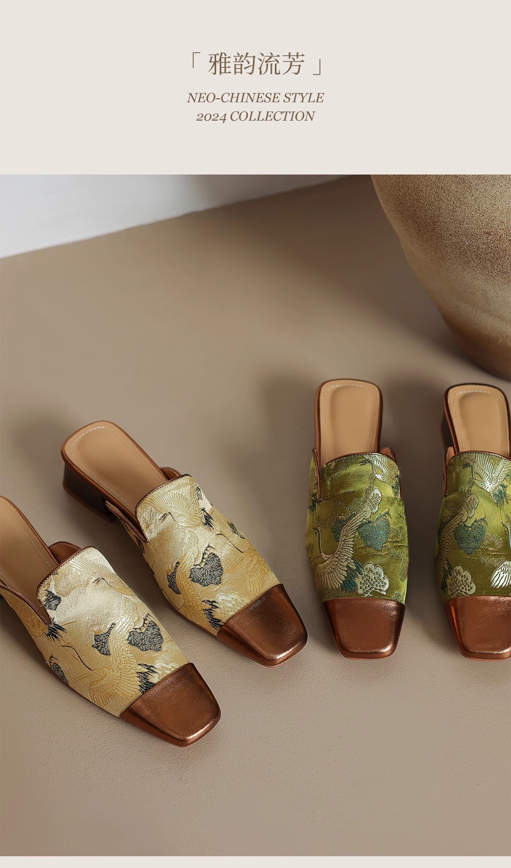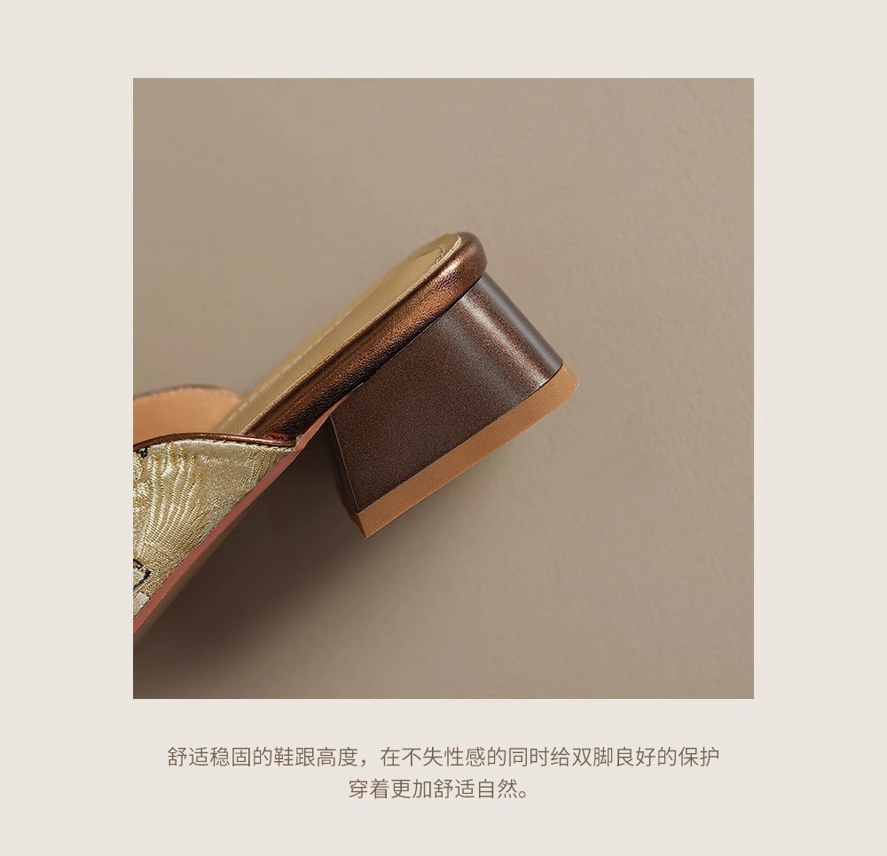 2024 여름 뜨거운 판매 중국 스타일 국가 스타일 Baotou 하프 슬리퍼 여성 자수 두꺼운 힐 하이 힐 로우 힐 컬러 블록 여성 신발