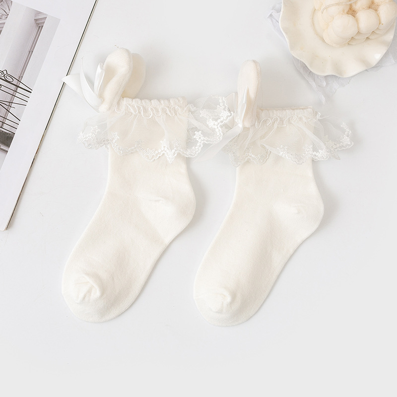 봄과 가을 달콤한 레이스 리본 여성 양말 단색 귀여운 입체 토끼 귀 로리타 아카데미 스타일 중간 길이 양말
