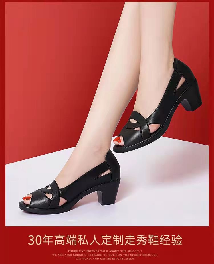 크로스-border Mid-heel 두꺼운 피쉬-발가락 샌들 여성 부드러운 가죽 여름 새로운 부드러운 밑바닥 편안한 할로우-어미 여성을위한 세련된 샌들스토어 가기