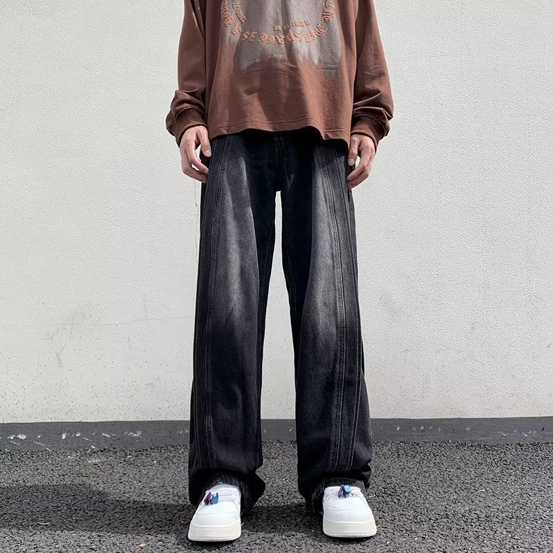美式高街阔腿复古感拼接牛仔裤男宽松设计小众垂感直筒裤长裤
