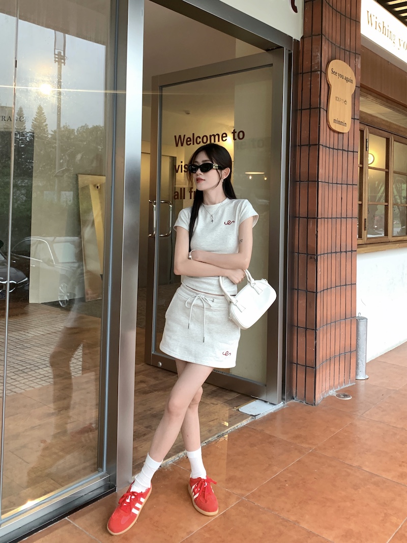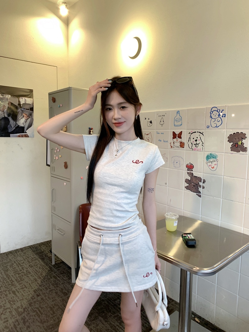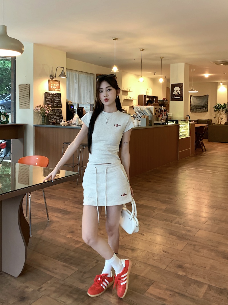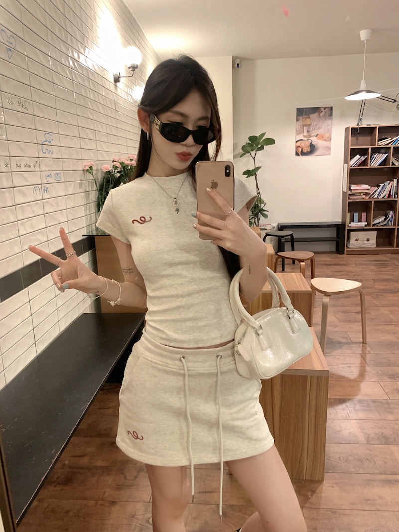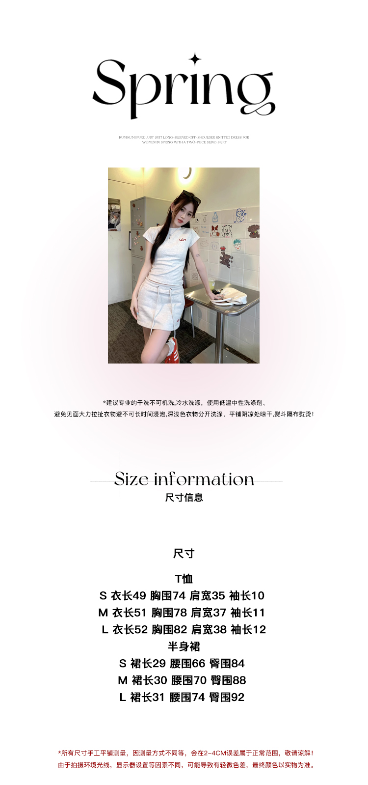어깨 반팔 티셔츠 작은 세트 여성 여름 높은 허리 끈 엉덩이 A 라인 스커트 짧은 치마 달콤한 스파이스 소녀 투피스 세트스토어 가기