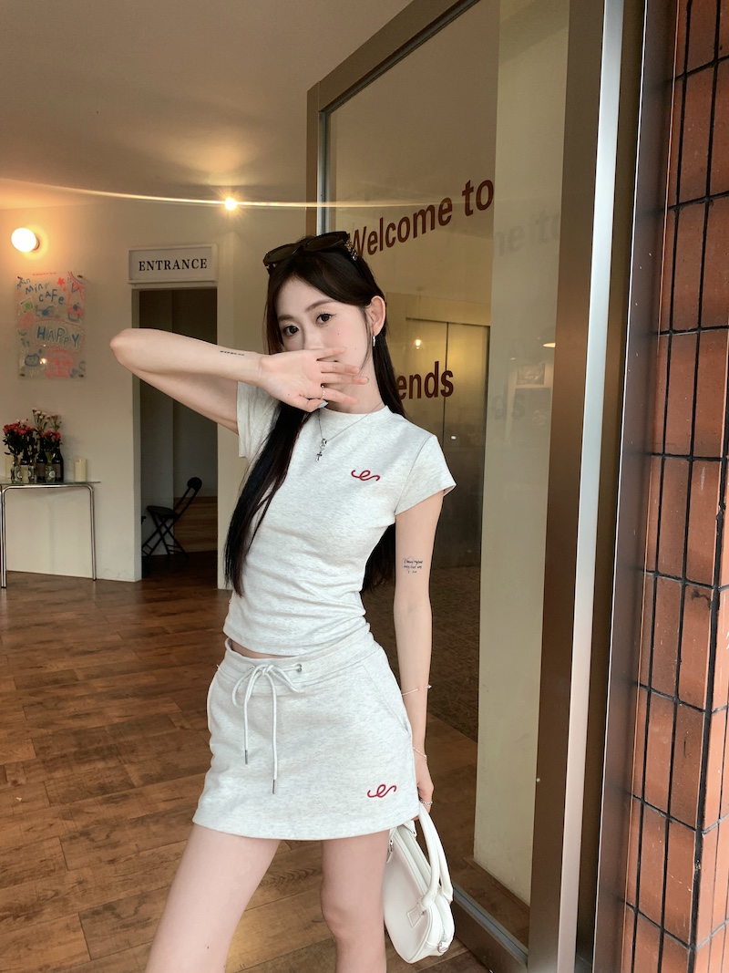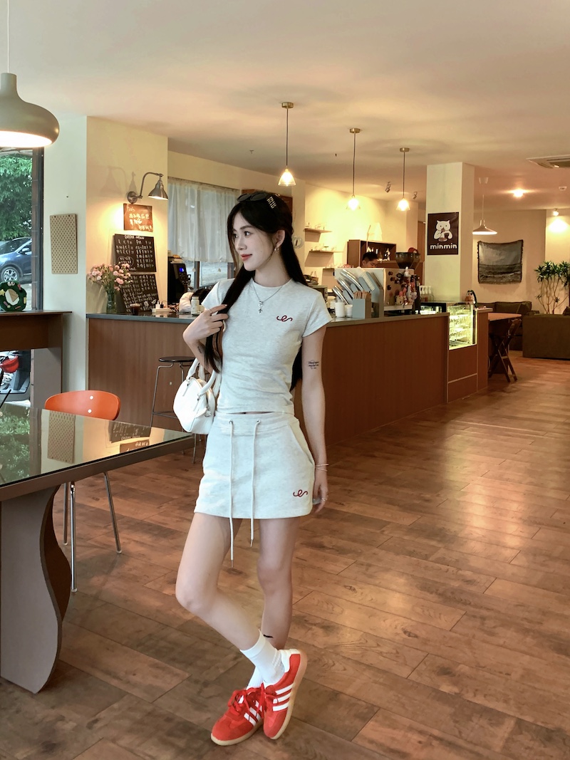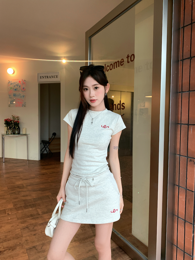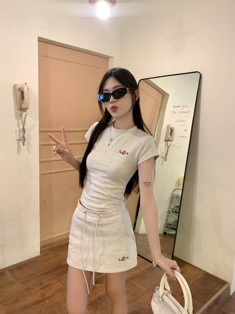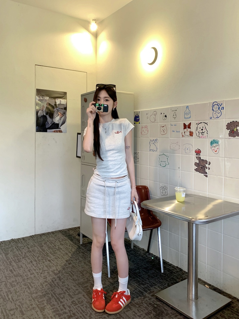 어깨 반팔 티셔츠 작은 세트 여성 여름 높은 허리 끈 엉덩이 A 라인 스커트 짧은 치마 달콤한 스파이스 소녀 투피스 세트스토어 가기