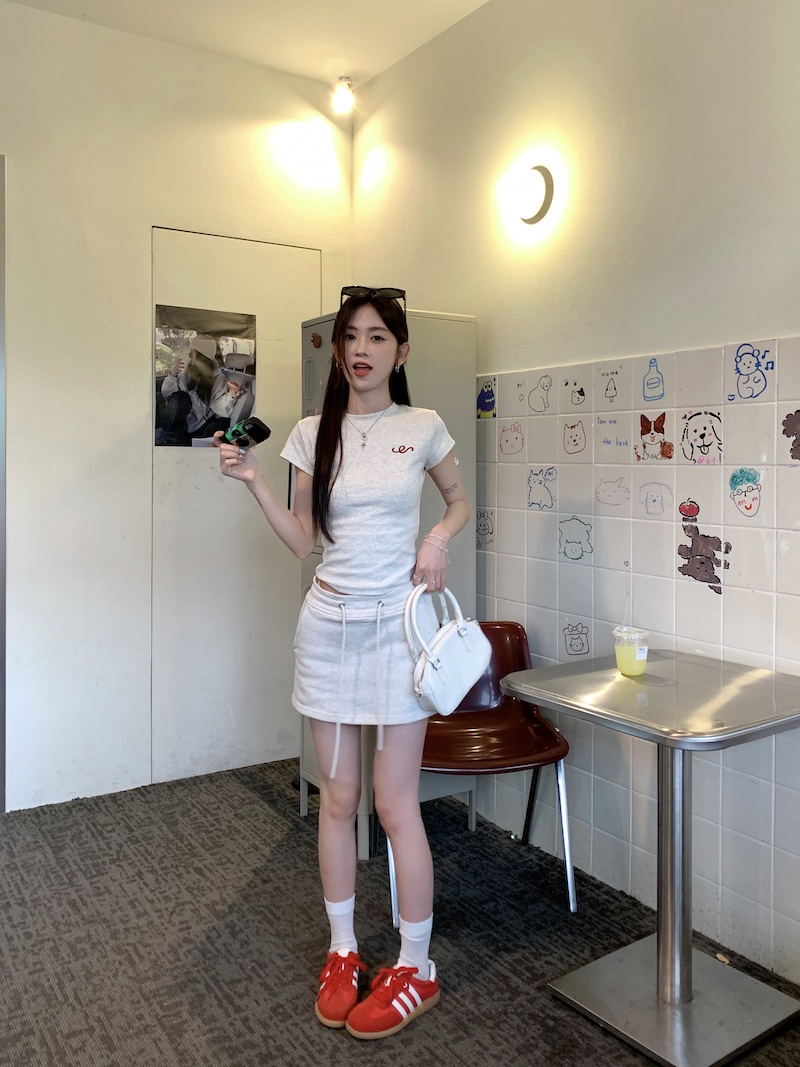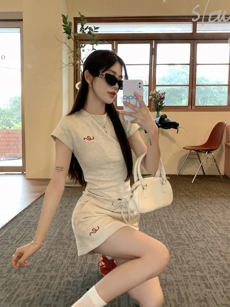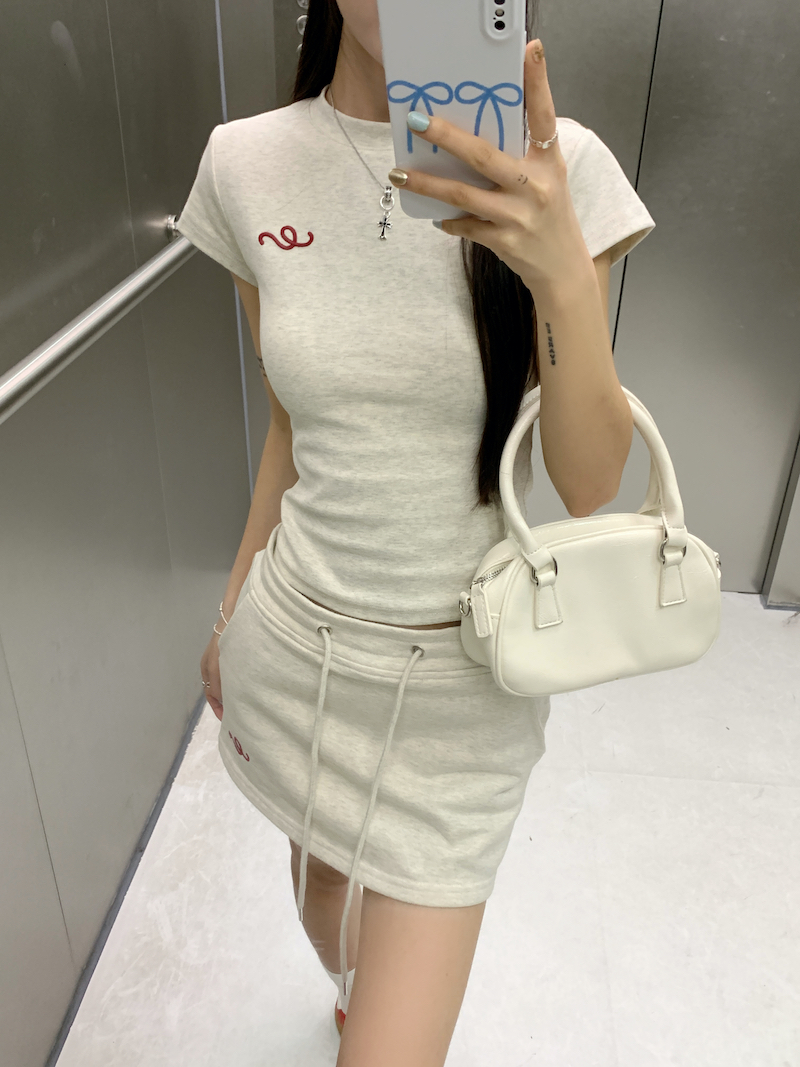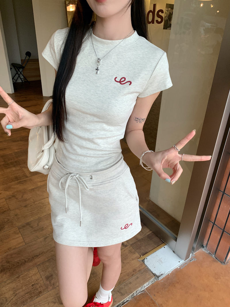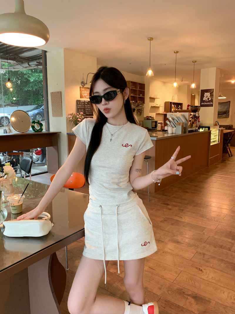 어깨 반팔 티셔츠 작은 세트 여성 여름 높은 허리 끈 엉덩이 A 라인 스커트 짧은 치마 달콤한 스파이스 소녀 투피스 세트스토어 가기