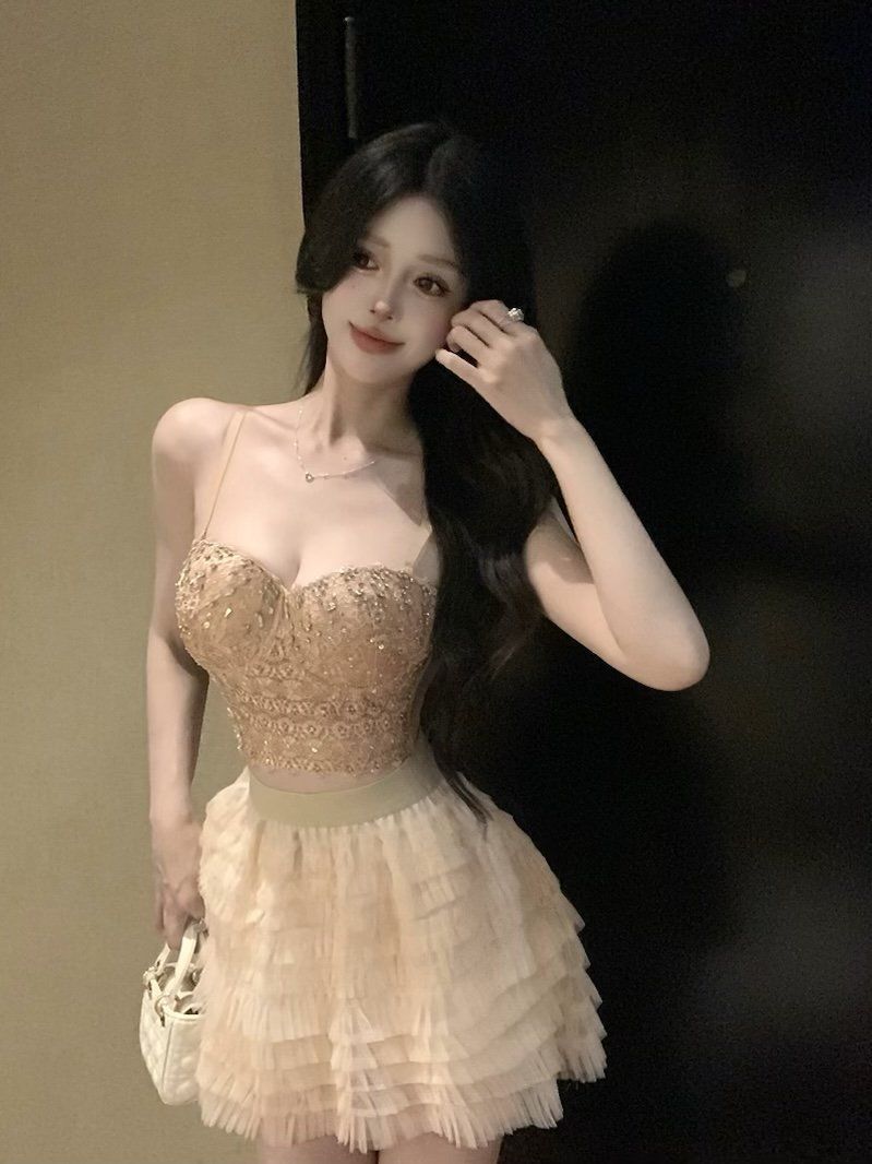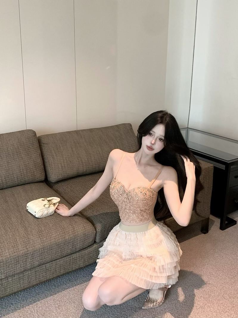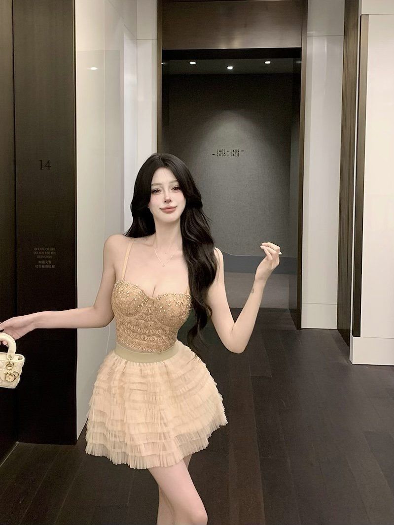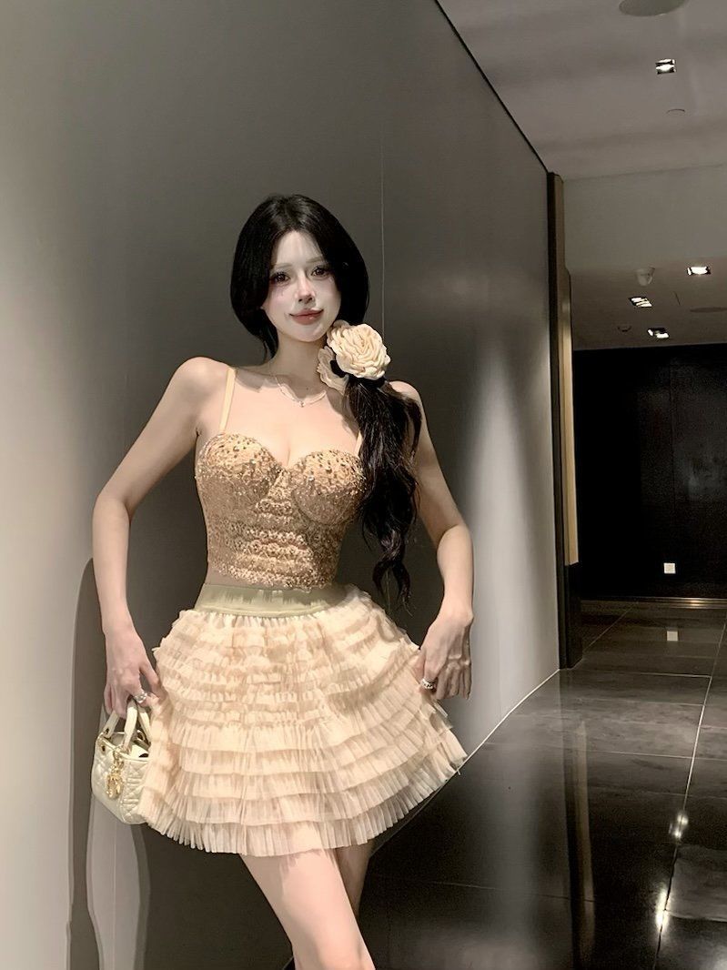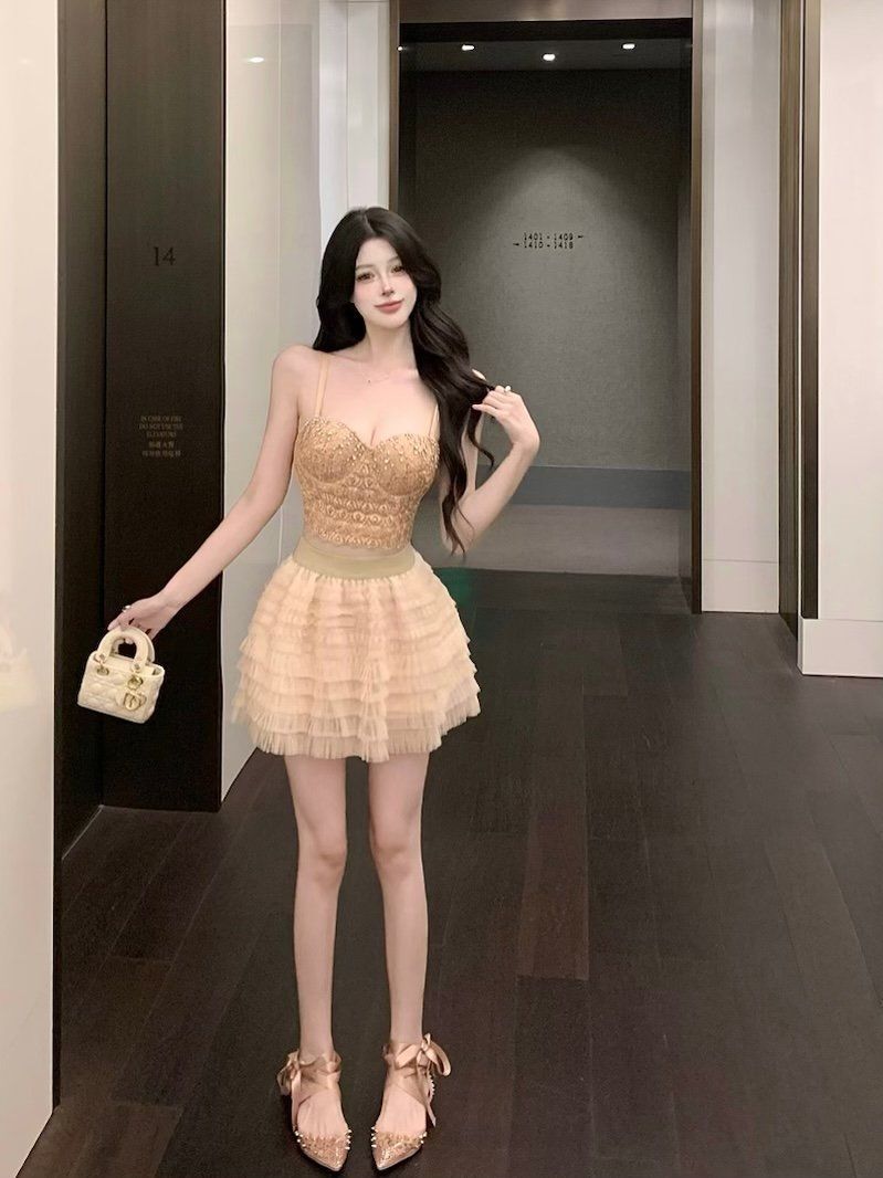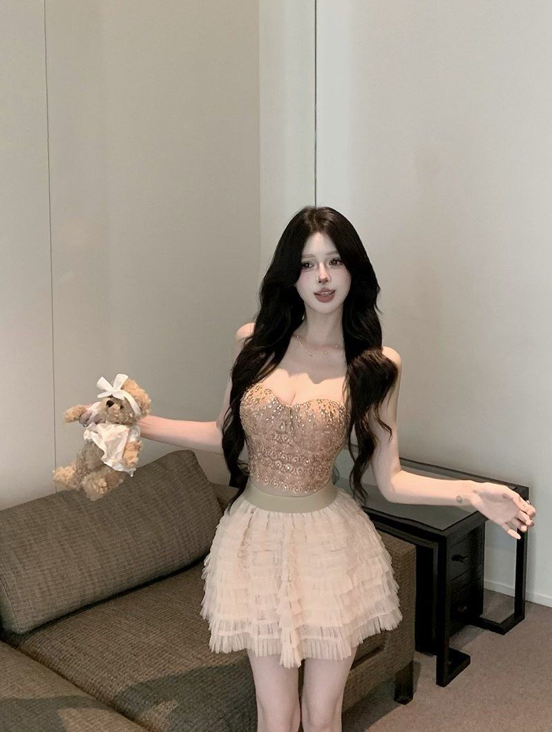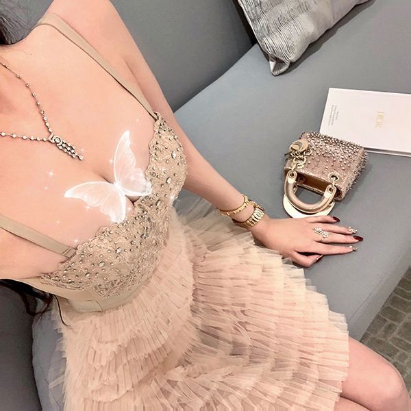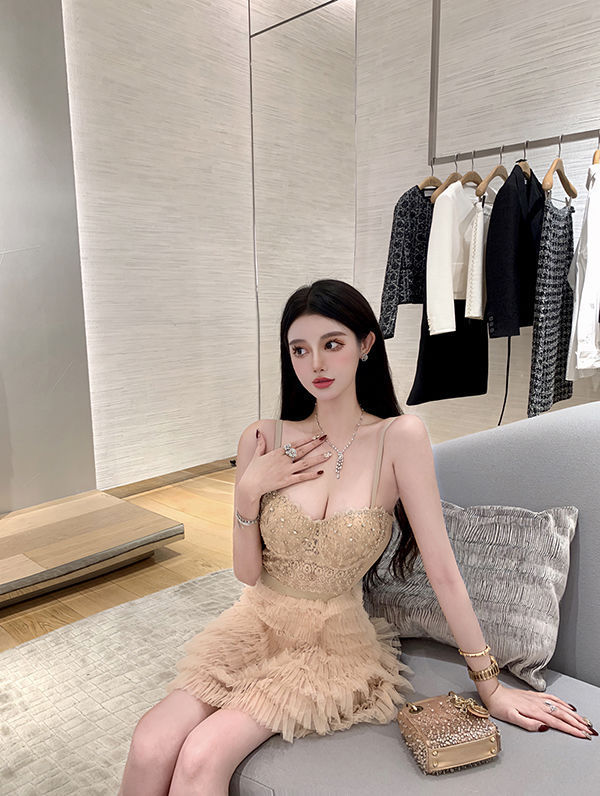 작은 달콤한 향신료 소녀 원피스 여성의 2024 여름 새로운 패션 디자인 레이스 크리스탈 다이아몬드 슬링 메쉬 짧은 치마스토어 가기