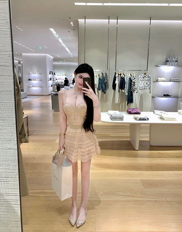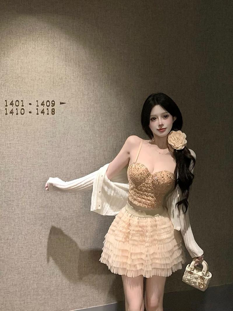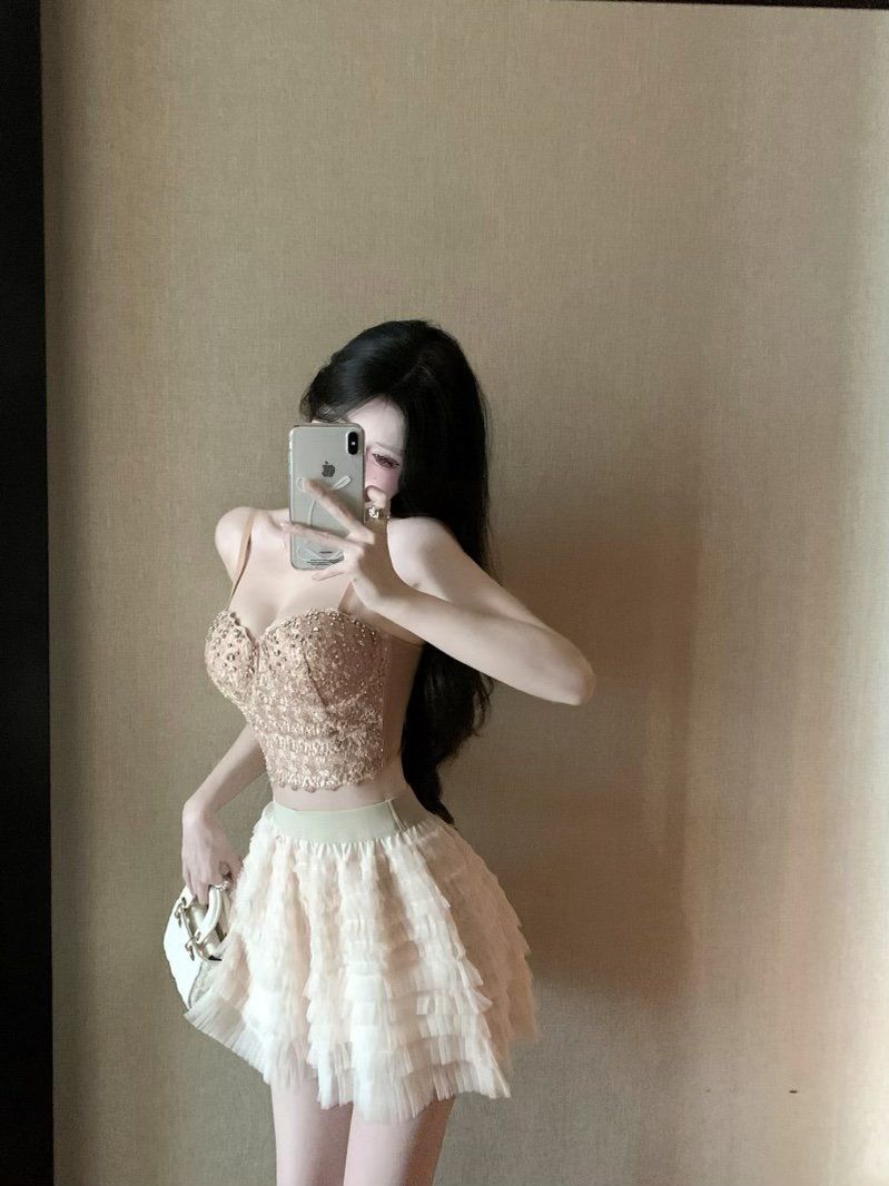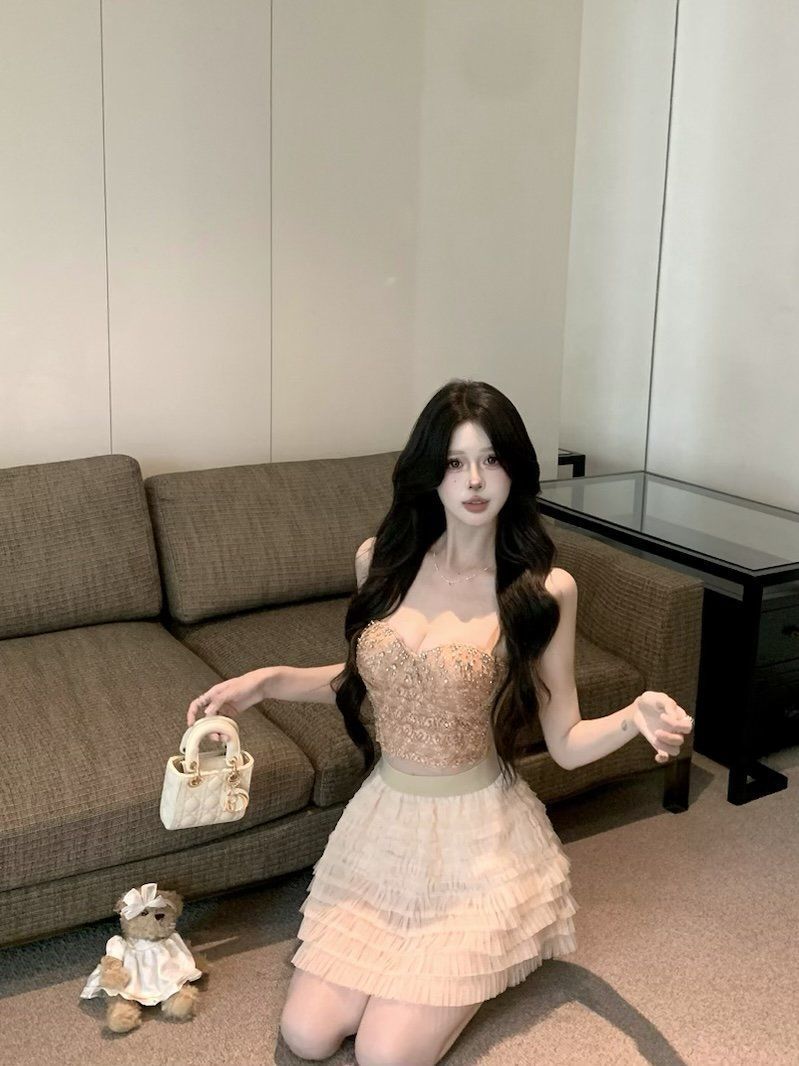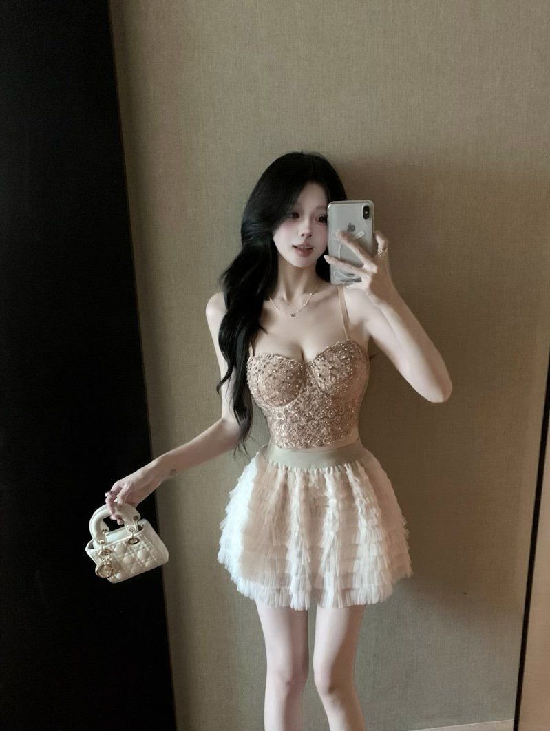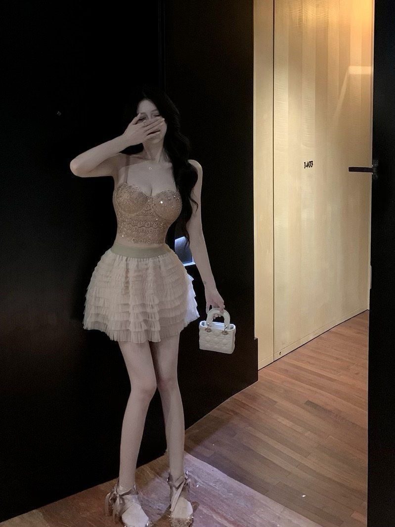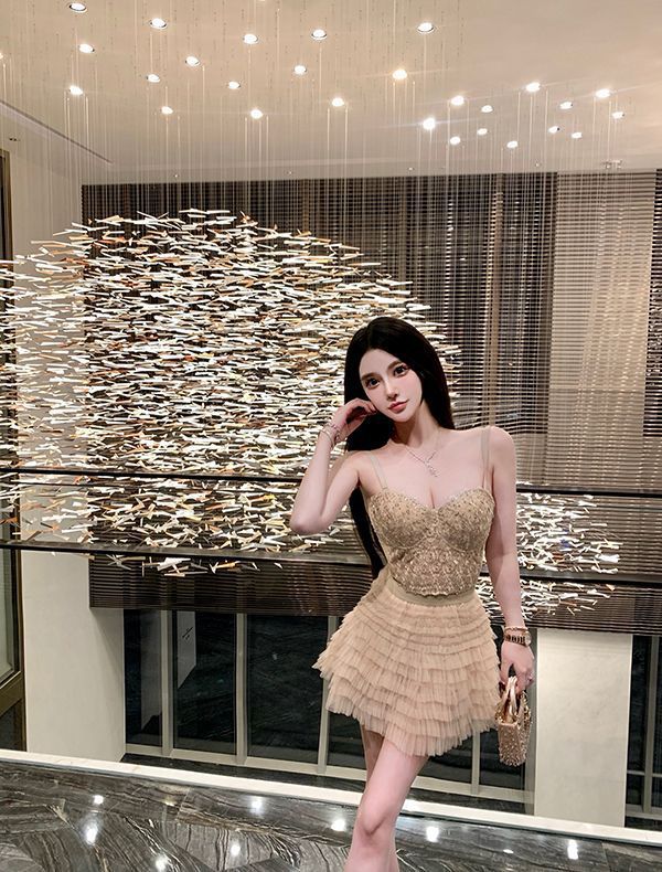 작은 달콤한 향신료 소녀 원피스 여성의 2024 여름 새로운 패션 디자인 레이스 크리스탈 다이아몬드 슬링 메쉬 짧은 치마스토어 가기