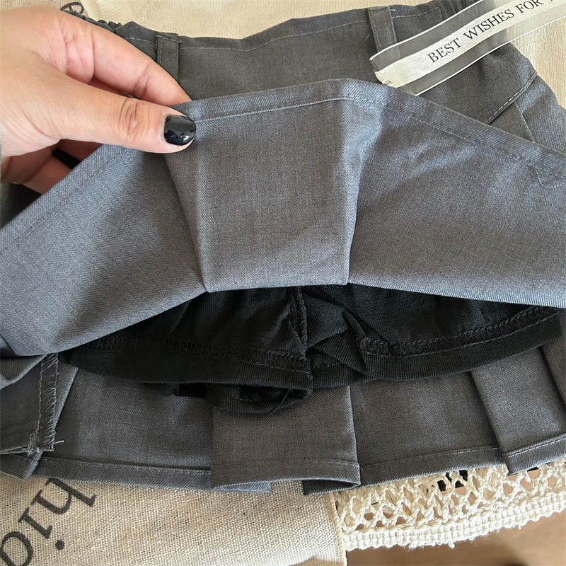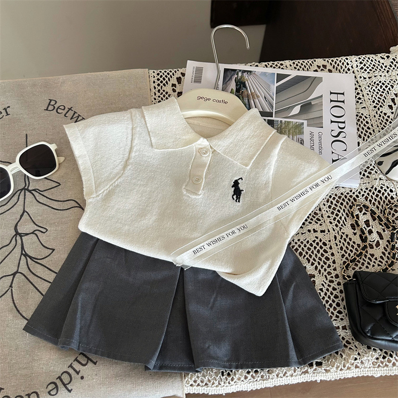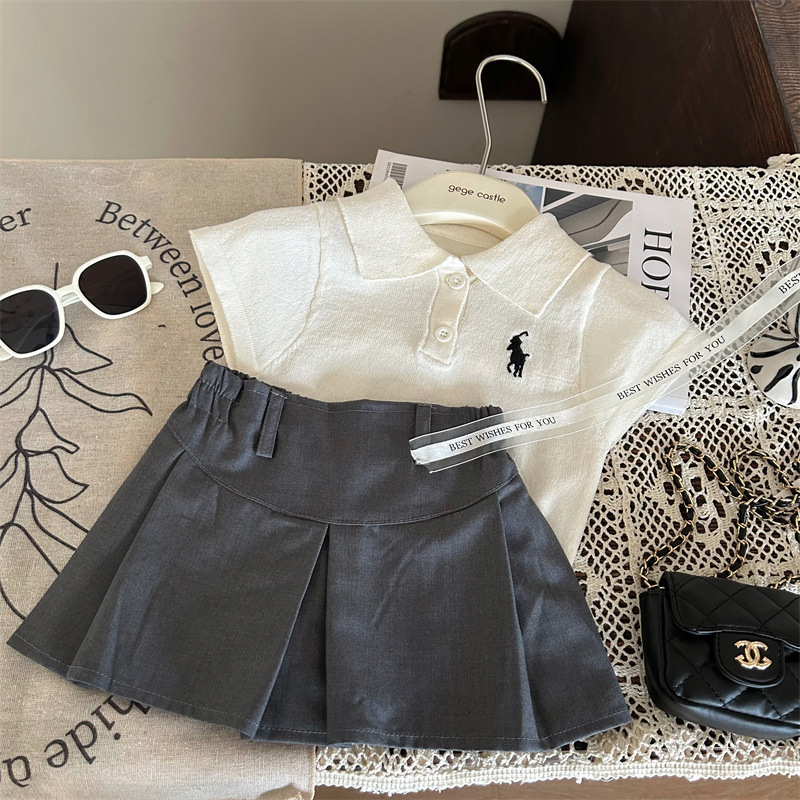 한국 아동복 2024 새 여름 소녀 폴로 칼라 반팔 티셔츠 어린이 올 매치 그레이 스커트 바지 투피스 세트