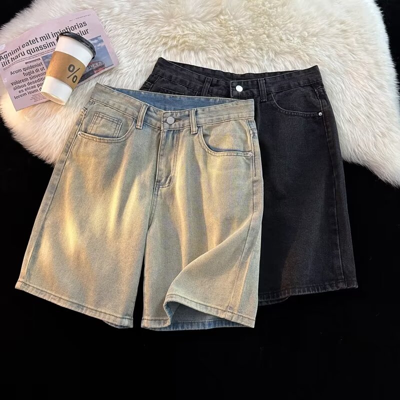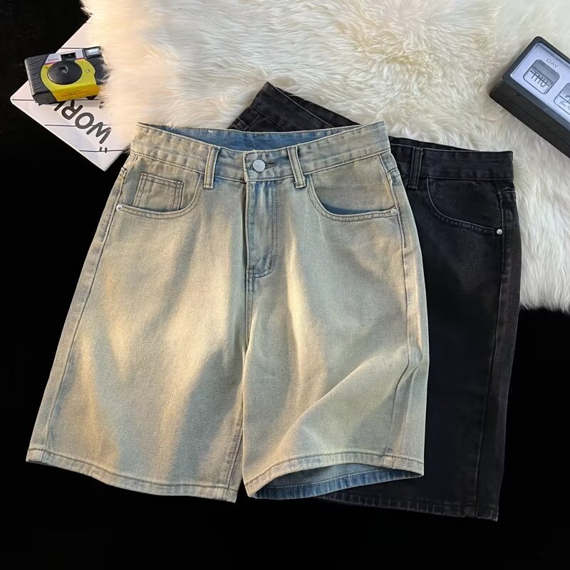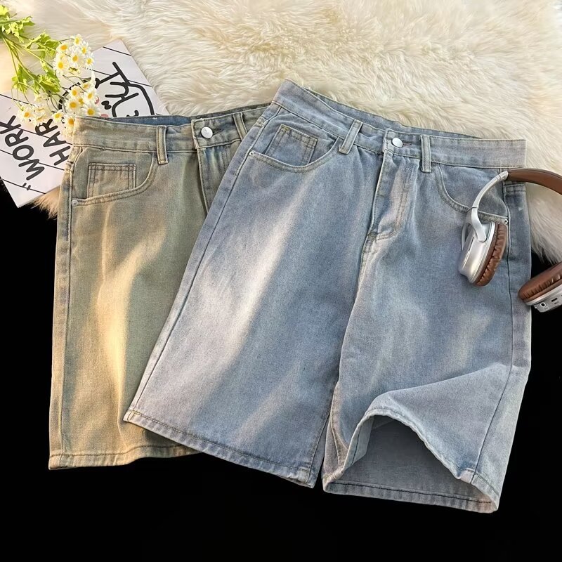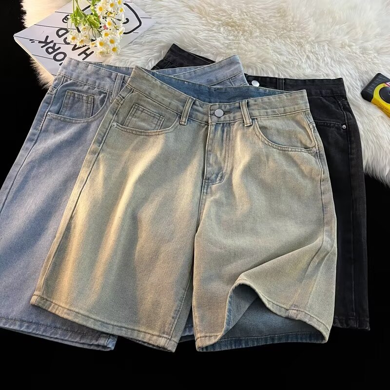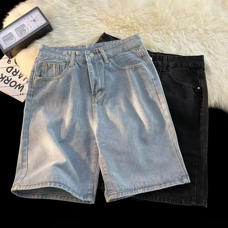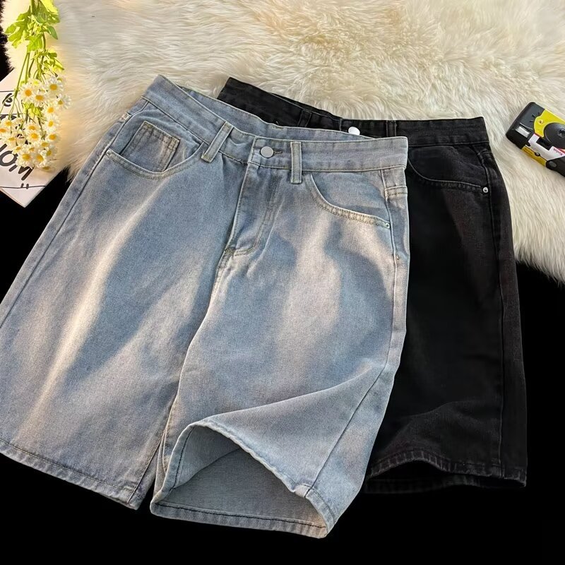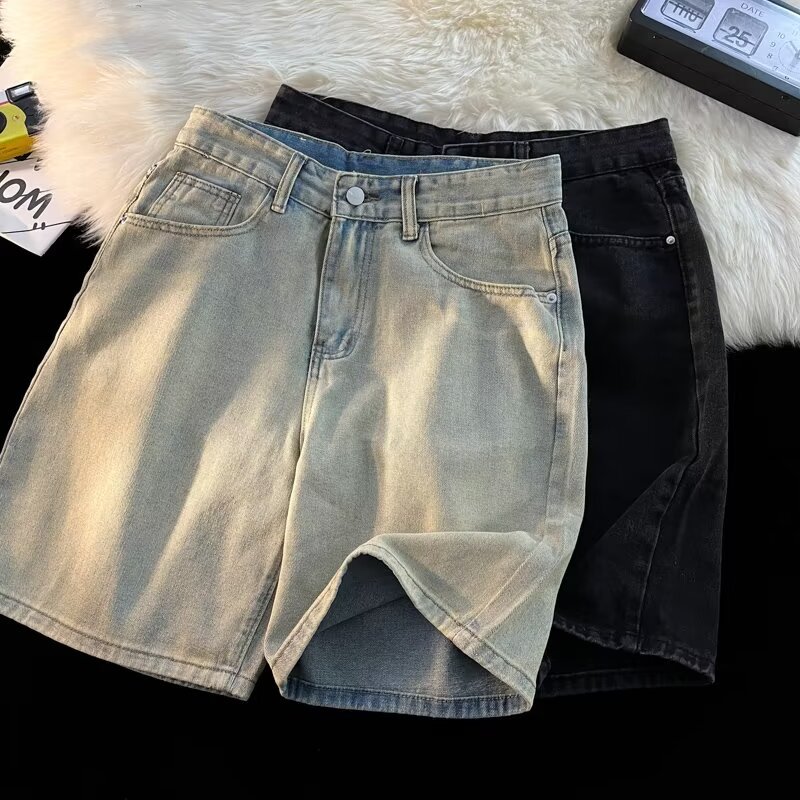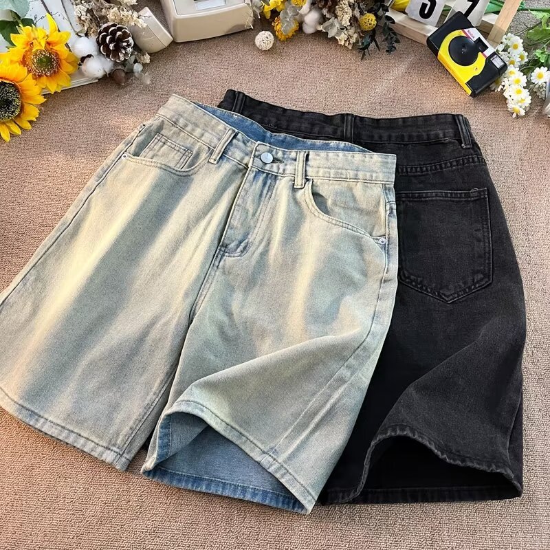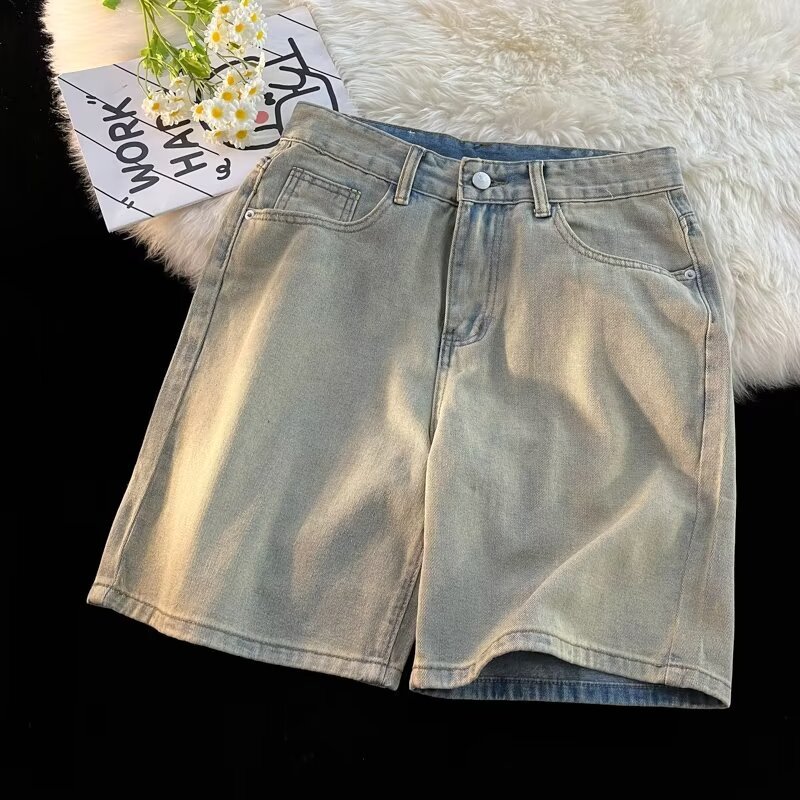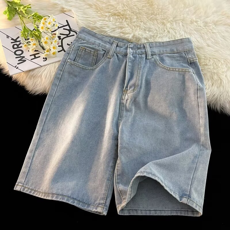 아메리칸 스타일 하이 스트리트 라이트 블루 데님 반바지 남성용 루즈 드로우 스트링 캐주얼 바지 여름 얇은 남성용 스트레이트 바지스토어 가기