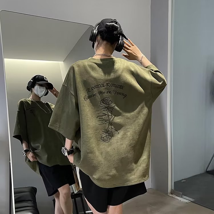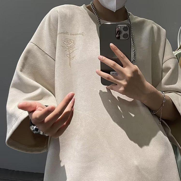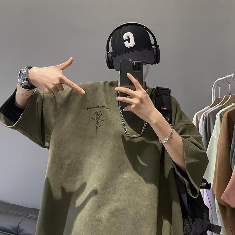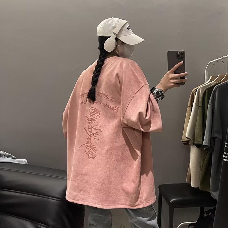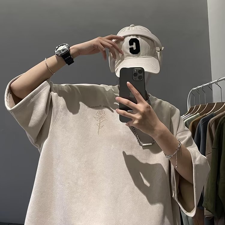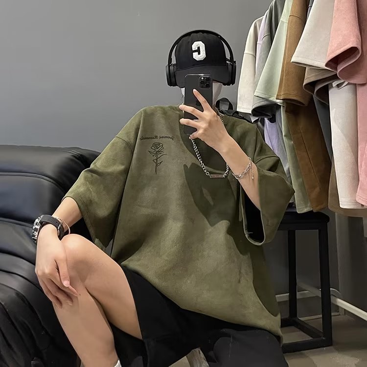 아메리칸 스타일 레트로 하이 스트리트 스웨이드 짧은 소매 티셔츠 남성과 여성 패션 브랜드 유행 오버 사이즈 헤비 커플 캐주얼 하프 슬리브