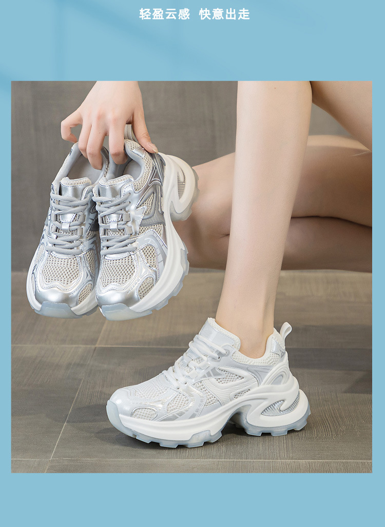 2024 봄과 여름 새로운 실버 토레 신발 여성 두꺼운 솔 증가 메쉬 통기성 캐주얼 올 매치 운동화 여자 트렌디스토어 가기