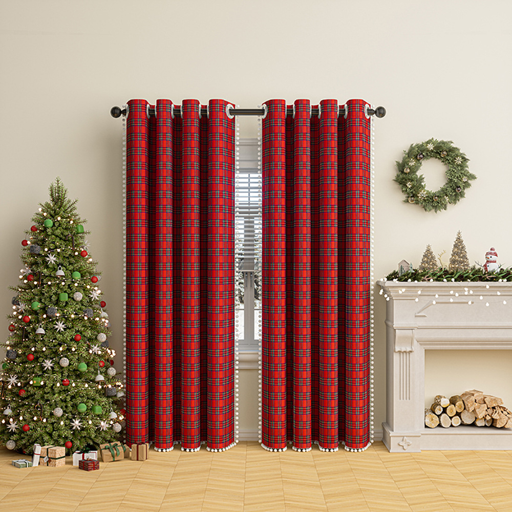 크리스마스 격자 무늬 커튼 미국 휴일 축하 장식 눈송이 모피 공 크리스마스 거실 반 음영 커튼
