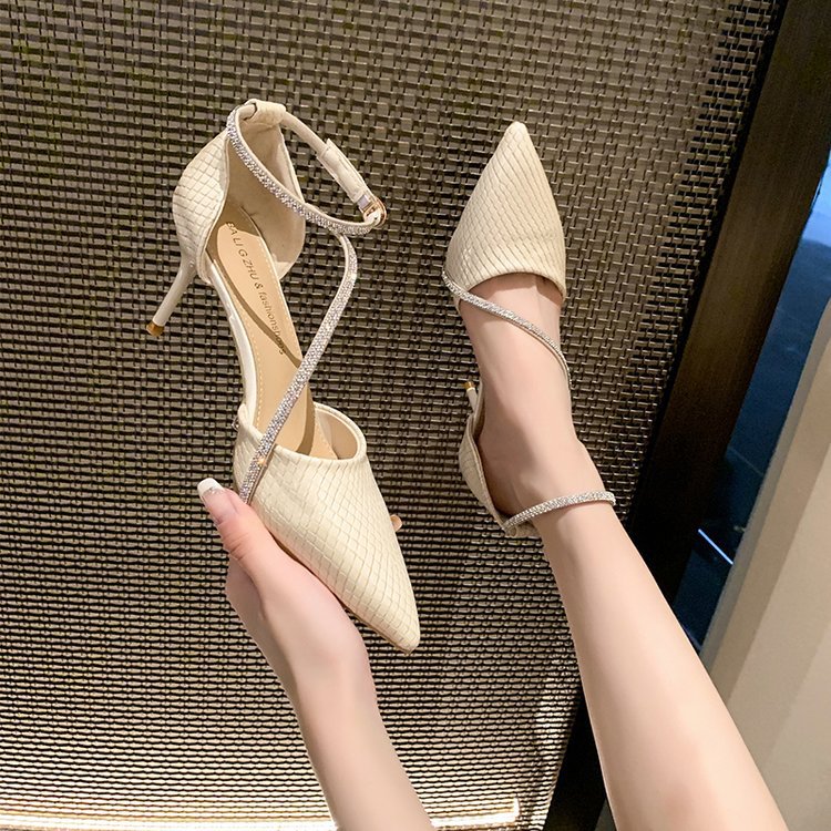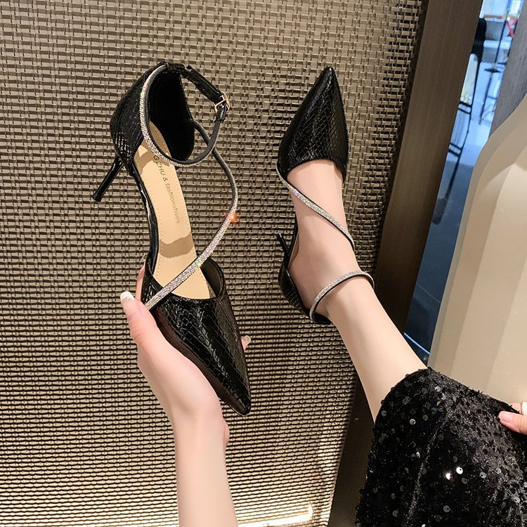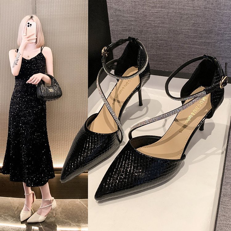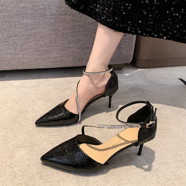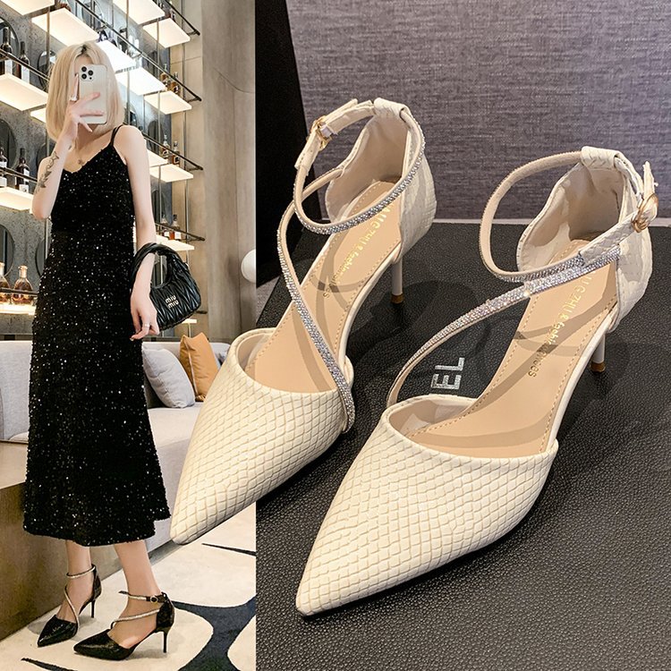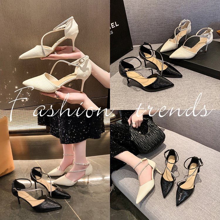 바오터우 할로우 샌들 여자 2024 년 여름 새로운 프랑스 스타일 라인스톤 포인팅 버클 스트랩 한국식 스틸레토 힐 하이힐 슈즈스토어 가기