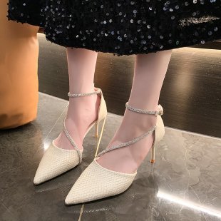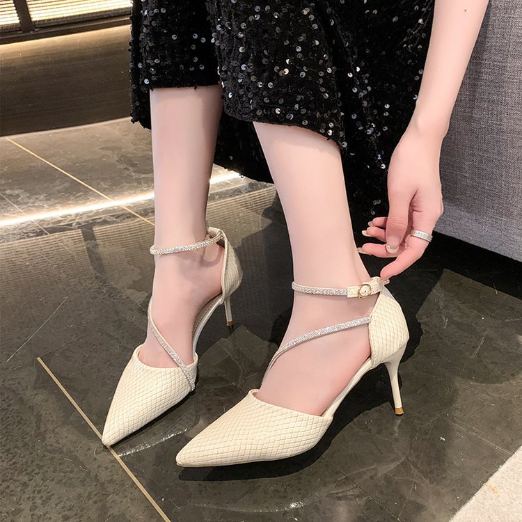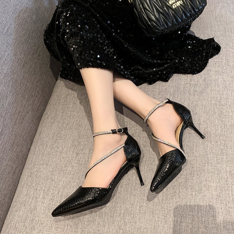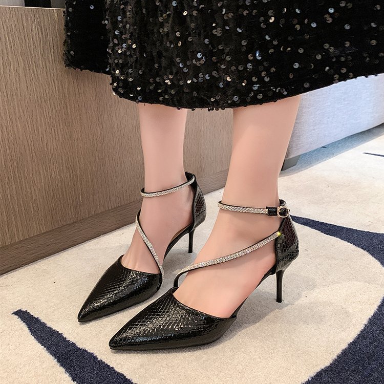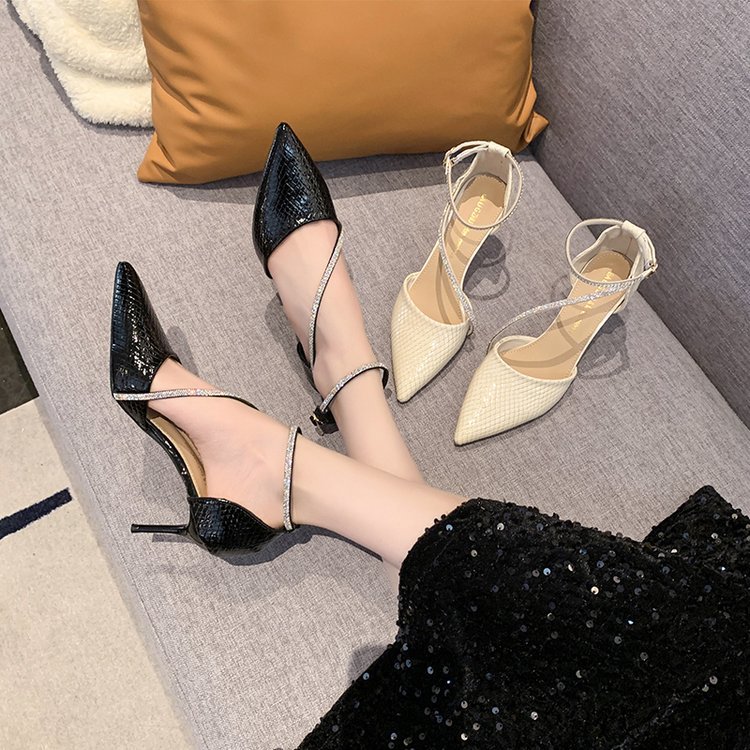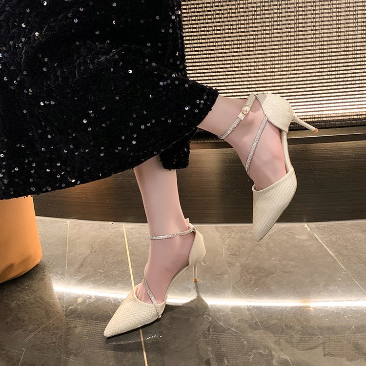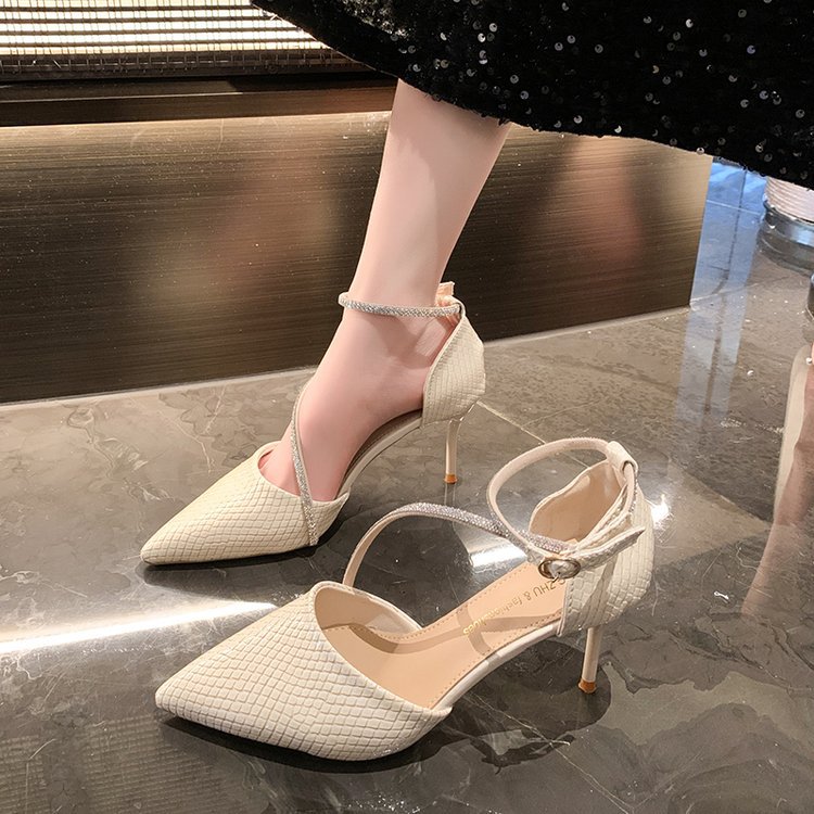 바오터우 할로우 샌들 여자 2024 년 여름 새로운 프랑스 스타일 라인스톤 포인팅 버클 스트랩 한국식 스틸레토 힐 하이힐 슈즈스토어 가기