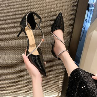 바오터우 할로우 샌들 여자 2024 년 여름 새로운 프랑스 스타일 라인스톤 포인팅 버클 스트랩 한국식 스틸레토 힐 하이힐 슈즈