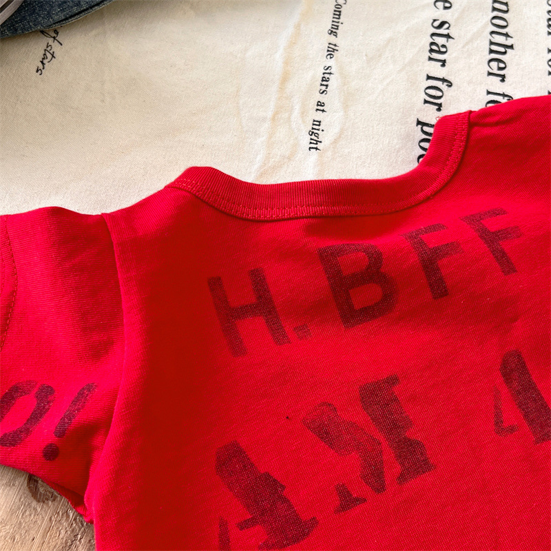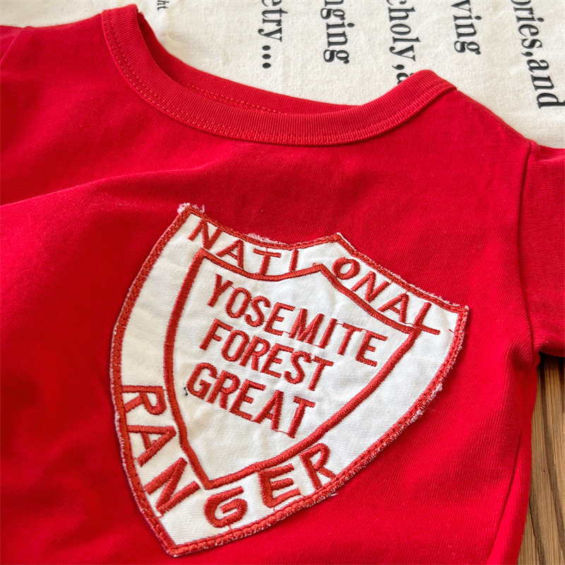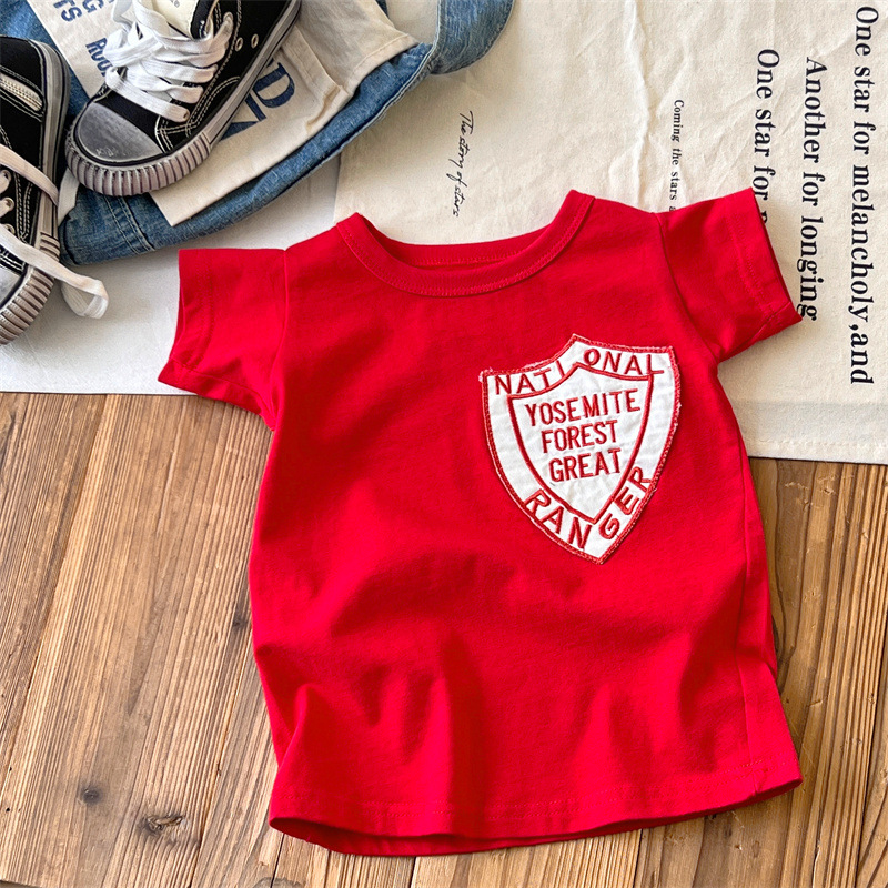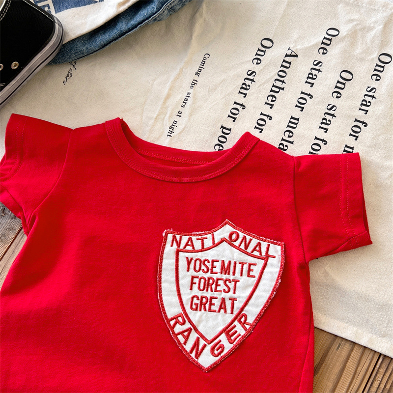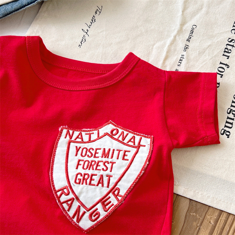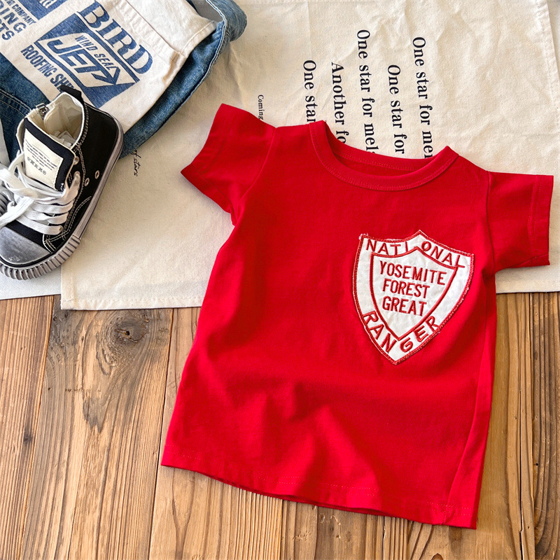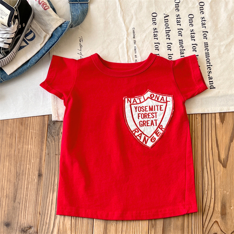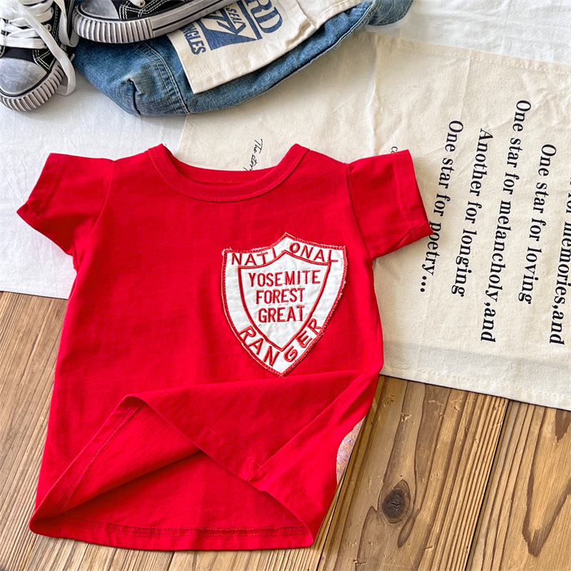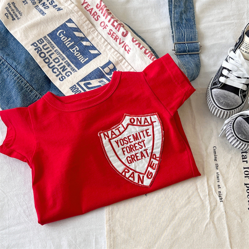 [재고] 일본 어린이 착용 중 DD 어린이 여름 배지 티셔츠 오래 된 환경 친화적 인 인쇄 짧은 소매