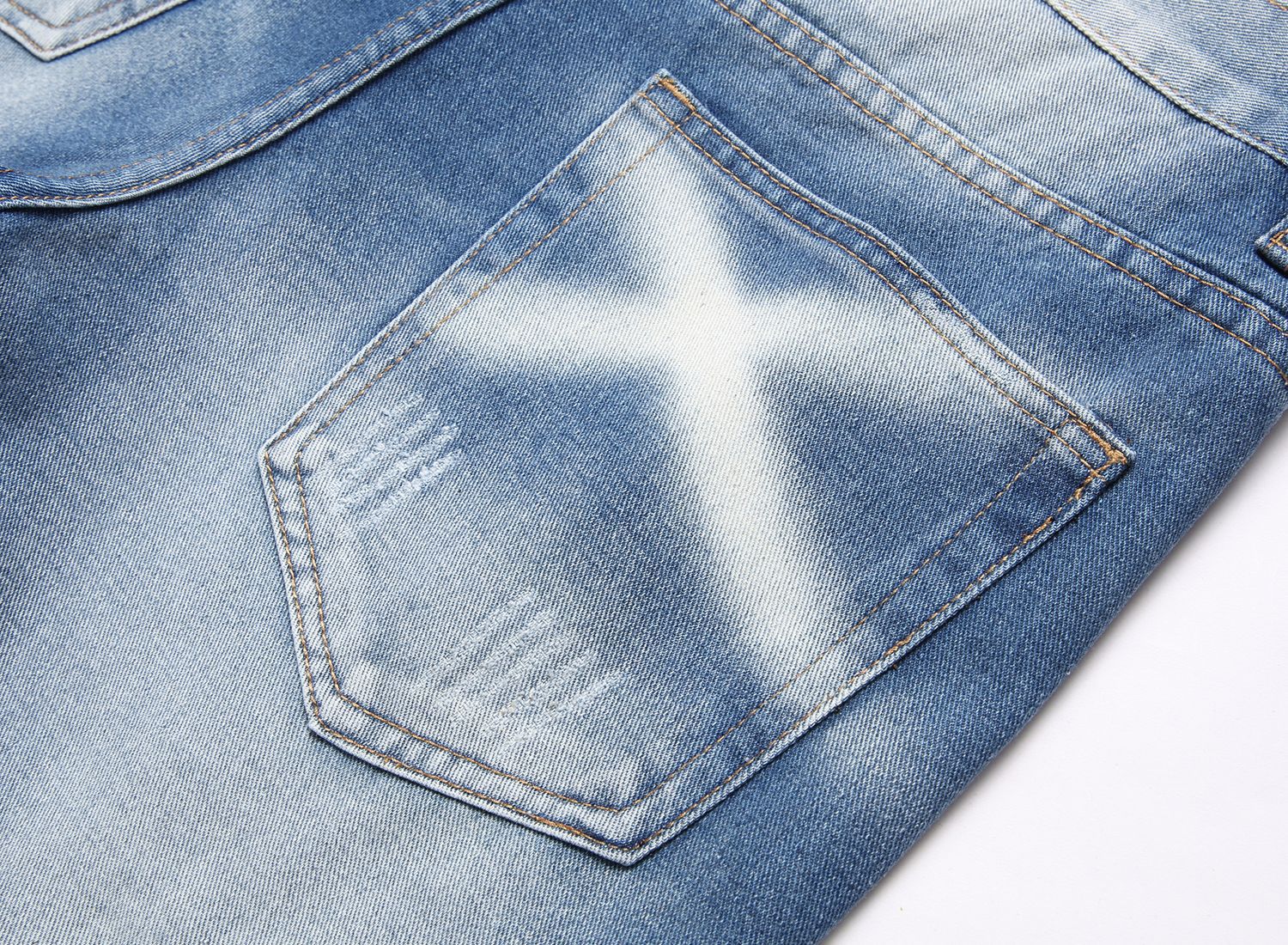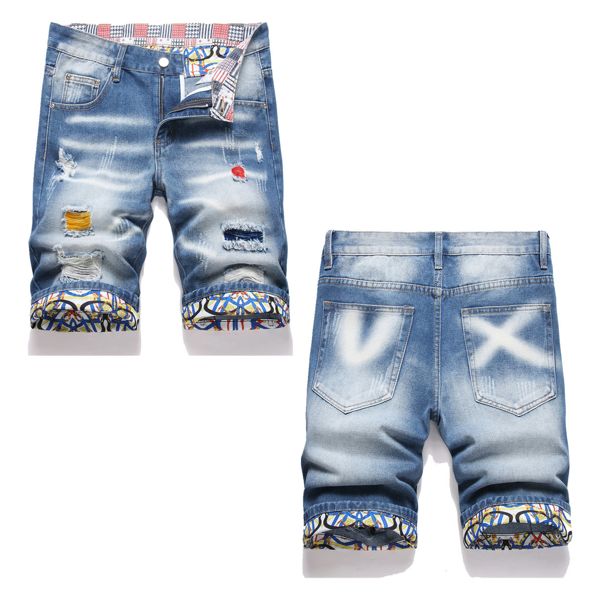 재고 새로운 도착 여름 그라인드 홀 페인트 젊은 남자 5 점 데님 반바지 남성용 트렌디 슬림 핏 스트레이트 다리 바지