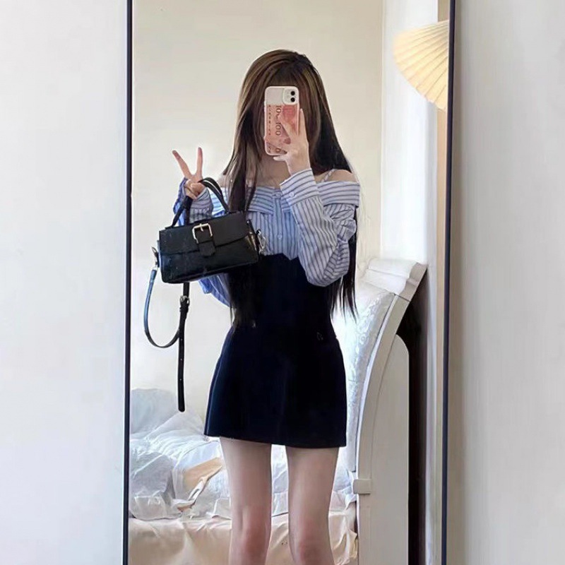 2024 여름 달콤한 향신료 소녀 패션 세트 여성 스트라이프 오프 숄더 셔츠 높은 허리 스커트 투피스 세트스토어 가기