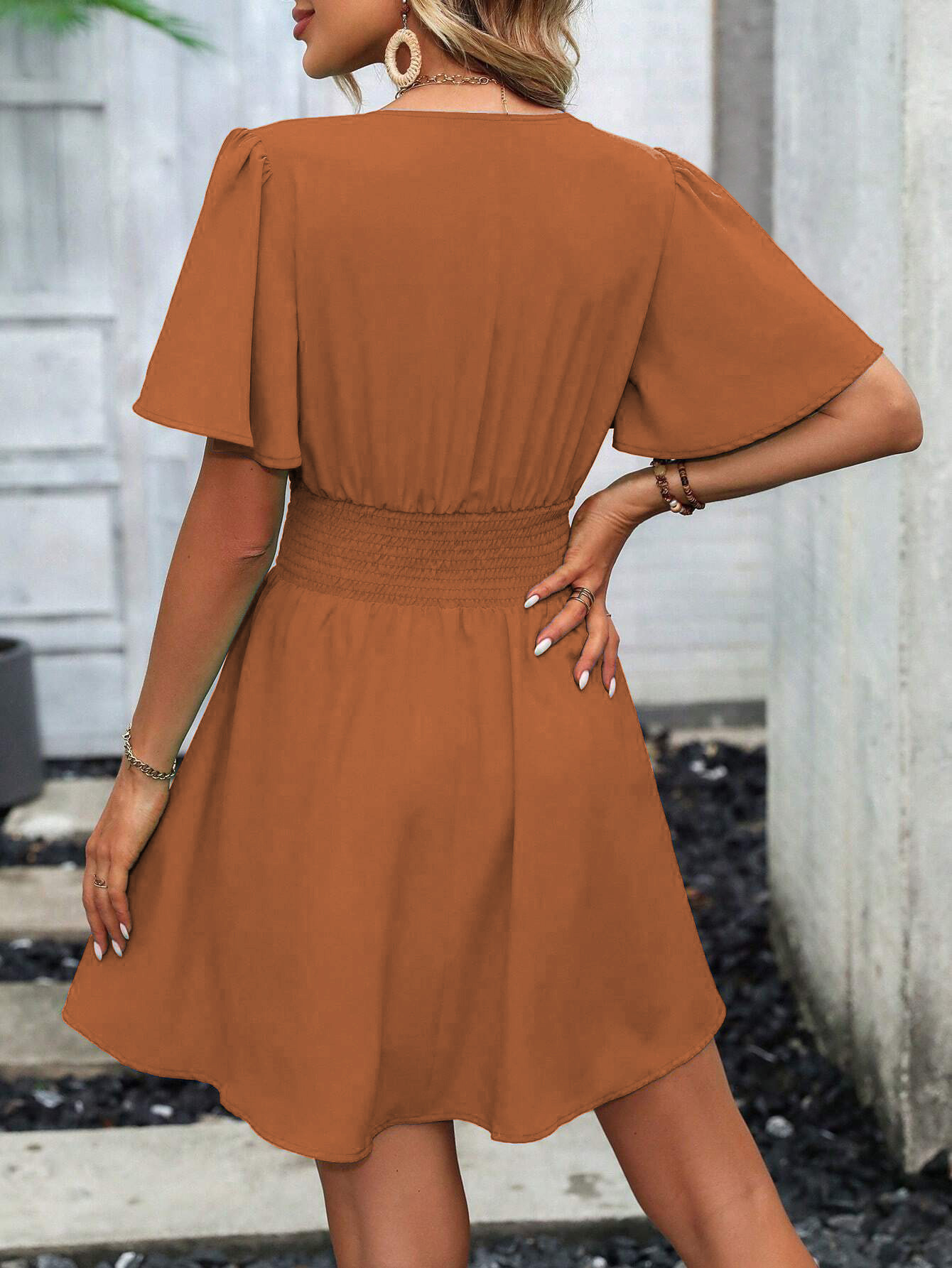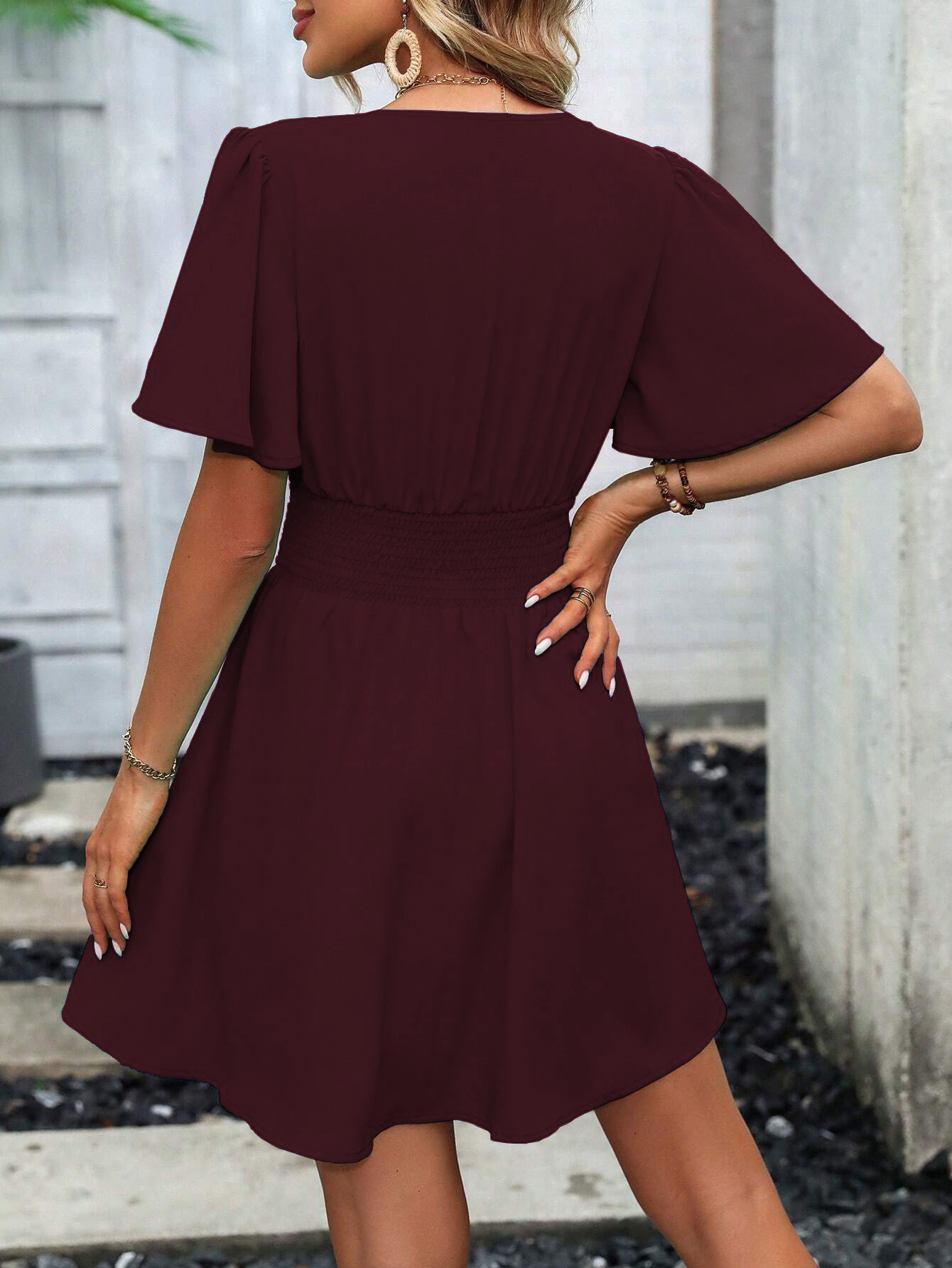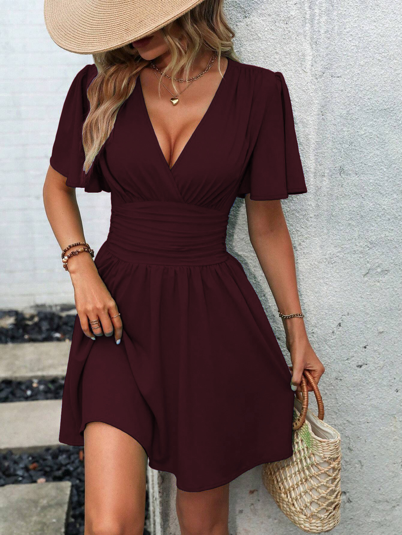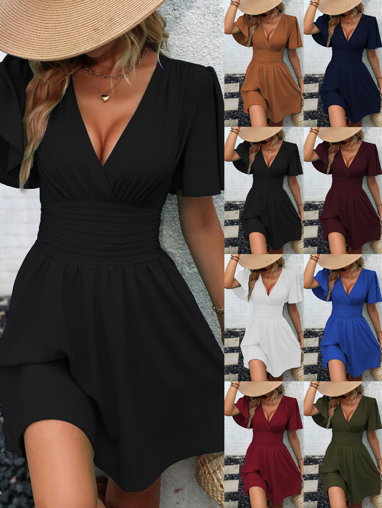 여름 새로운 깊은 V 넥 연꽃 잎 소매 단색 원피스스토어 가기