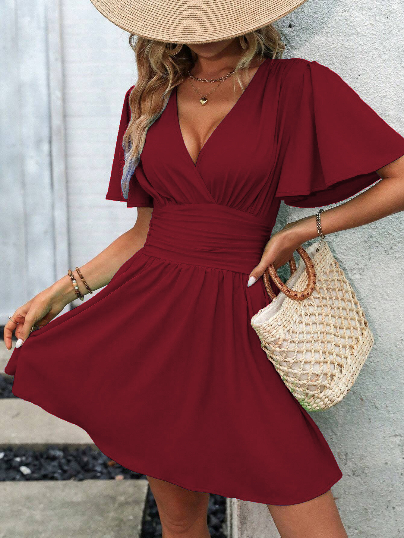 여름 새로운 깊은 V 넥 연꽃 잎 소매 단색 원피스
