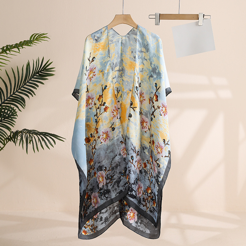 우아한 치마와 함께 여름 새로운 인쇄 된 외부 착용 선 스크린 여성용 목도리 고급 카디건 리 브로케이드 새틴 원단