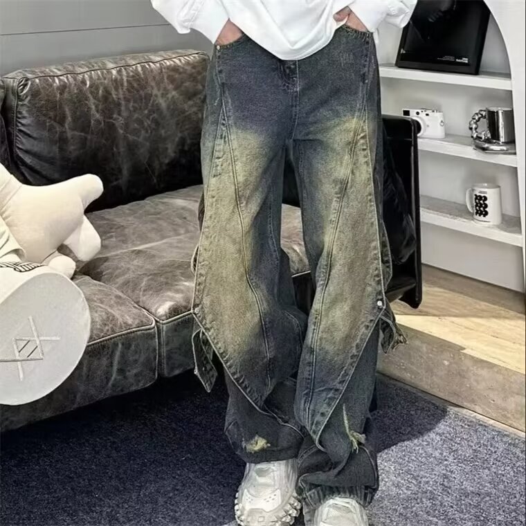 미국 스타일 레트로 중공업 오래 된 노란색 진흙 청바지 스티칭 디자인 센스 하이 스트리트 스트레이트 다리 와이드 레그 바지 트렌디 남성