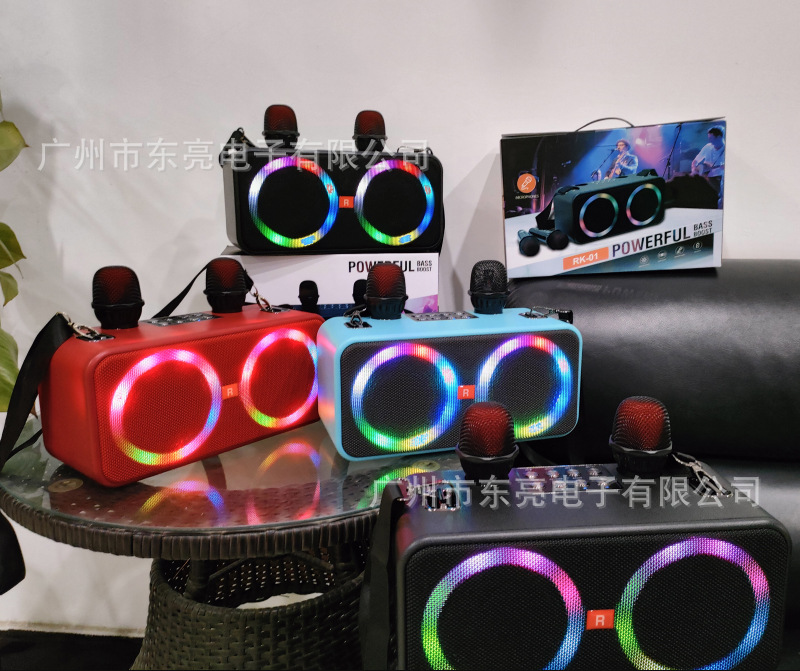 RK-01跨境新品大功率蓝牙无线家用音响 户外便携双话筒一体K歌彩灯音箱