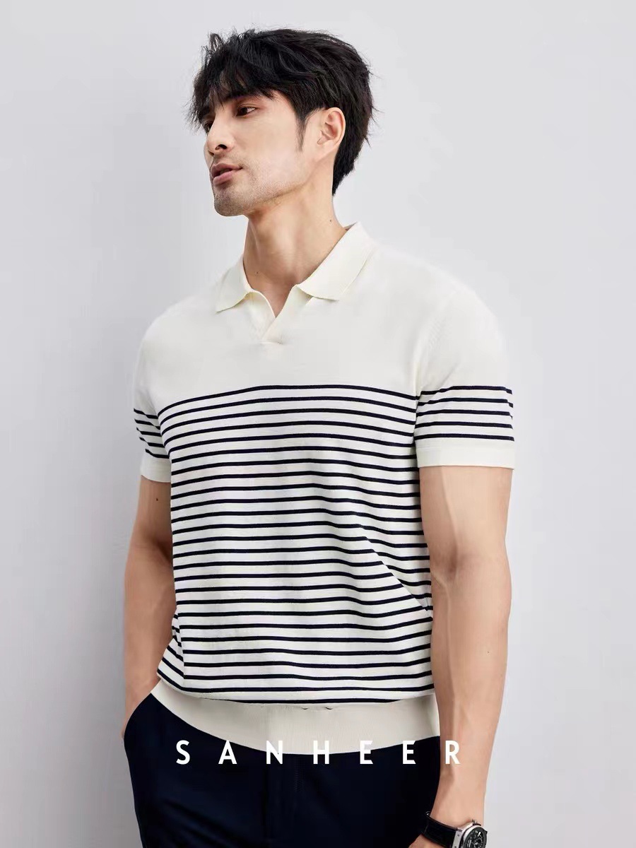 고급 신사 반팔 2024 뉴 폴로 셔츠 남자 줄무늬 통근 매일 올 매치 크루 넥 옷깃 니트 티셔츠스토어 가기