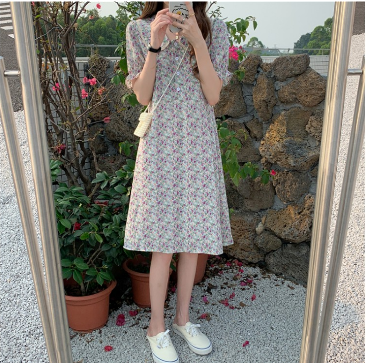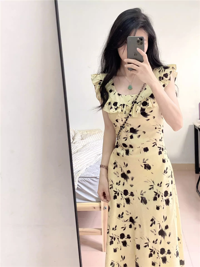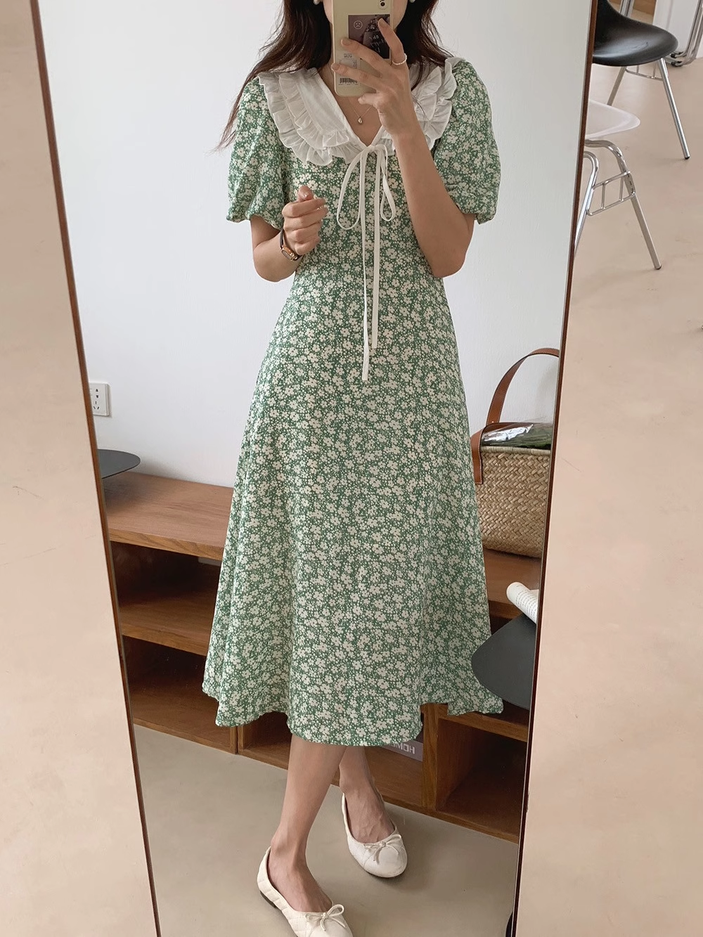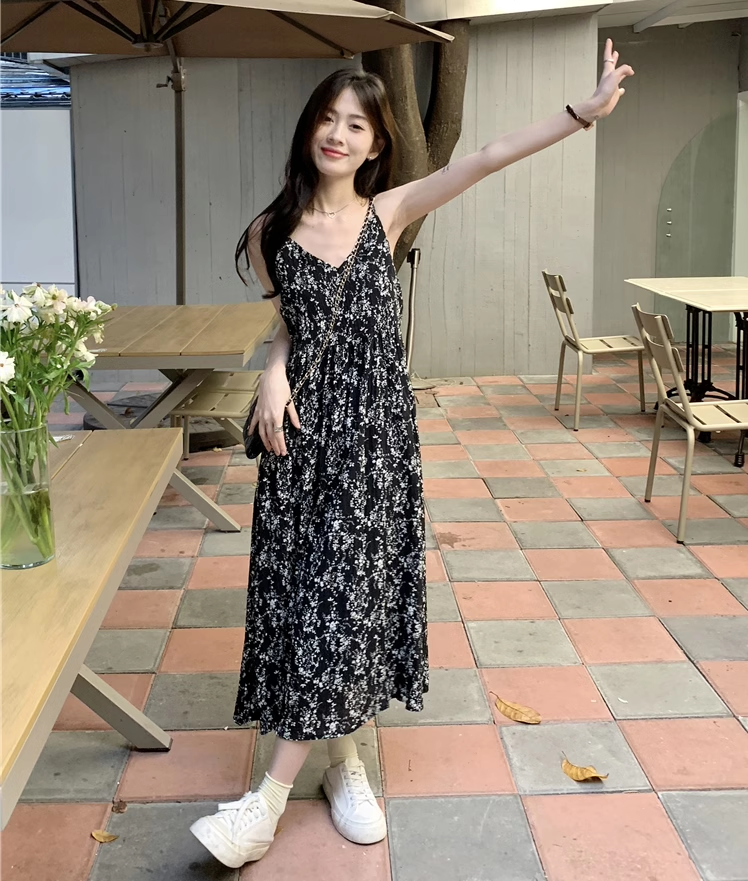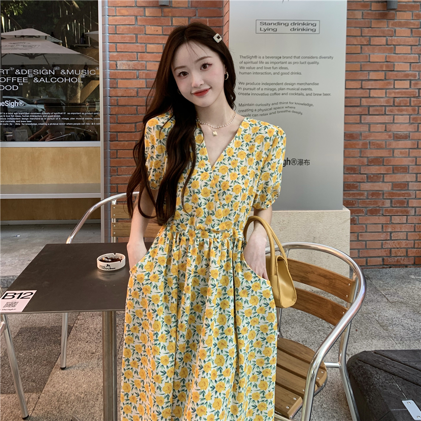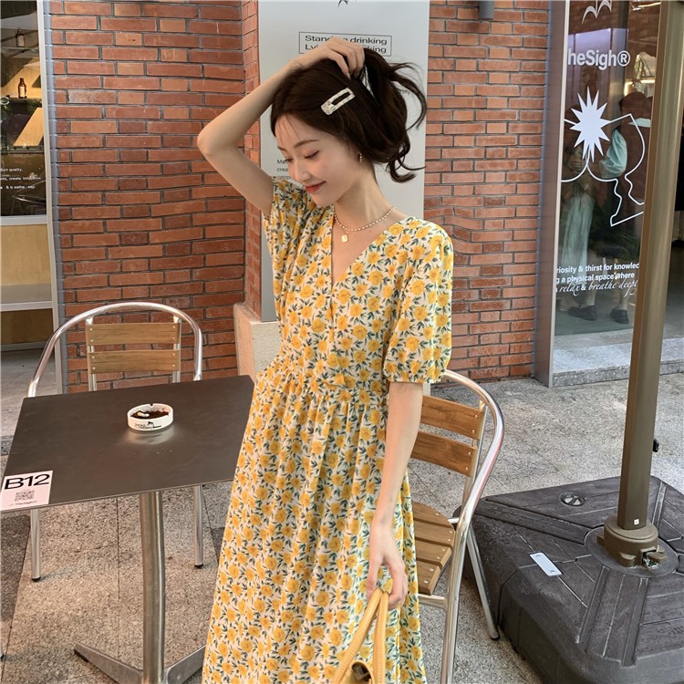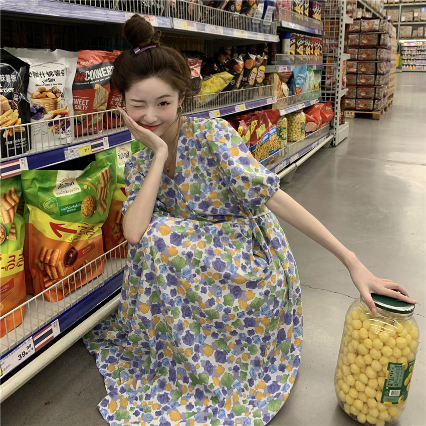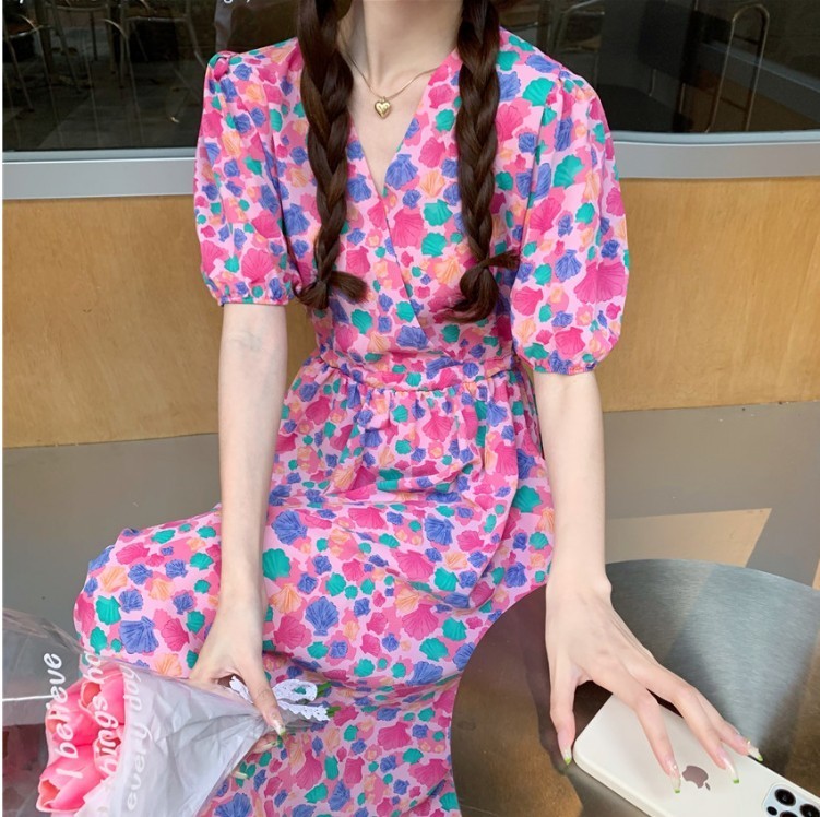 BX 뉴 원피스 여성 여름 쉬폰 플로럴 V 넥 타이트 허리 슬리밍 우아한 긴 무릎 위 A 자형 원피스스토어 가기