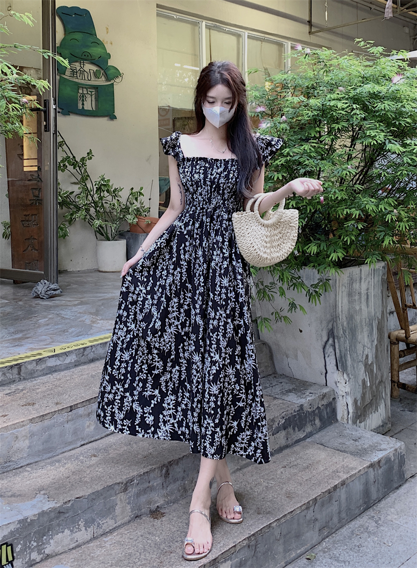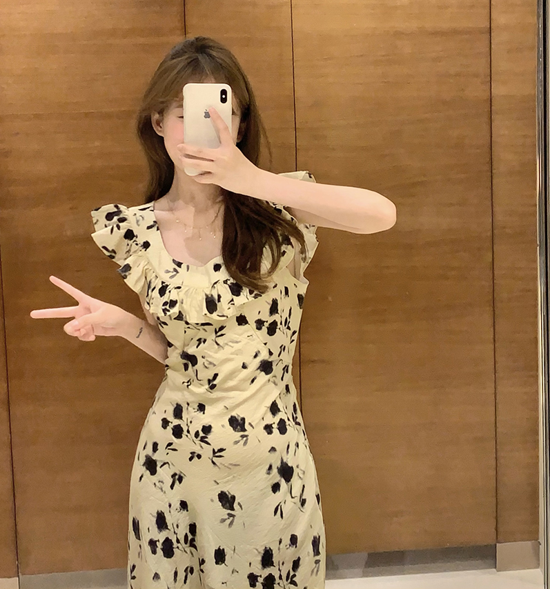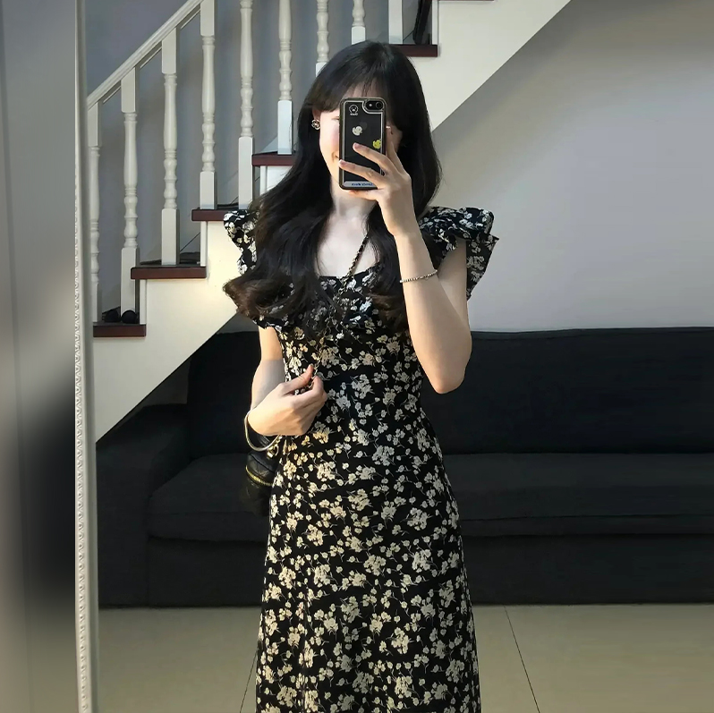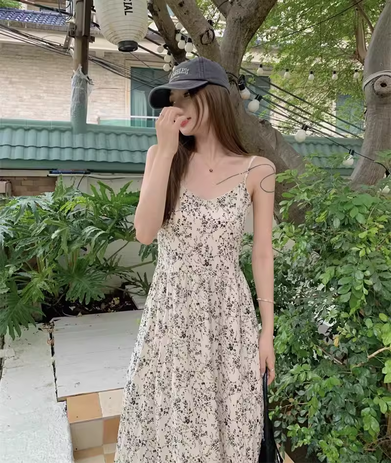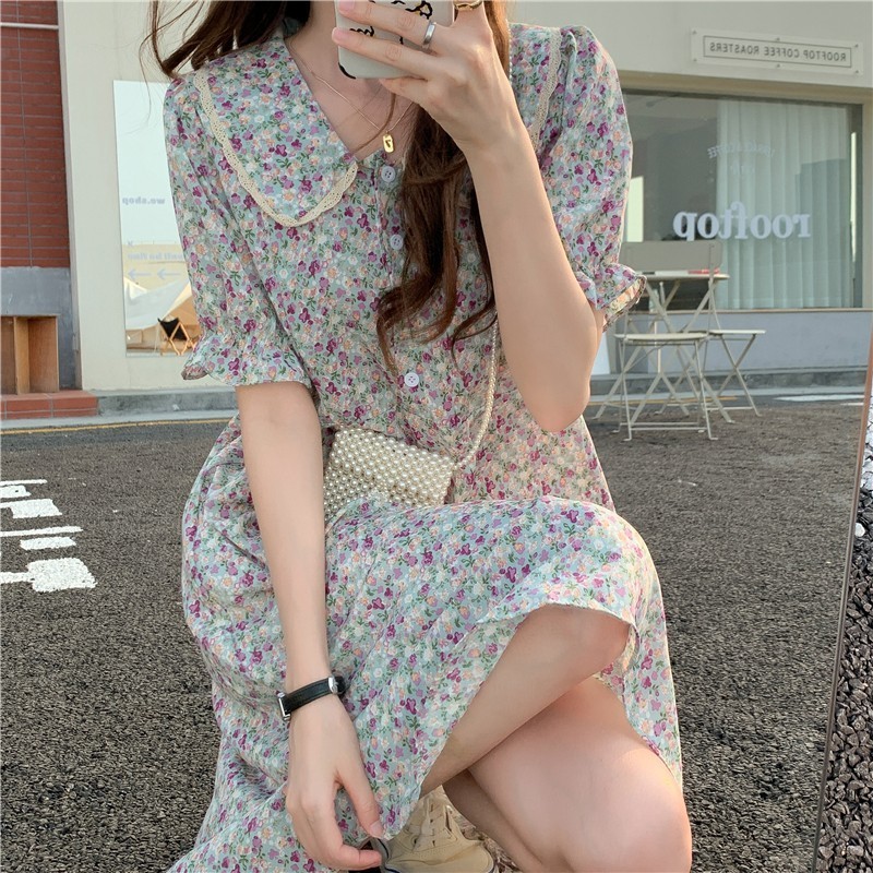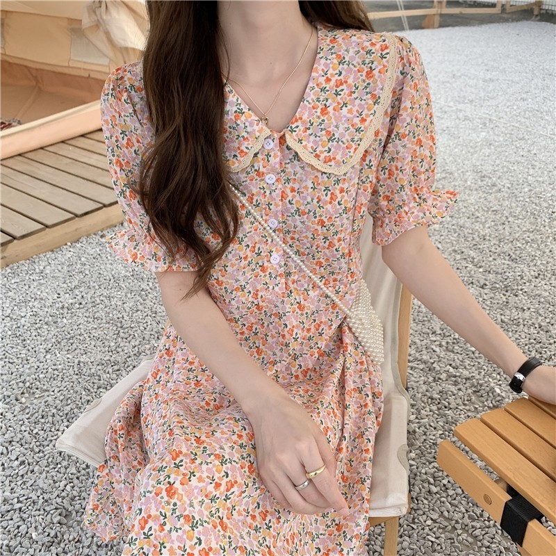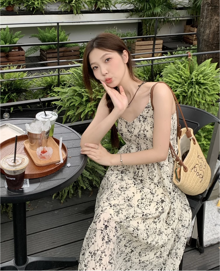BX 뉴 원피스 여성 여름 쉬폰 플로럴 V 넥 타이트 허리 슬리밍 우아한 긴 무릎 위 A 자형 원피스스토어 가기