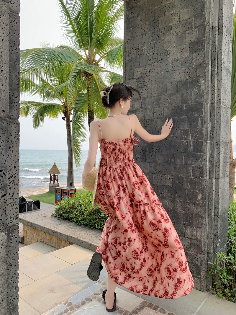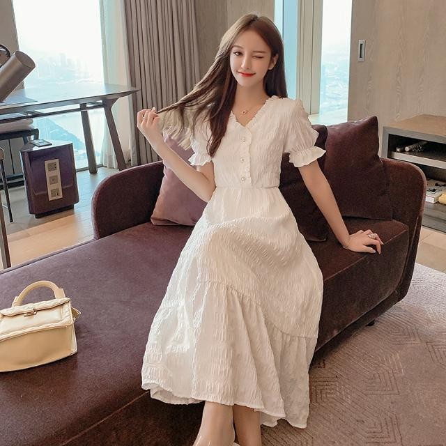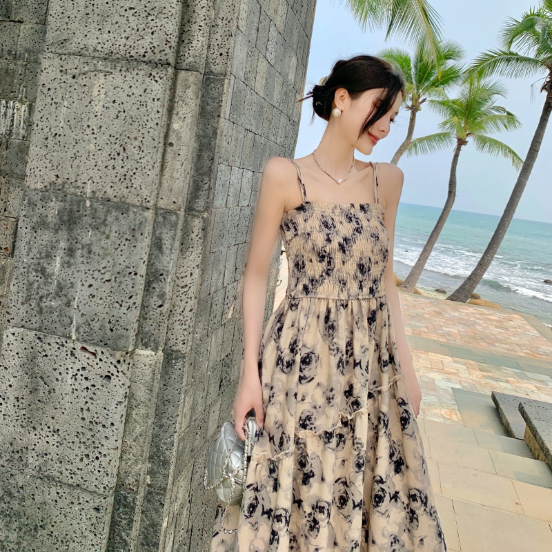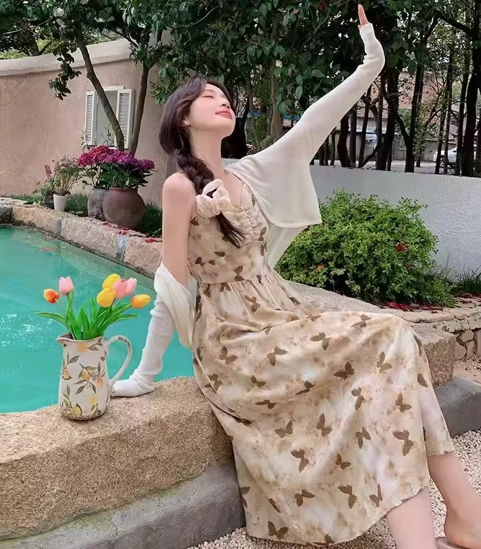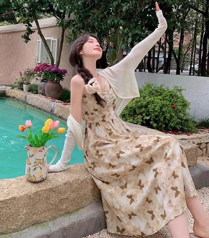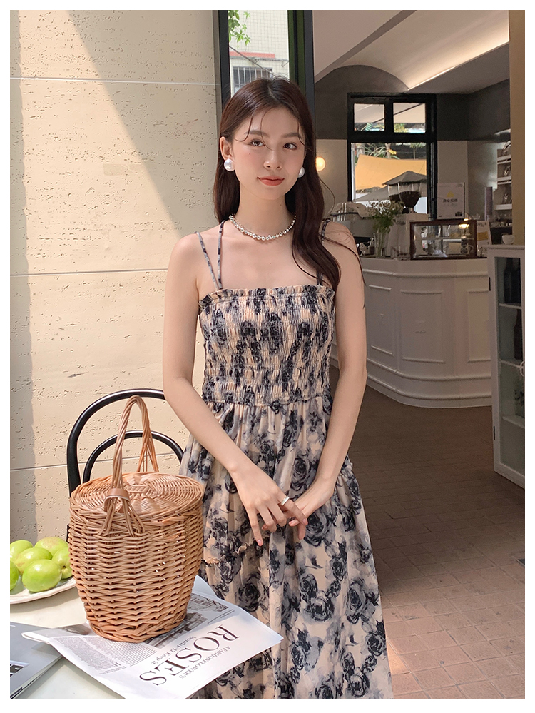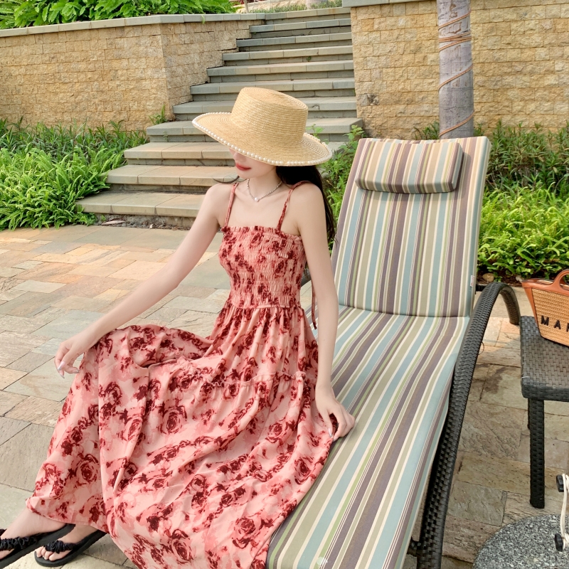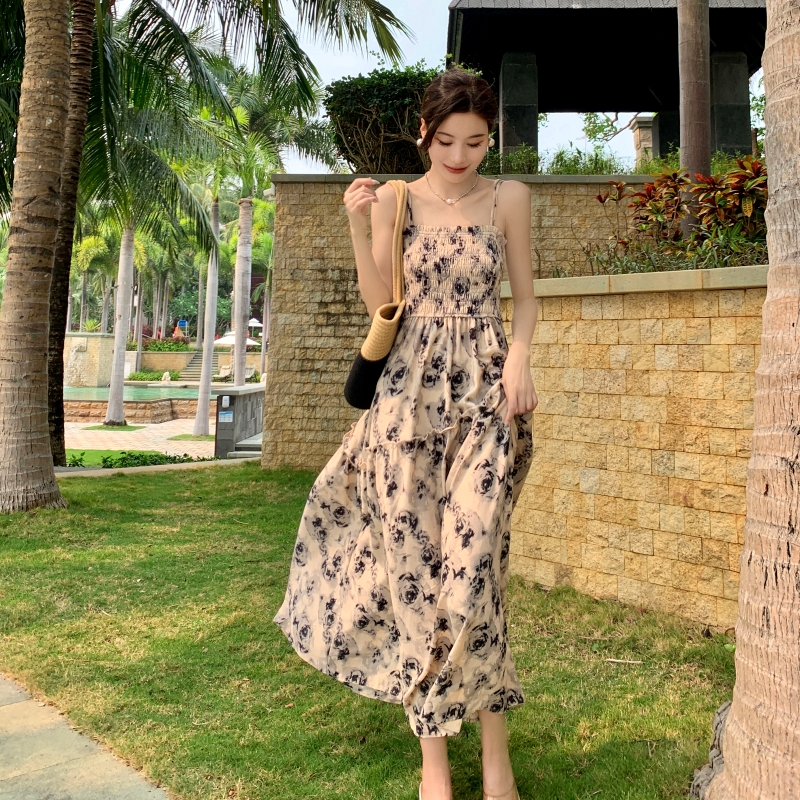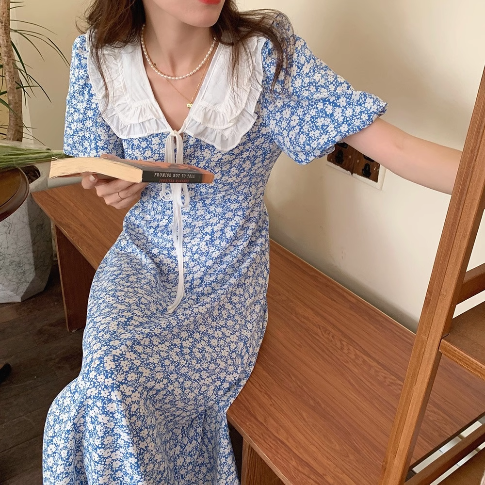 BX 뉴 원피스 여성 여름 쉬폰 플로럴 V 넥 타이트 허리 슬리밍 우아한 긴 무릎 위 A 자형 원피스스토어 가기