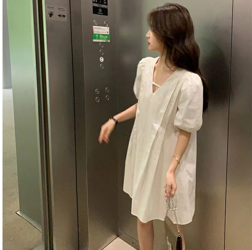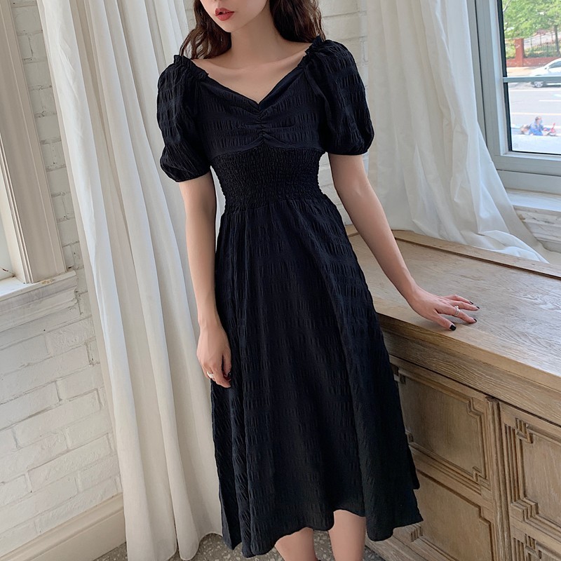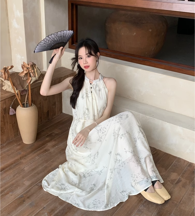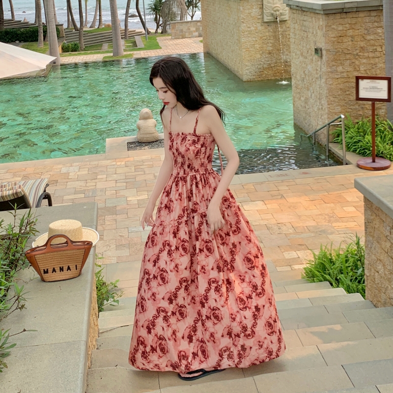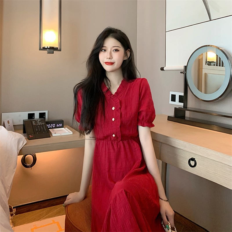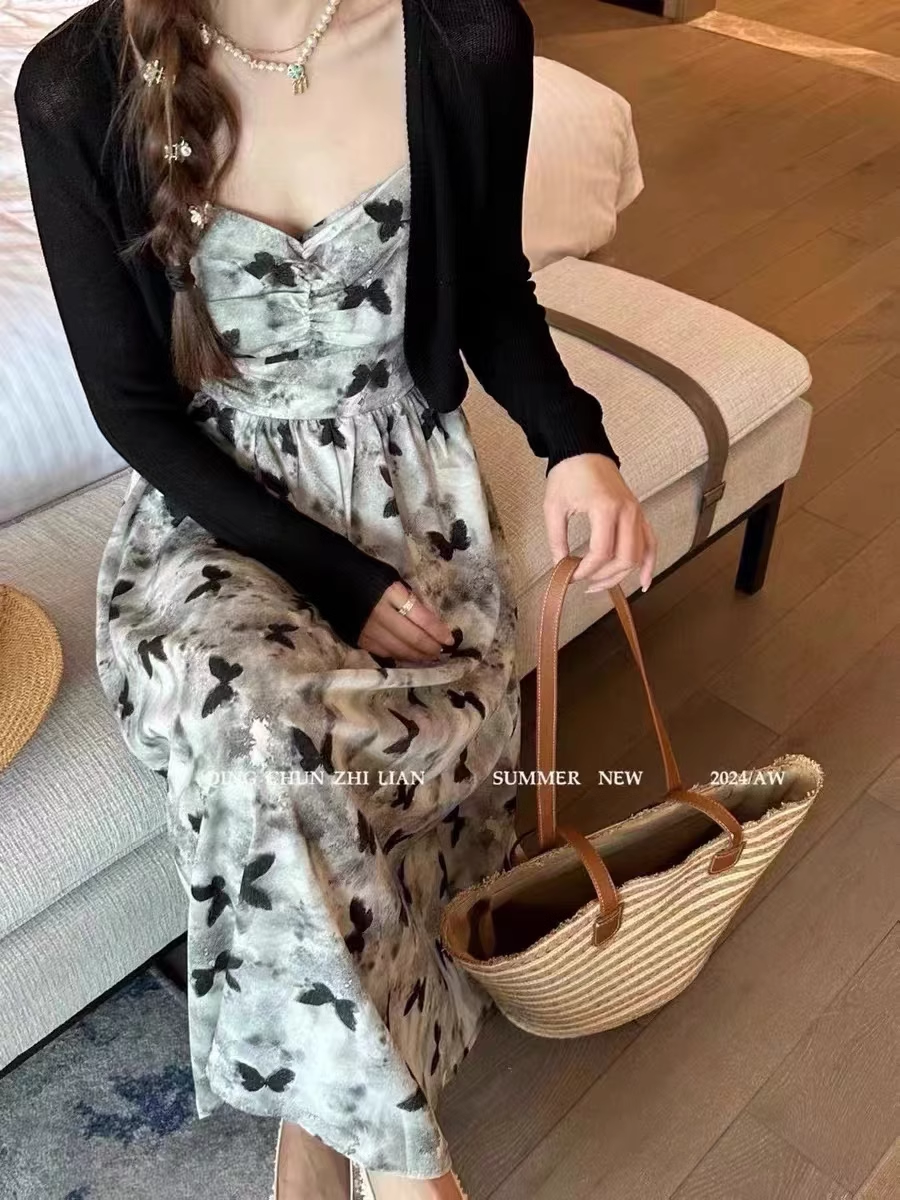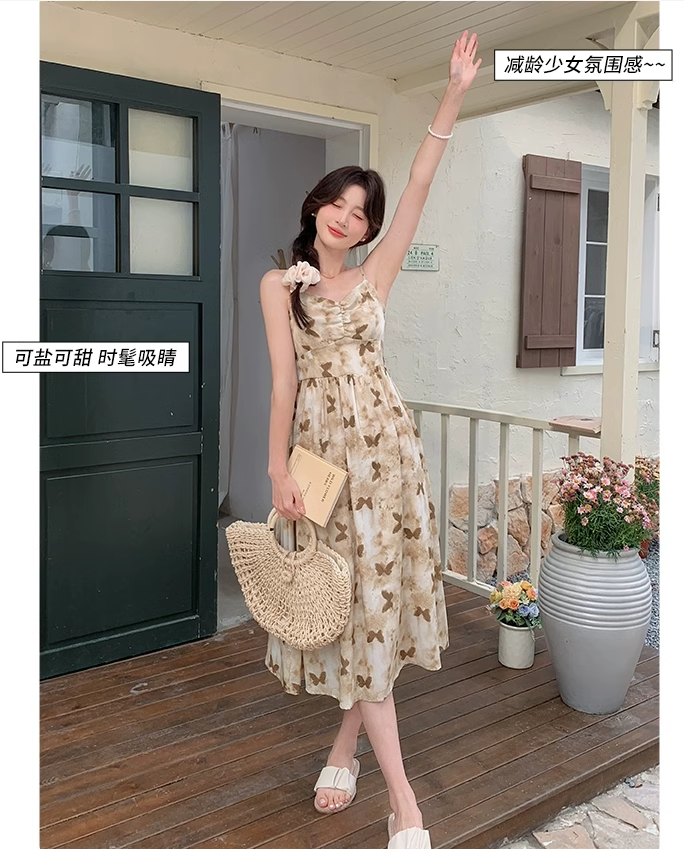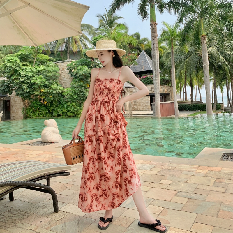 BX 뉴 원피스 여성 여름 쉬폰 플로럴 V 넥 타이트 허리 슬리밍 우아한 긴 무릎 위 A 자형 원피스스토어 가기