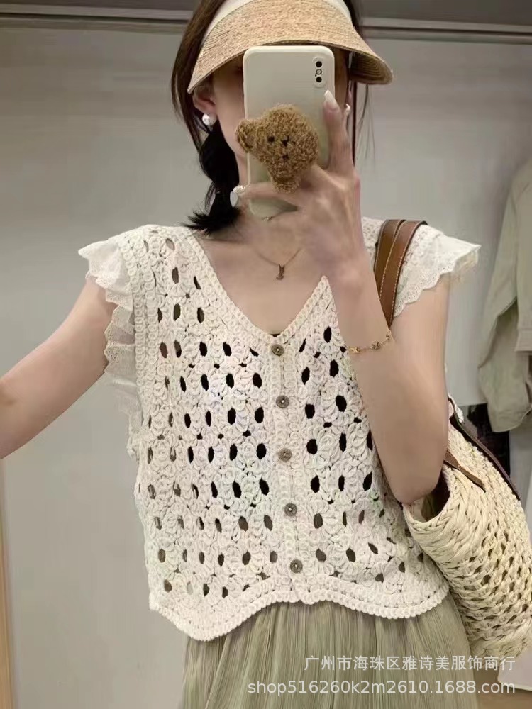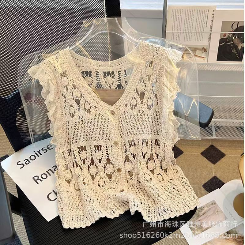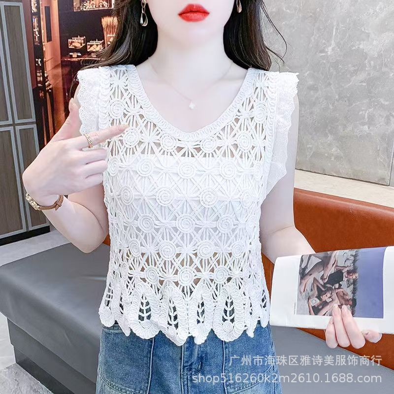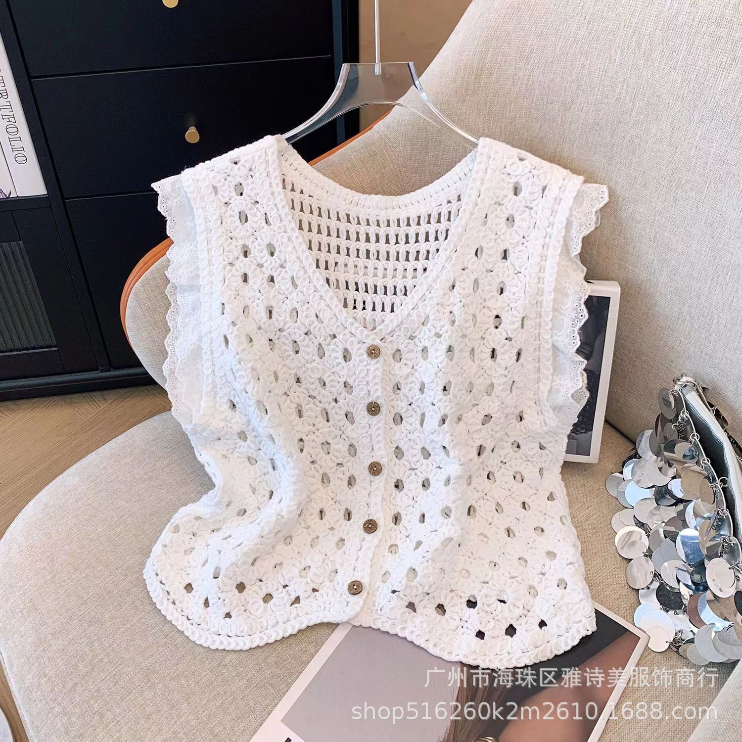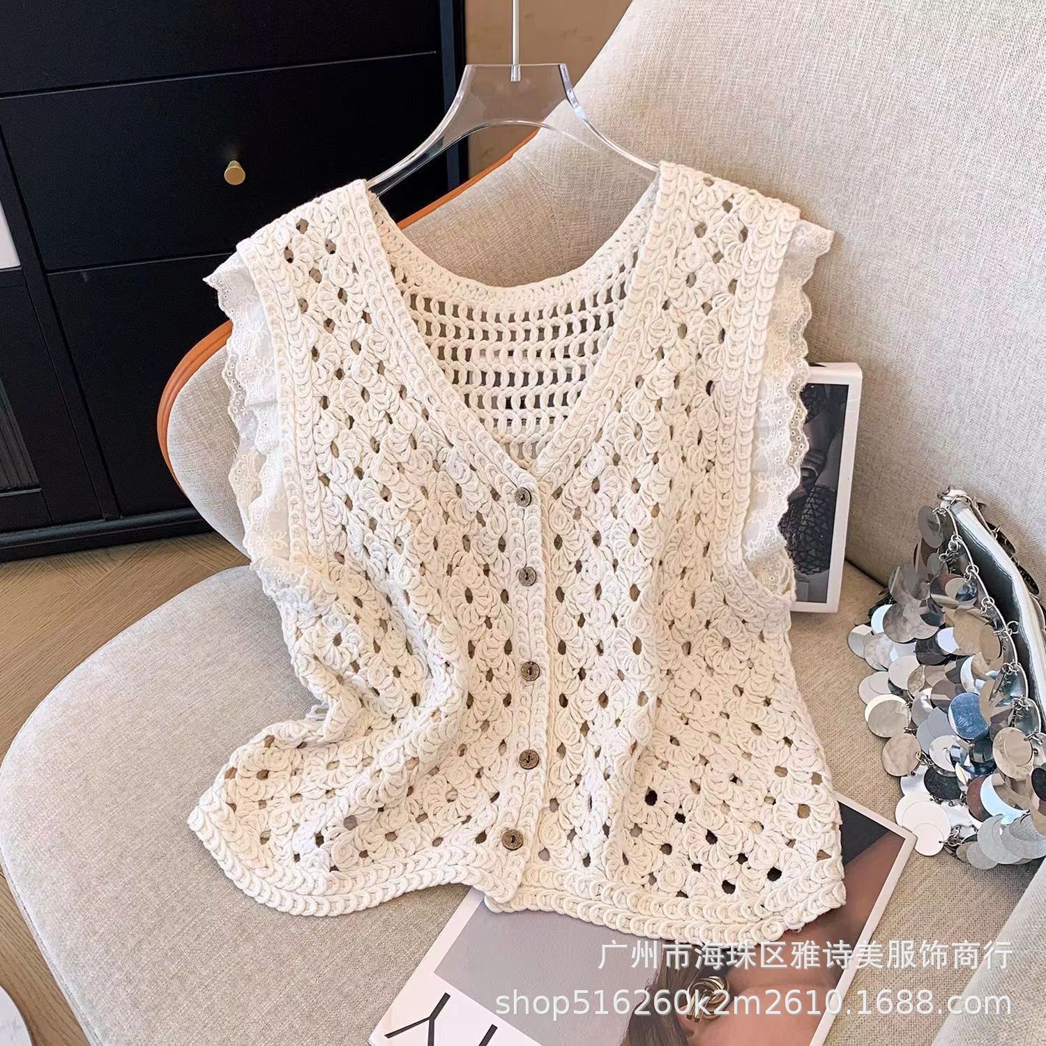 새로운 올 매치 캐주얼 할로우 크로 셰 뜨개질 레이스 V 넥 조끼 여자 여름 스위트 쇼트 탑