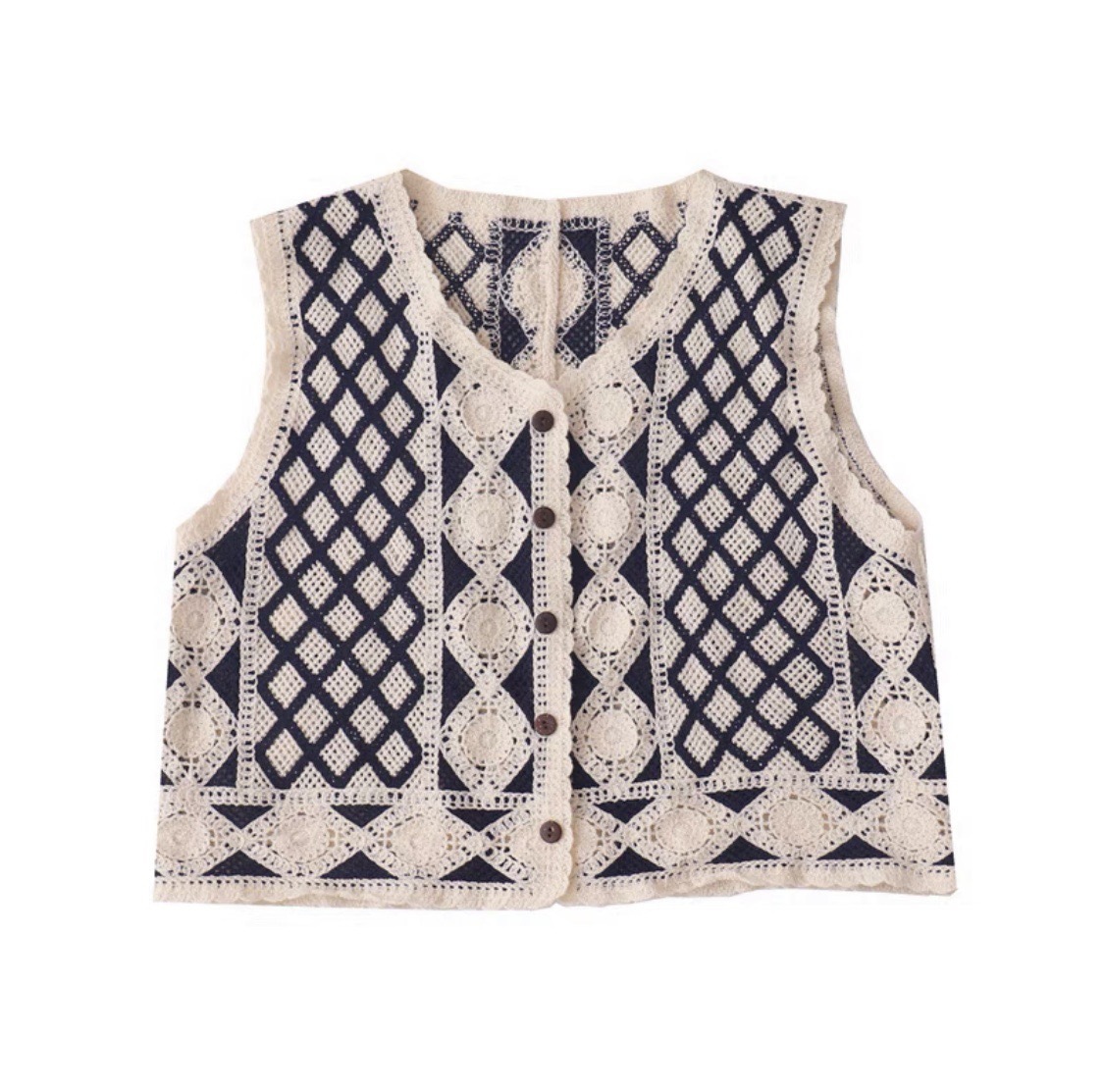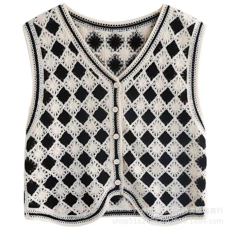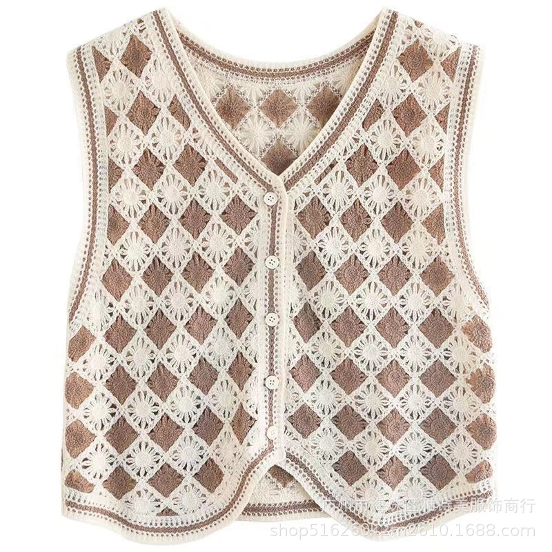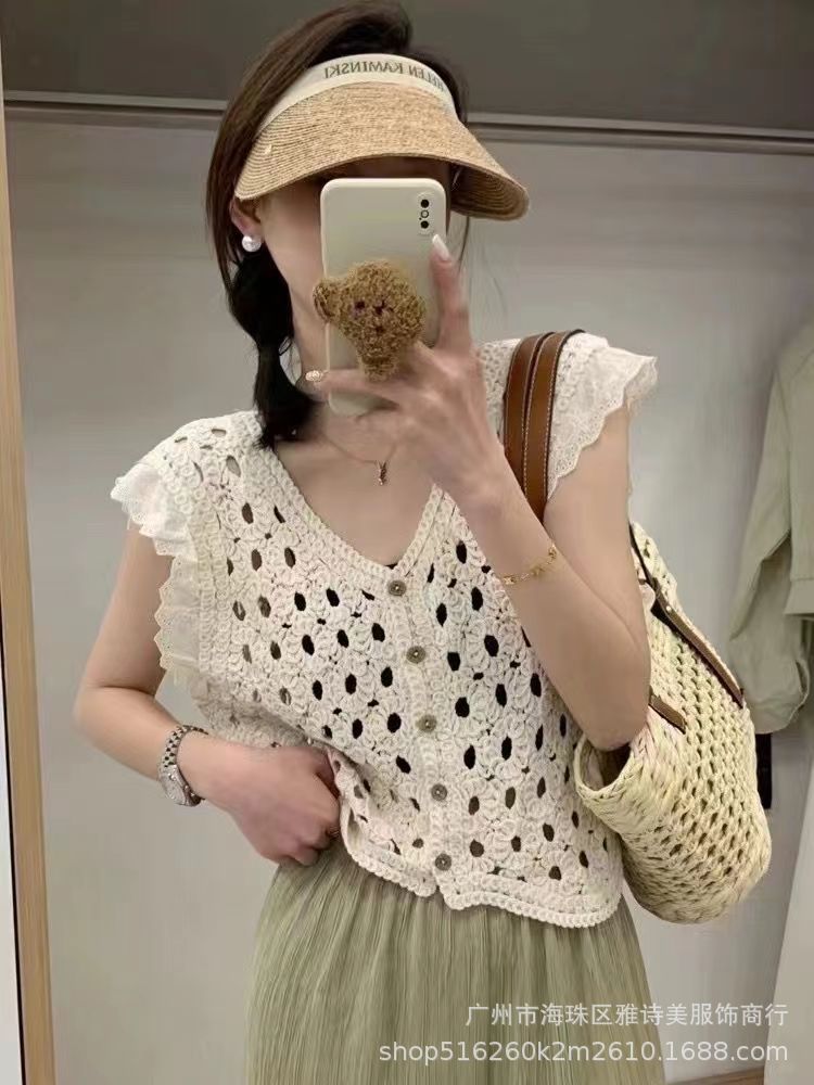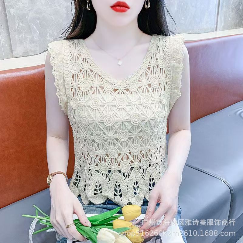 새로운 올 매치 캐주얼 할로우 크로 셰 뜨개질 레이스 V 넥 조끼 여자 여름 스위트 쇼트 탑