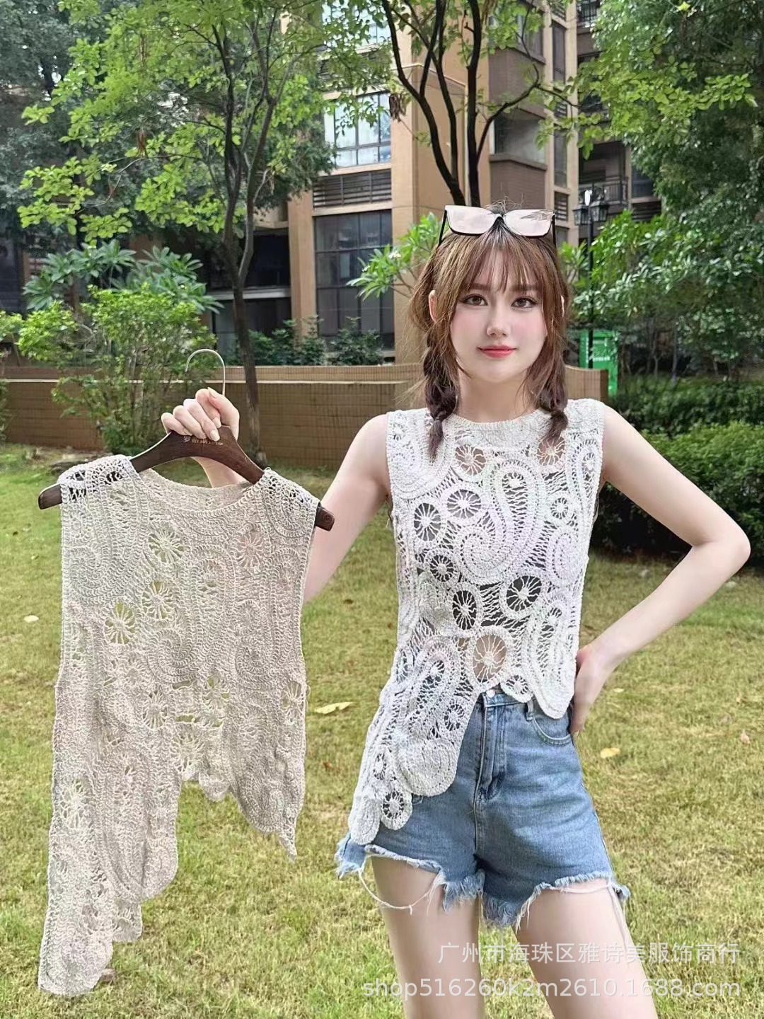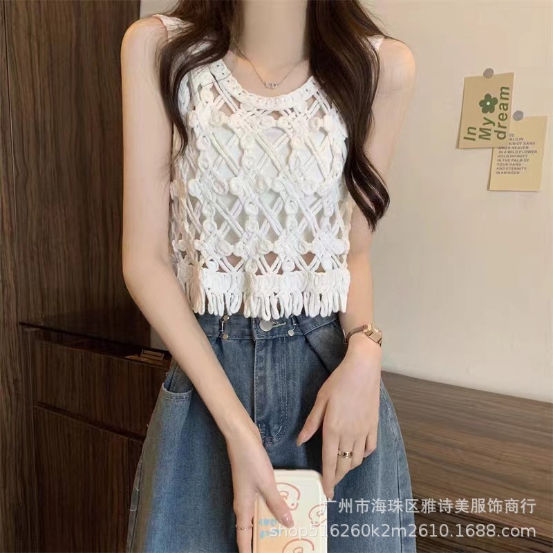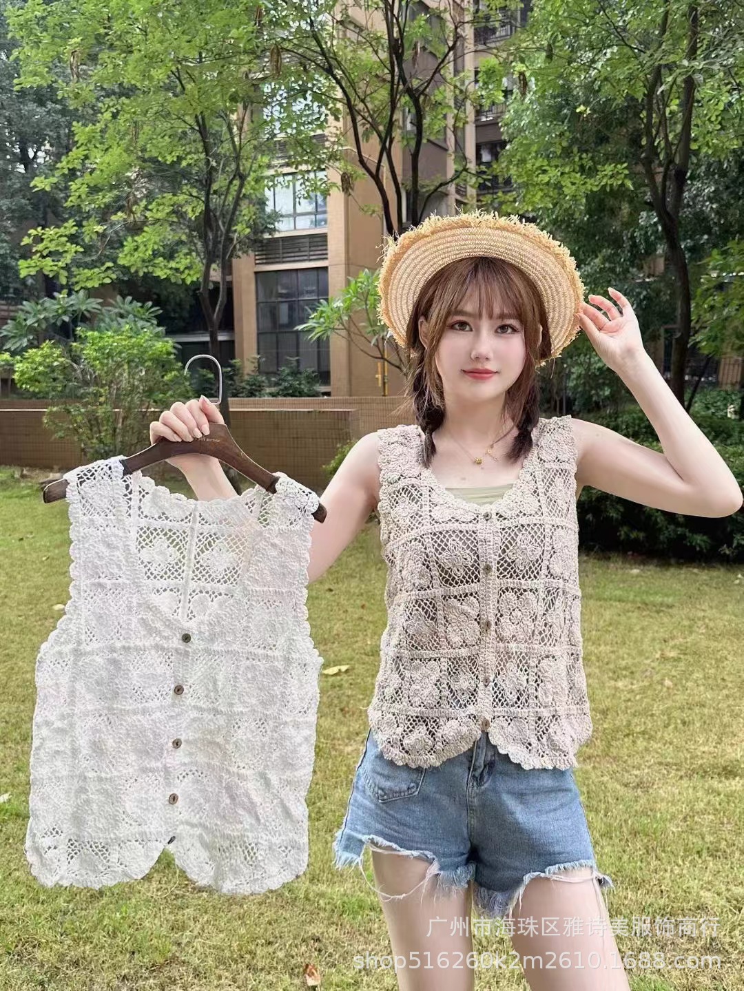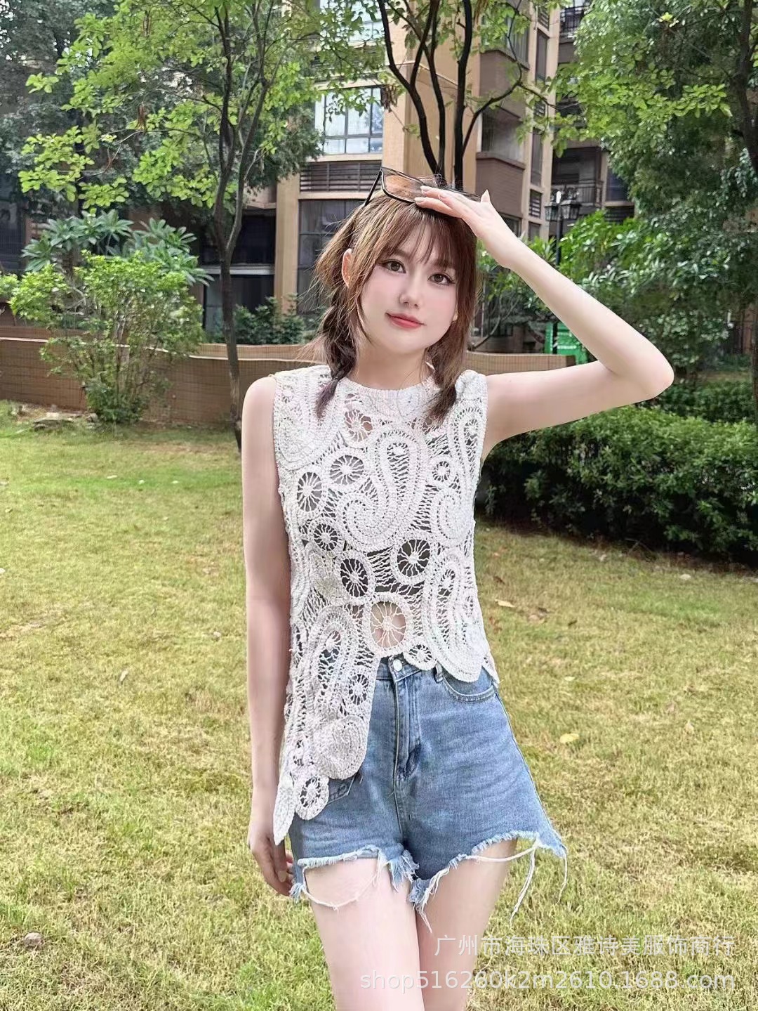 새로운 올 매치 캐주얼 할로우 크로 셰 뜨개질 레이스 V 넥 조끼 여자 여름 스위트 쇼트 탑스토어 가기