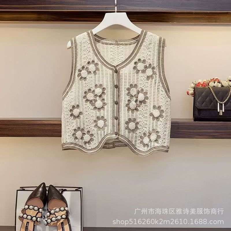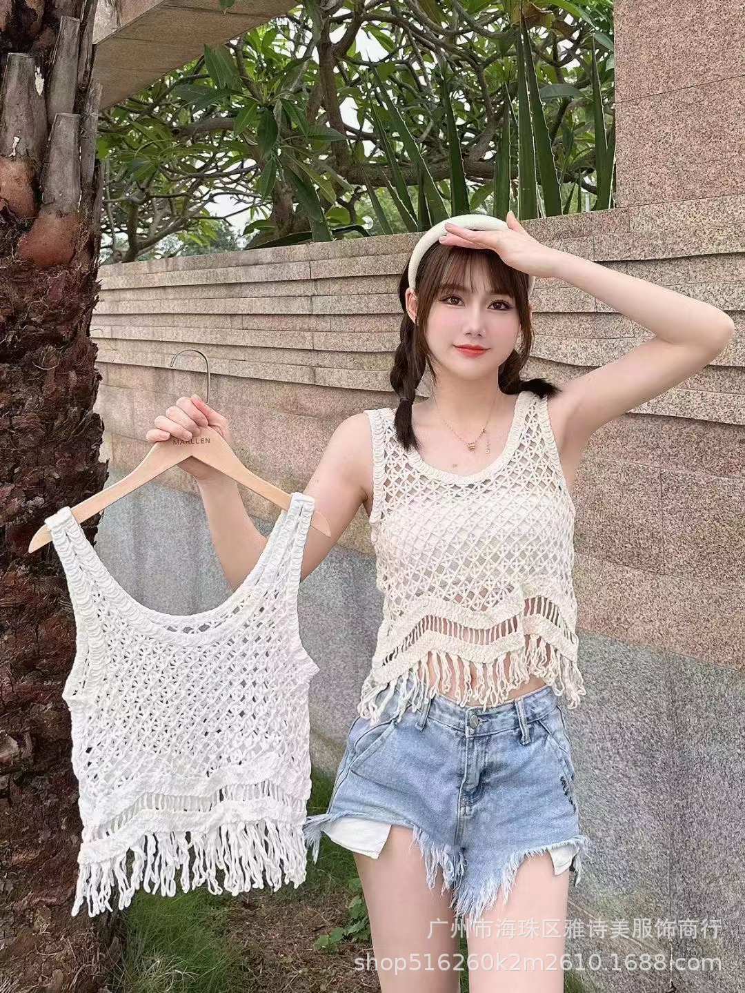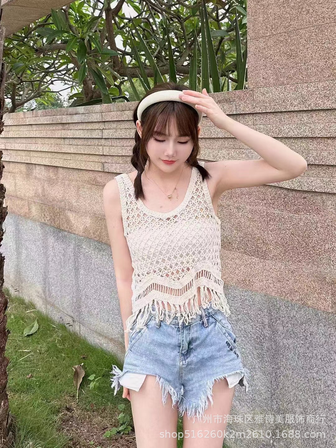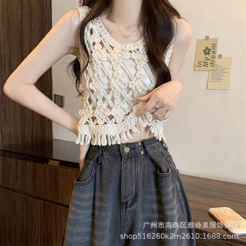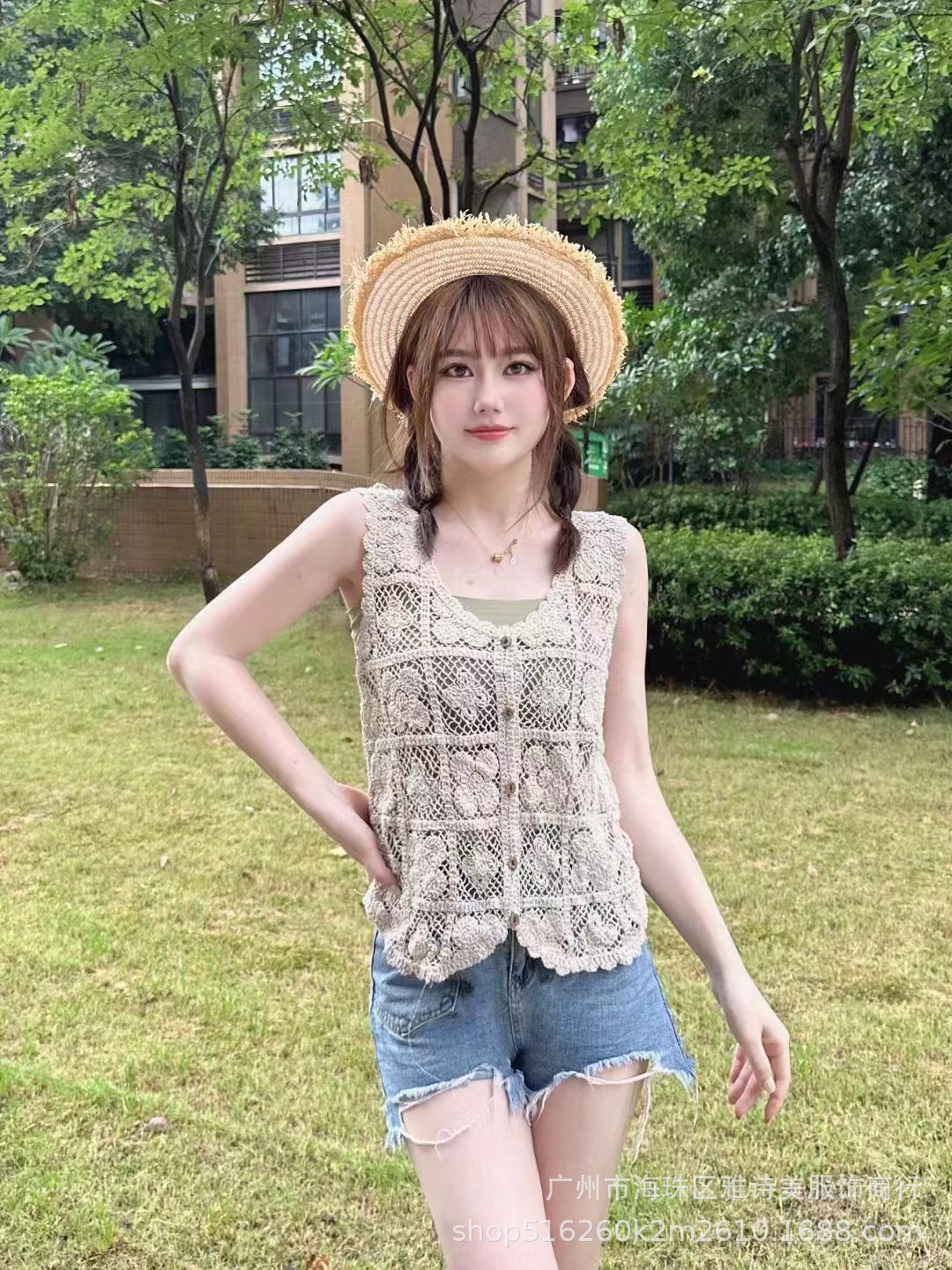 새로운 올 매치 캐주얼 할로우 크로 셰 뜨개질 레이스 V 넥 조끼 여자 여름 스위트 쇼트 탑스토어 가기