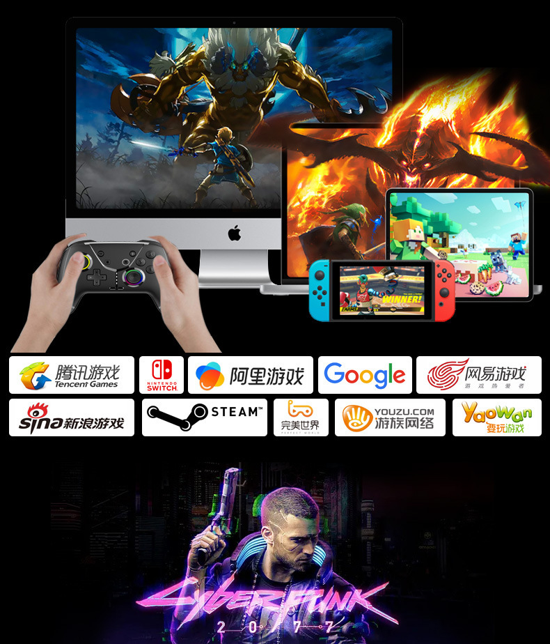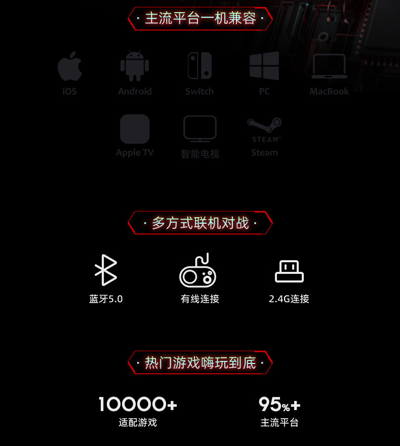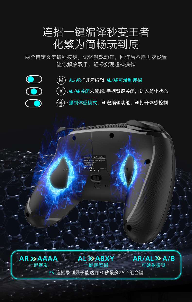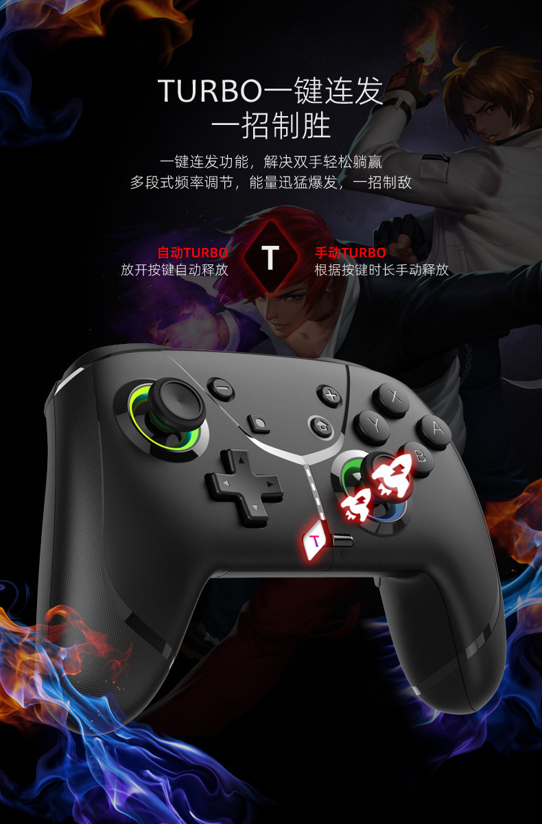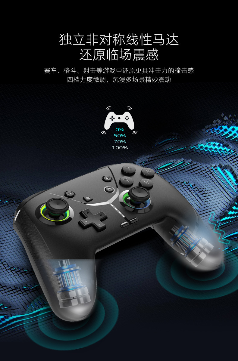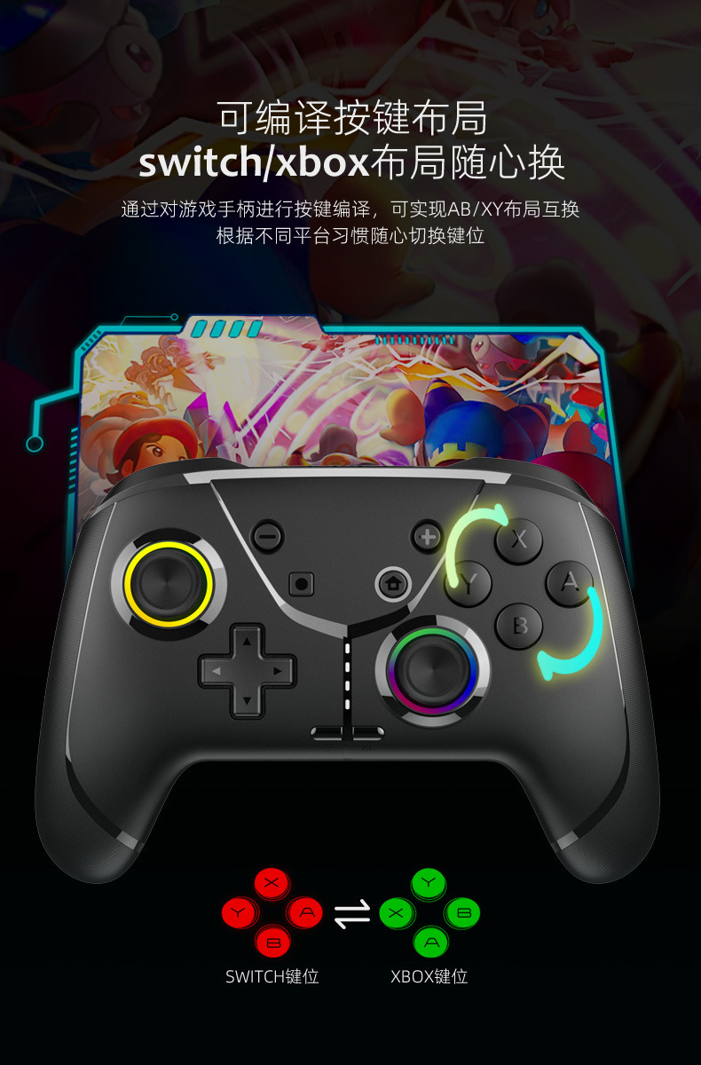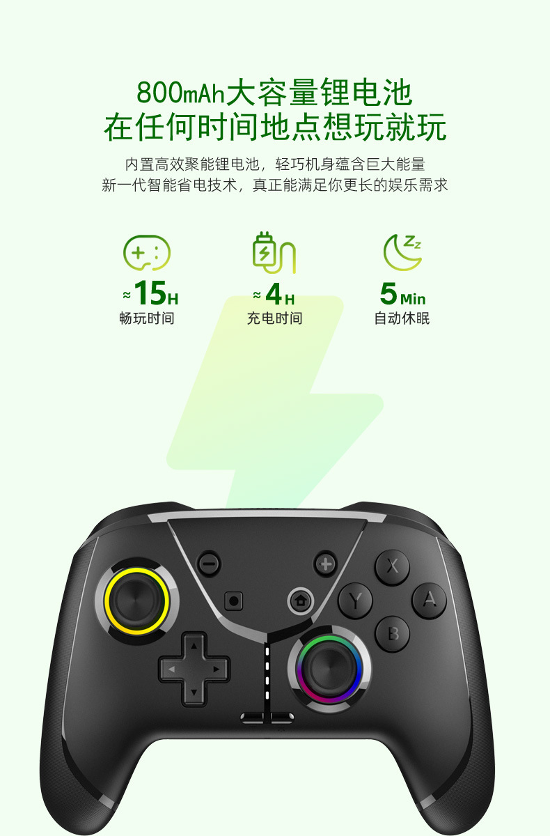 蓝牙连接:手柄可以连接具有蓝牙功能的 SWITCH 主机,手机,平板,电视,盒子等;