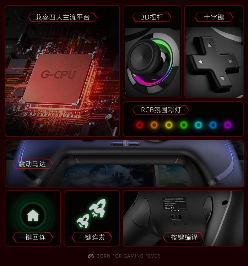 8、 支持 2.4G 连接模式(XINPUT/XBOX360模式,DINPUT模式);