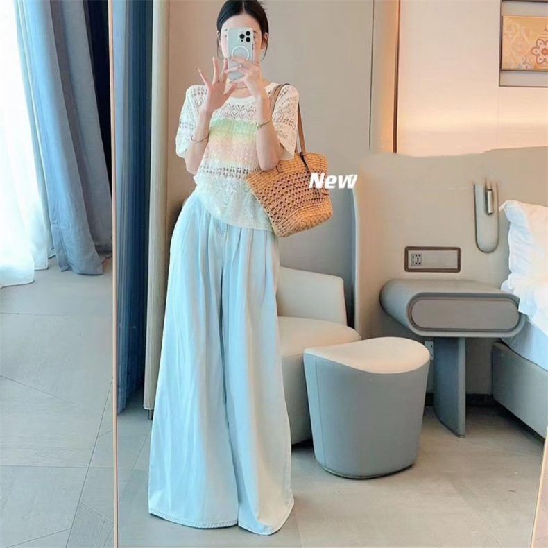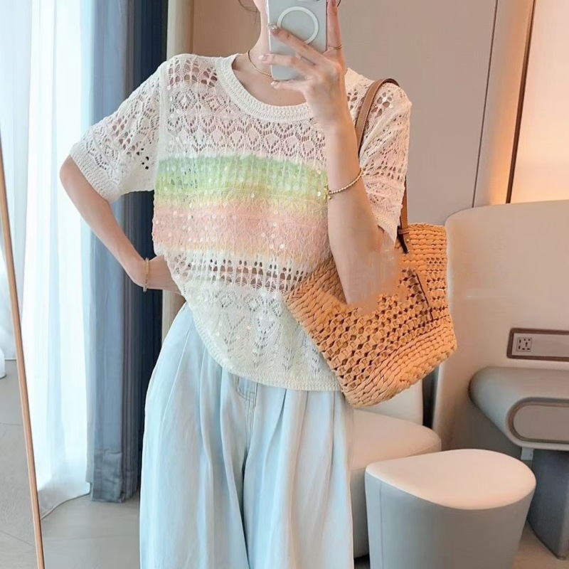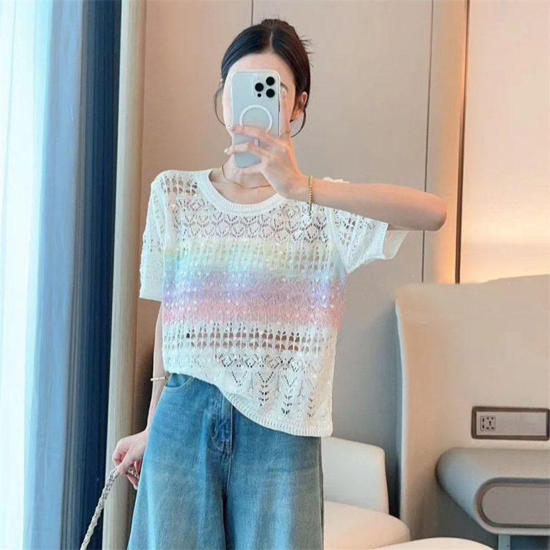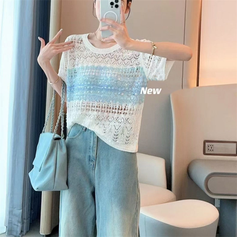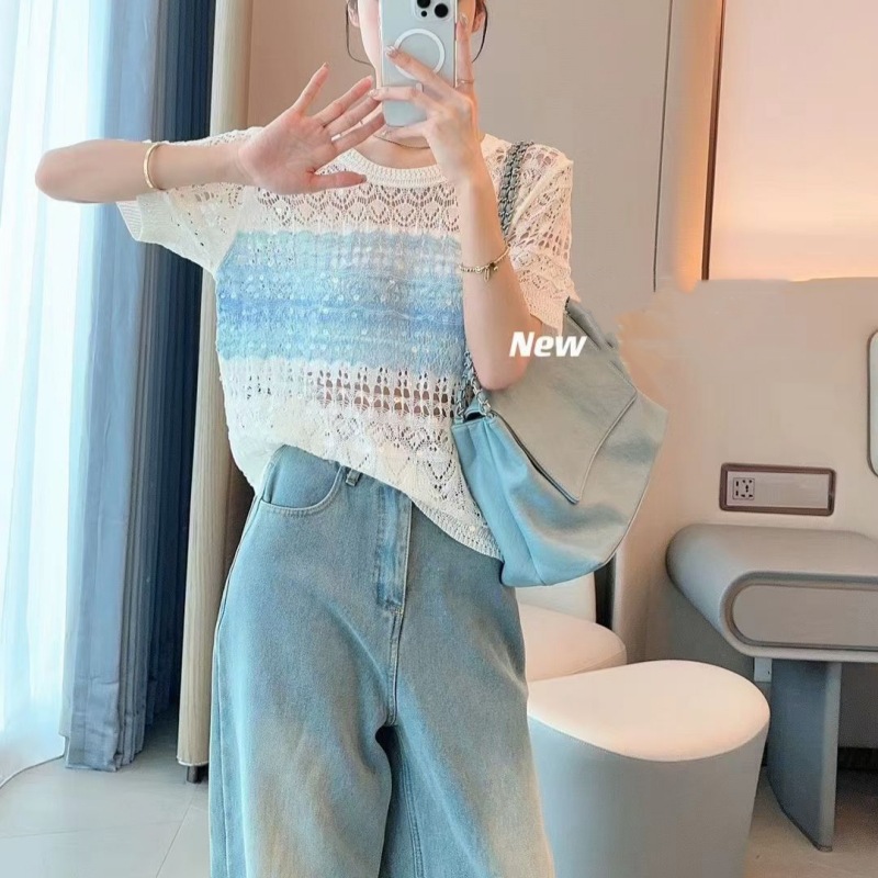 그라디언트 아이스 실크 짧은 소매 니트 스웨터 여성의 2024 여름 새로운 할로우 짧은 소매베이스 셔츠 얇은 티셔츠 탑