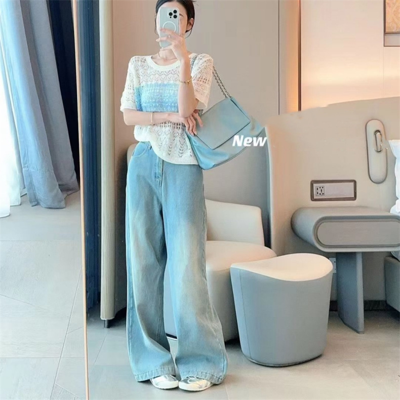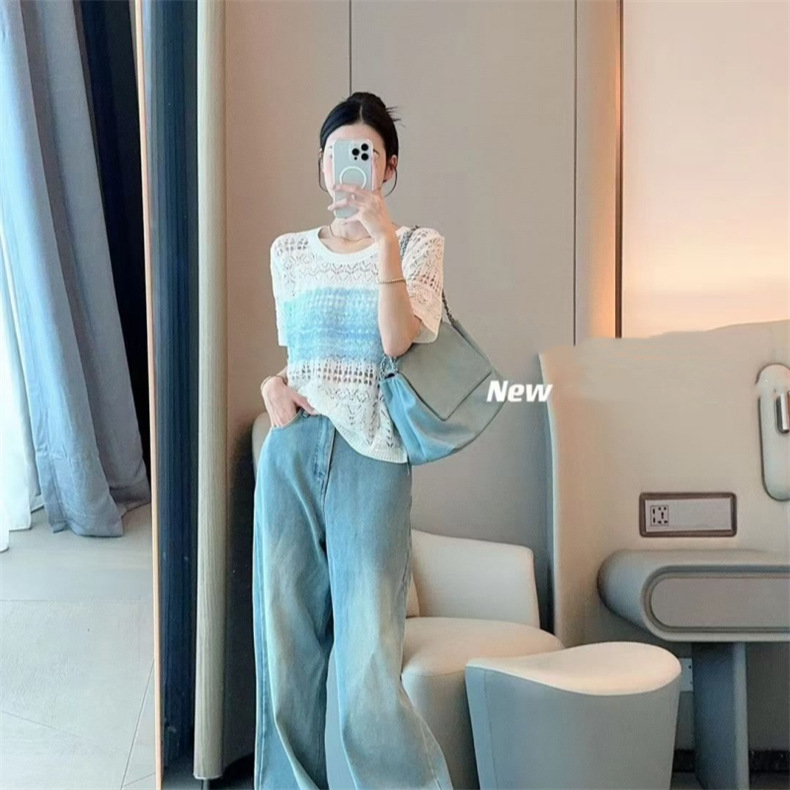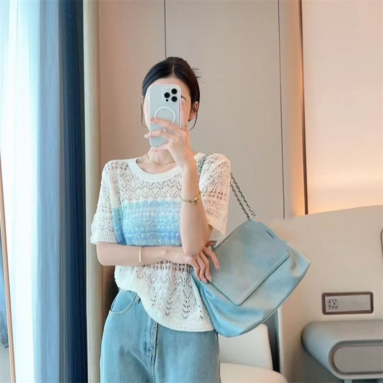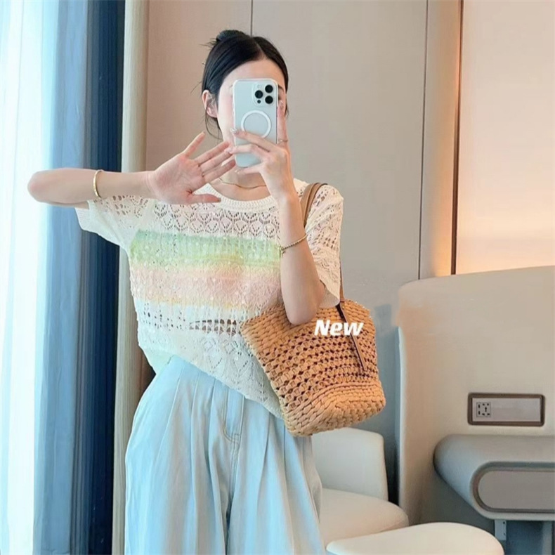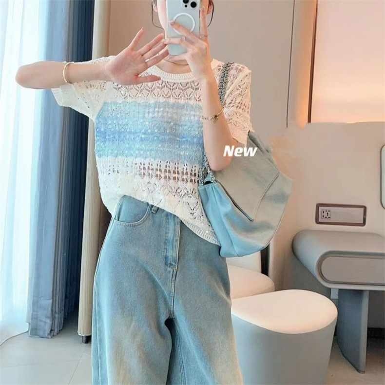 그라디언트 아이스 실크 짧은 소매 니트 스웨터 여성의 2024 여름 새로운 할로우 짧은 소매베이스 셔츠 얇은 티셔츠 탑스토어 가기