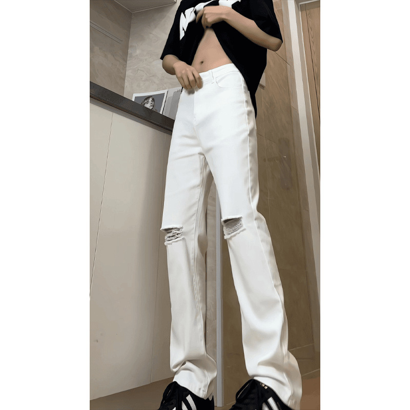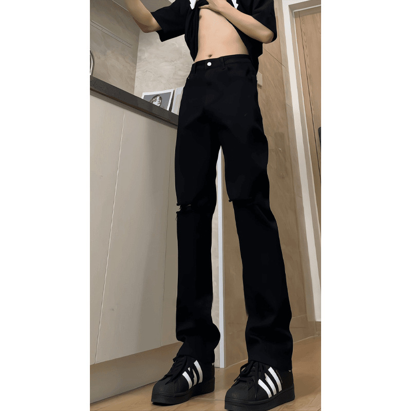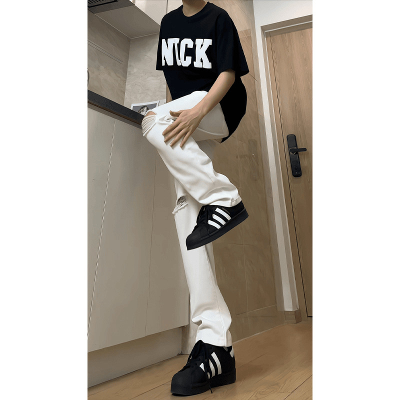 아메리칸 스타일 하이 스트리트 바이브 스타일 바지 남성 여름 세탁 된 찢어진 청바지 얇은 트렌디 브랜드 스트레이트 바지스토어 가기