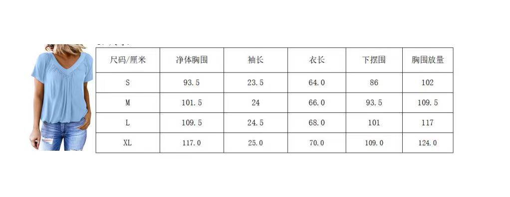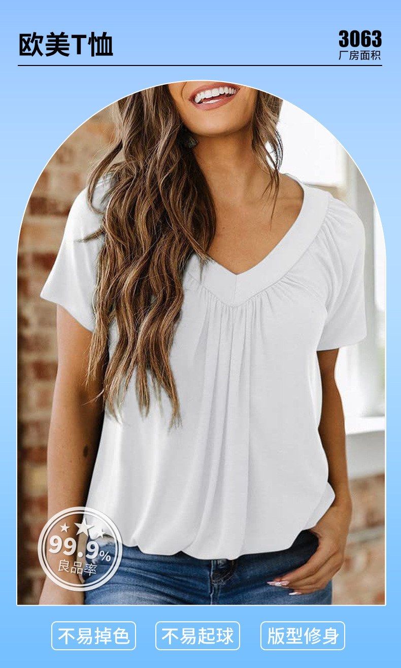 국경 간 무역 유럽과 미국 아마존 여성 티셔츠 새로운 캐주얼 주름 단색 V 넥 짧은 소매 티셔츠 여성용 루즈스토어 가기
