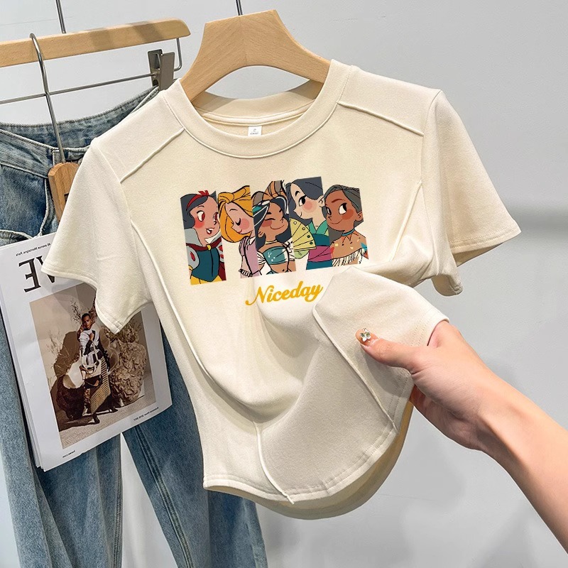 어깨 플러스 사이즈 반팔 티셔츠 여성의 2024 새로운 슬림 핏 만화 연령 감소 착용 달콤하고 뜨거운 불규칙한 탑 여름복스토어 가기
