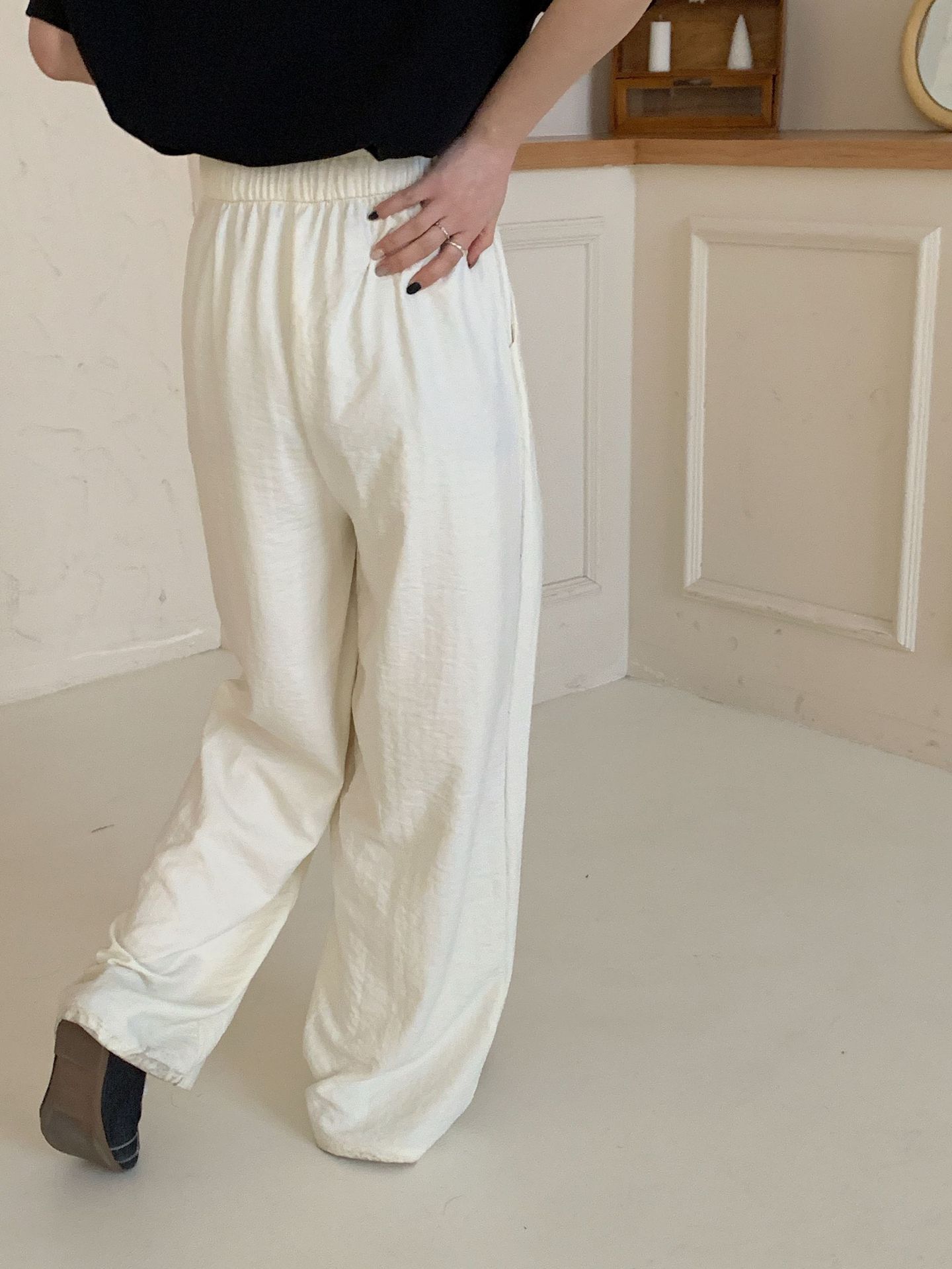 여성용 쁘띠 바디 슬리밍 와이드 레그 야마모토 팬츠 크림 무스 팬츠 아세트산 에어 팬츠