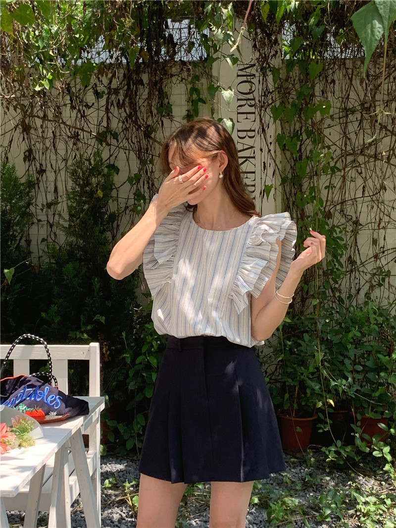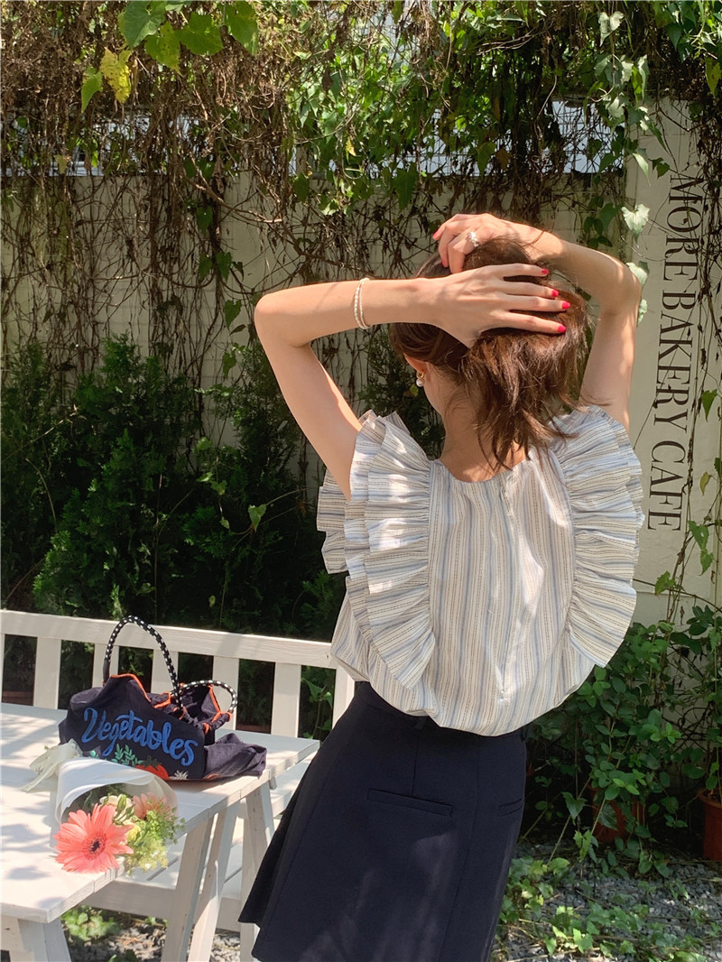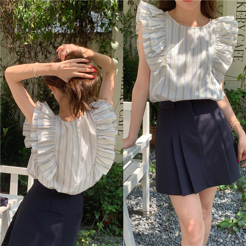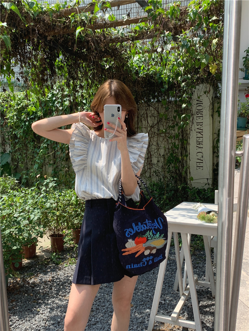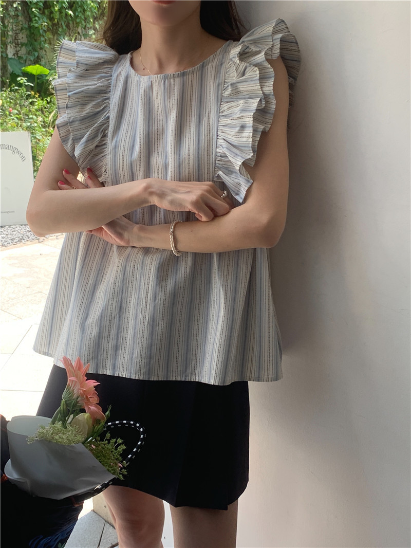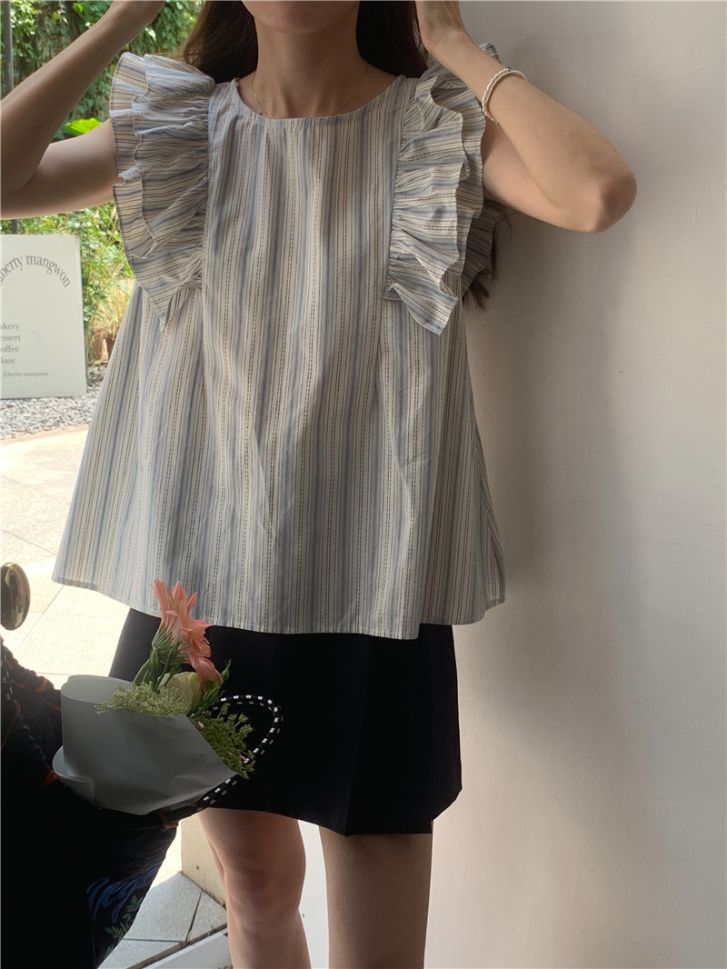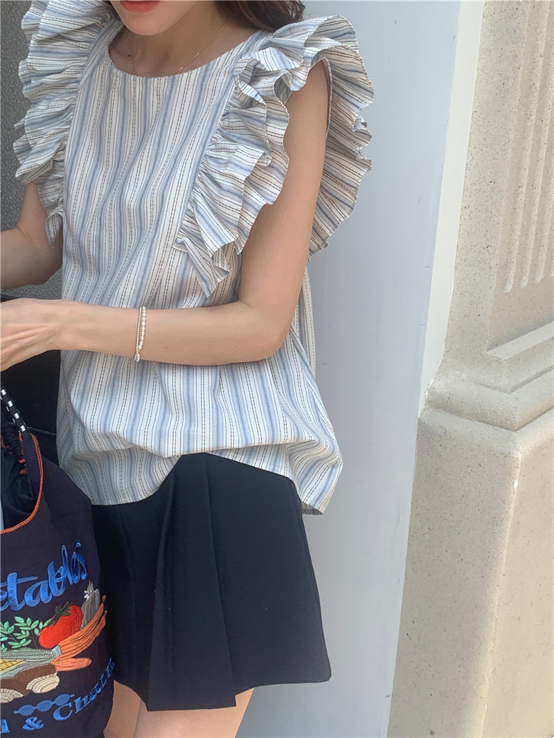 한국어 버전의 달콤한 작은 플라잉 슬리브 라운드 넥 풀오버 반팔 셔츠 여성 2025 여름 새 스타일스토어 가기