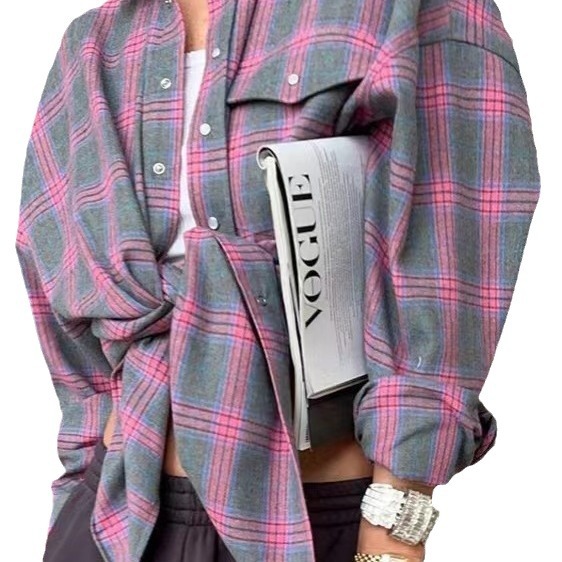 2024 봄과 가을 아마존 오존 크로스 보더 레트로 스타일 올 매치 루즈 셔츠 * 패션 올 매치 체크 무늬 셔츠 여성