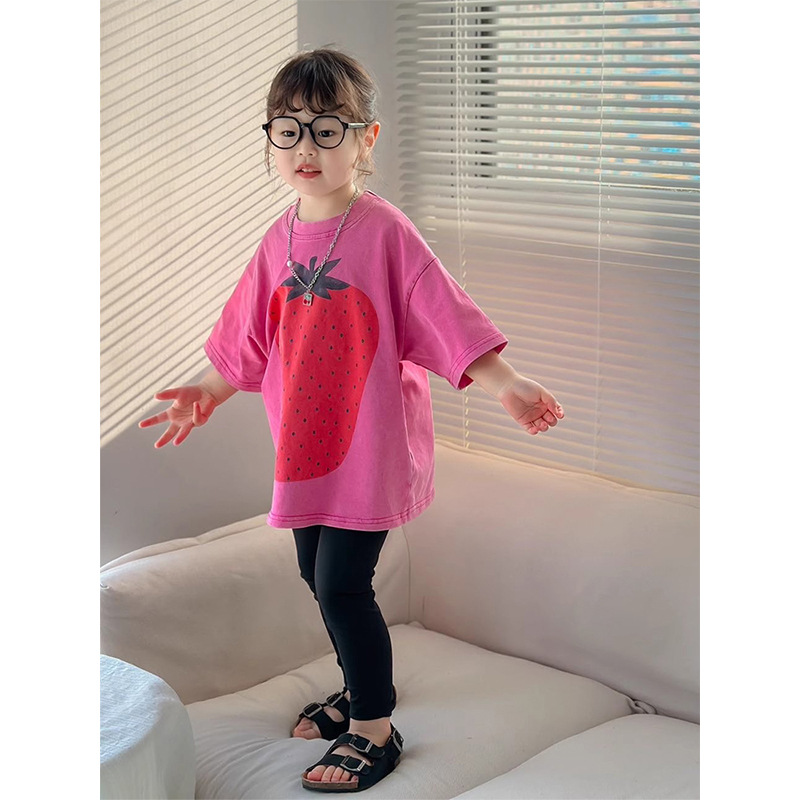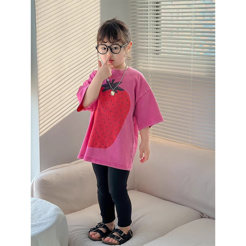 여자 여름 폭발 캐주얼 세트 어린이 아기 딸기 인쇄 반팔 티셔츠 검은 상어 바지 투피스 세트스토어 가기
