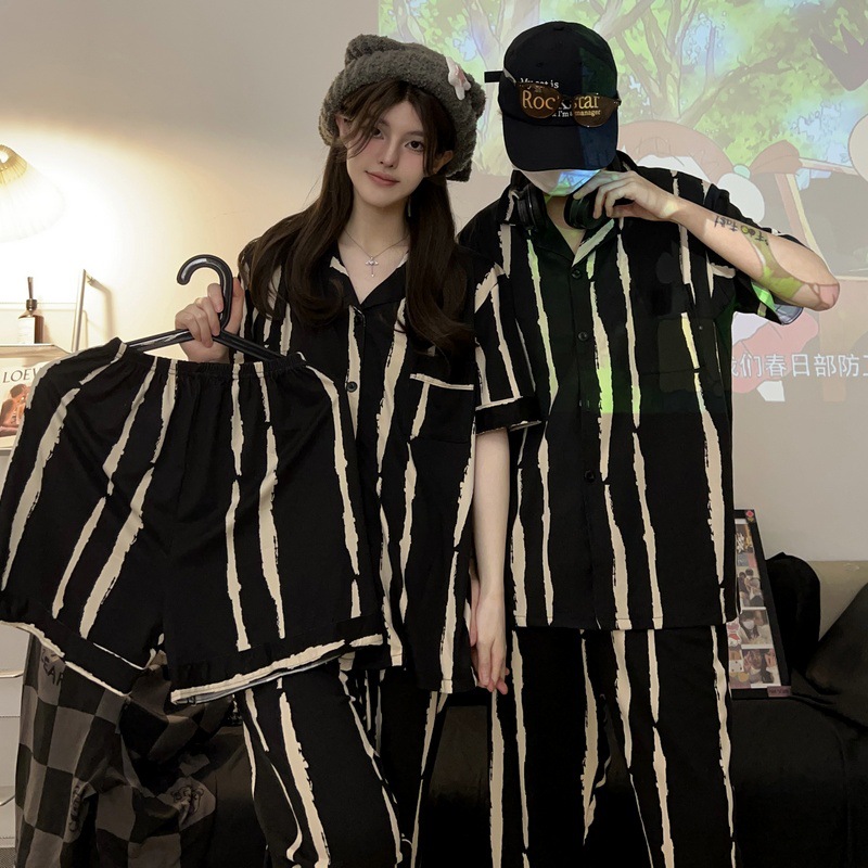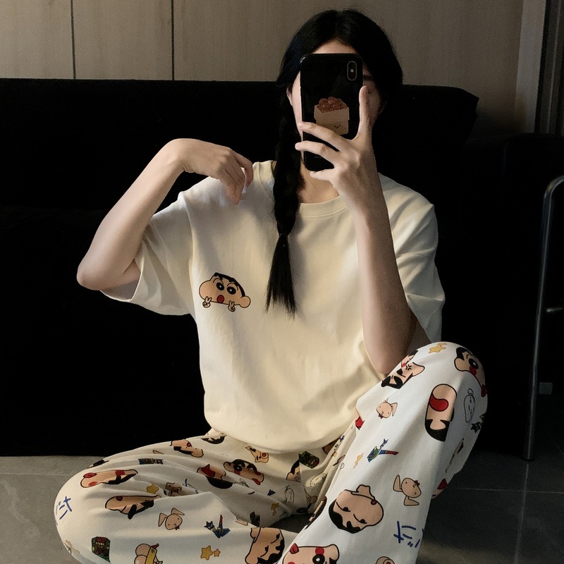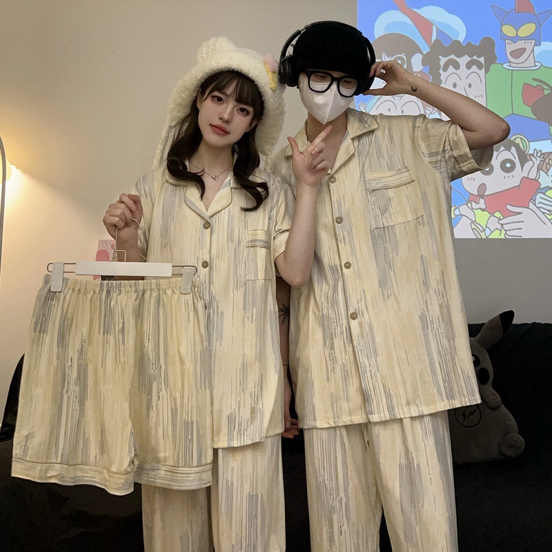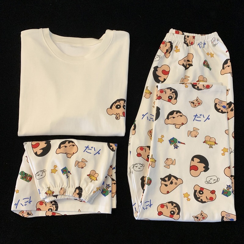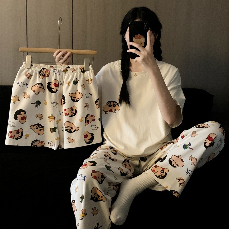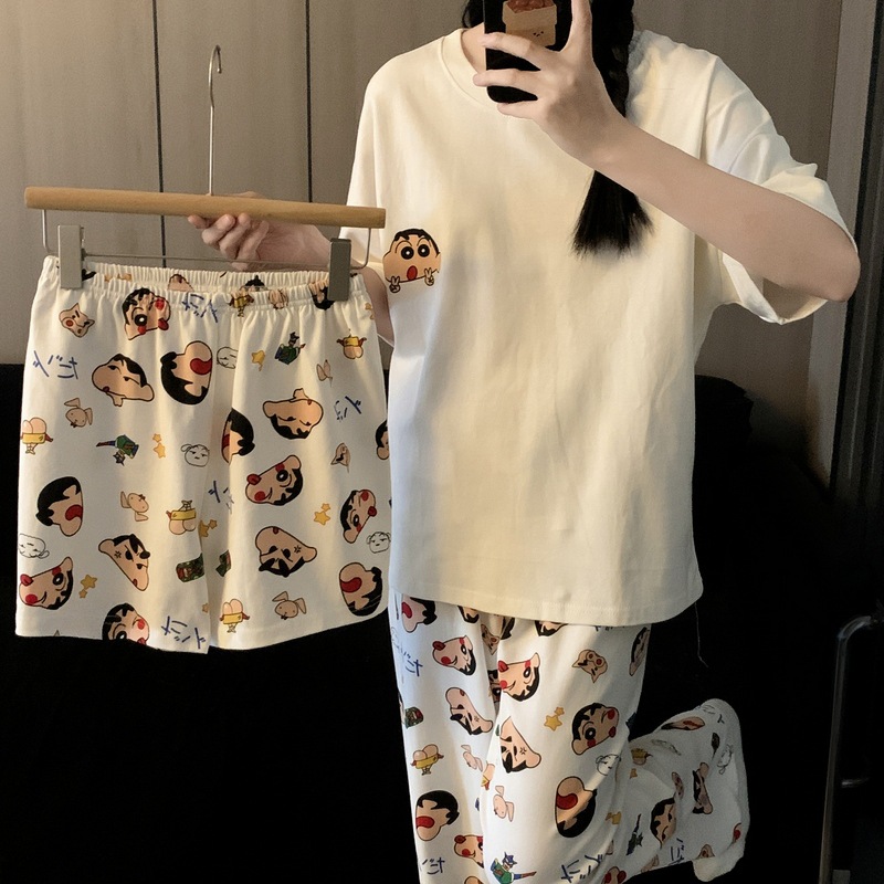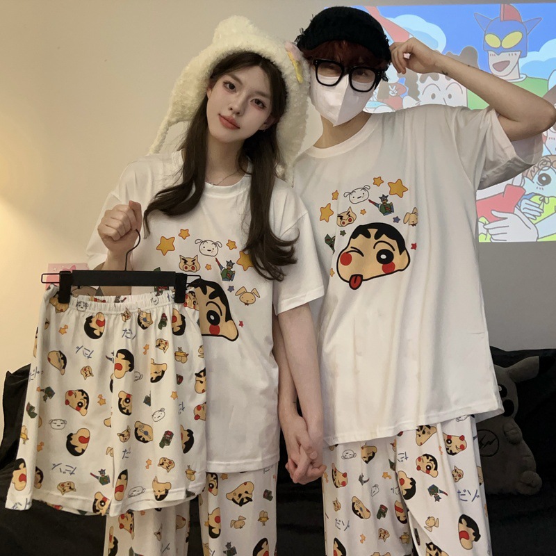 재고 도매 커플 파자마 여성용 둥근 목 크레용 작은 새 봄과 가을 헐렁한 홈 의류 짧은 소매 여름 3 피스 세트
